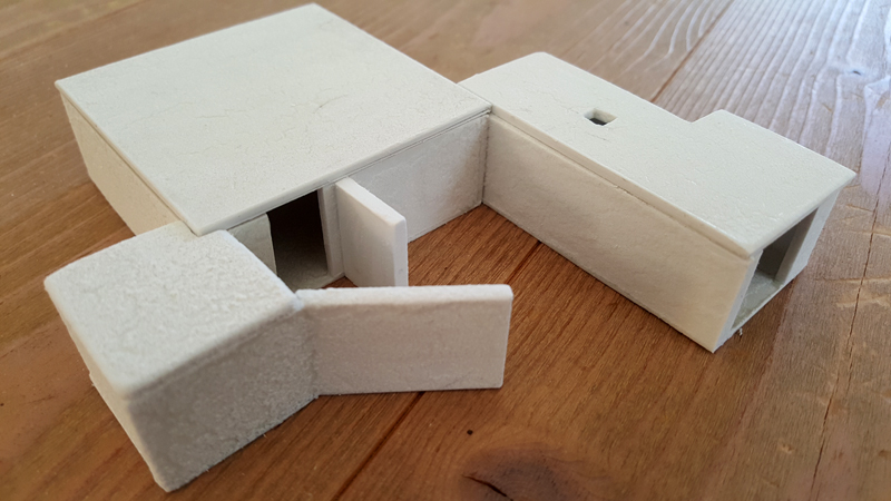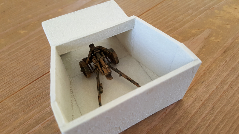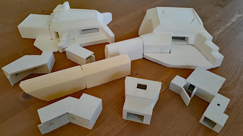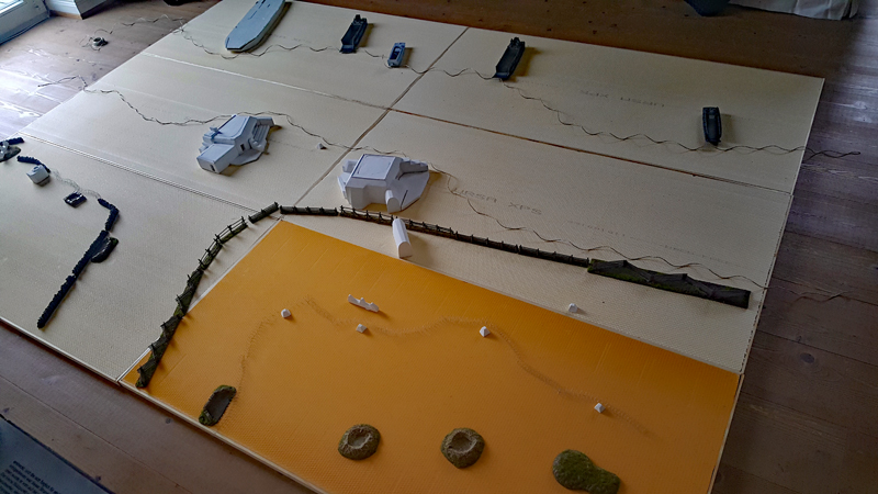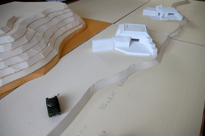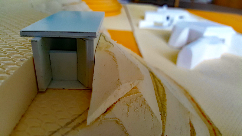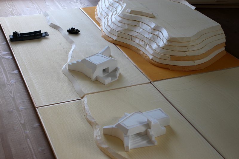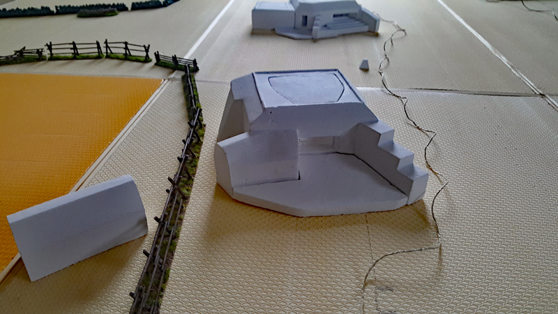 Dann folgte die grobe Ausarbeitung des Geländes, also vor allem die der Steilküste und des Plateaus. Die beiden großen Kasematten des WN 72 hatte ich bereits vor Jahren günstig bei einer Sammlungsauflösung erstanden. Die Modelle stammen von der französische Firma PN SUD MODÉLISME (https://pnsudmodelisme.com/). Die restlichen Bunkeranlagen, die B-Stelle, die 2 Doppel-MG-Stände, den großen Unterstand von WN 71 sowie die Kasematte von WN 73 habe ich aus Polystyrolplatte zusammengebastelt und grob in die Geländeplatten eingearbeitet.
