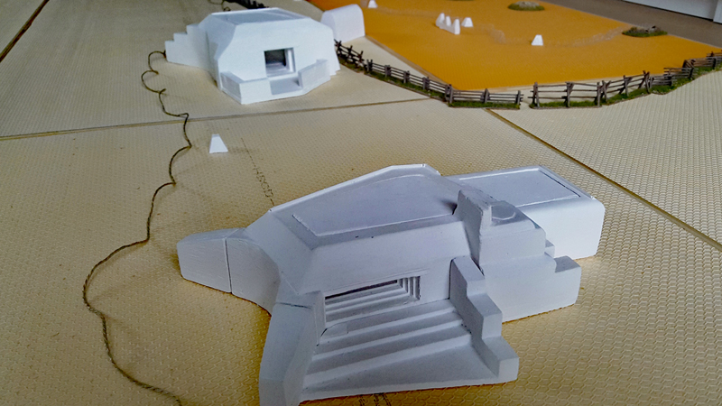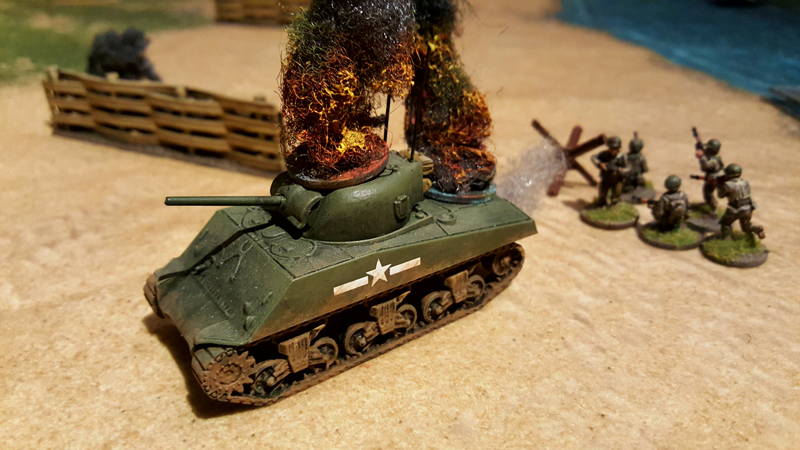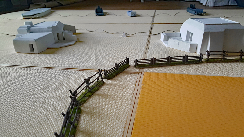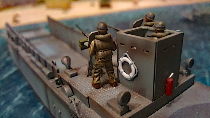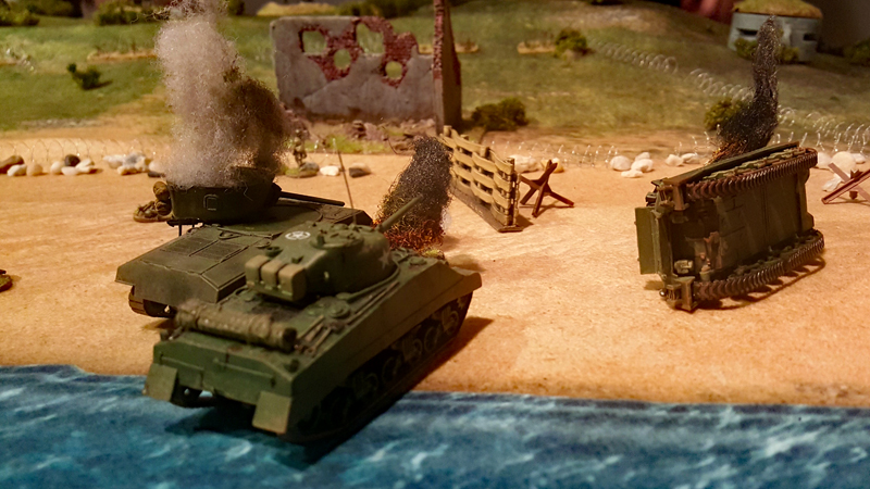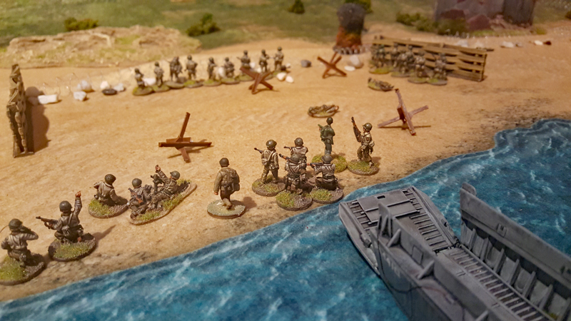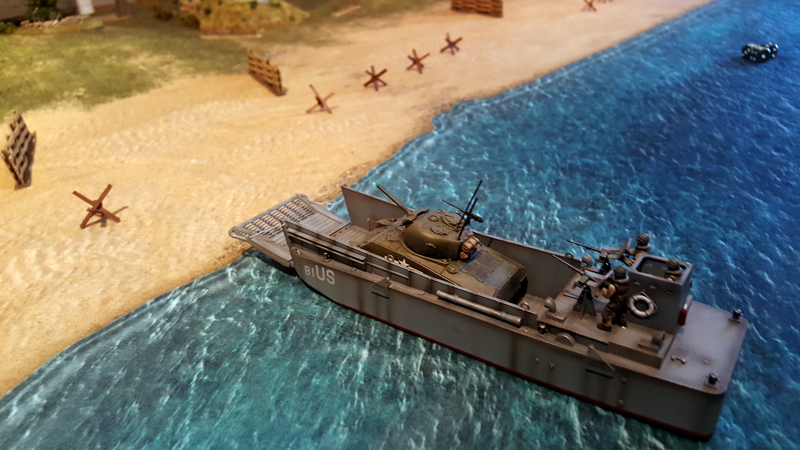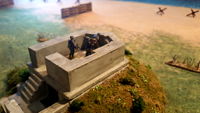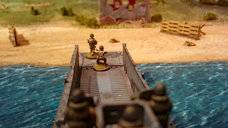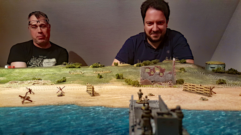 Bei einem ersten Treffen vor ein paar Wochen haben wir das Ganze grob geplant, Aufgaben verteilt und auch schon zwei Testspiele absolviert. Als provisorische Spielplatte für die Testspiele dienten eine gekaufte Matte sowie ein paar generische Geländeteile und Bunker. Einige Landungsboote und Figuren hatte wir zum Glück bereits bemalt. Getestet haben wir die Landung eines GAP-Teams und eines Assault-Boat-Teams mit Panzerunterstützung. Es ging uns vor allem darum, die vielen Sonderregeln zu verinnerlichen und zu bewerten. Bei den geplanten Szenarien auf der großen Platte soll dann nicht die komplette Landung nachgespielt werden, sondern nur einzelne Abschnitte, bei denen kleinen Teams bestimmte Aufgabe, wie das Räumen von Hindernissen oder das Ausschalten von Bunkern, zum Ziel haben.