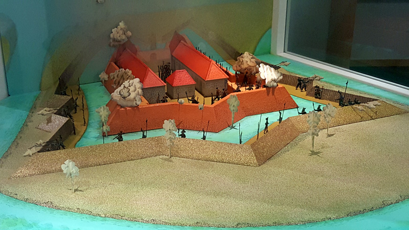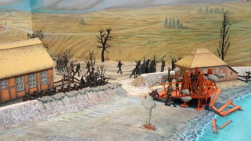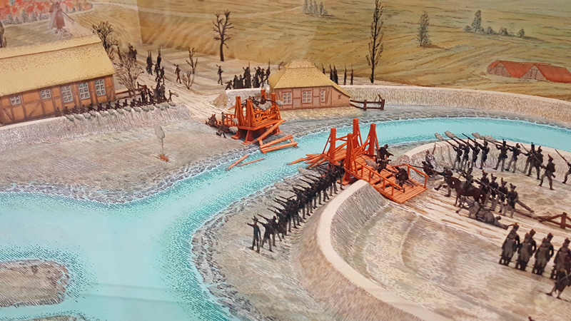So gelang es schließlich einigen Franzosen, gedeckt durch das Feuer der am Ufer der Geeste stehenden Infanterie, schwimmend das andere Ufer zu erreichen. Die Franzosen schafften es, die Zugbrücke herunterzulassen, während weitere Soldaten auf den Brückenbalken balancierend dazustießen. Gemeinsam legten sie die Bretter des Fahrweges wieder über das Brückengestell und sofort rückte die Infanterie geführt von ihrem Kommandanten (Chack?) über die Geeste.