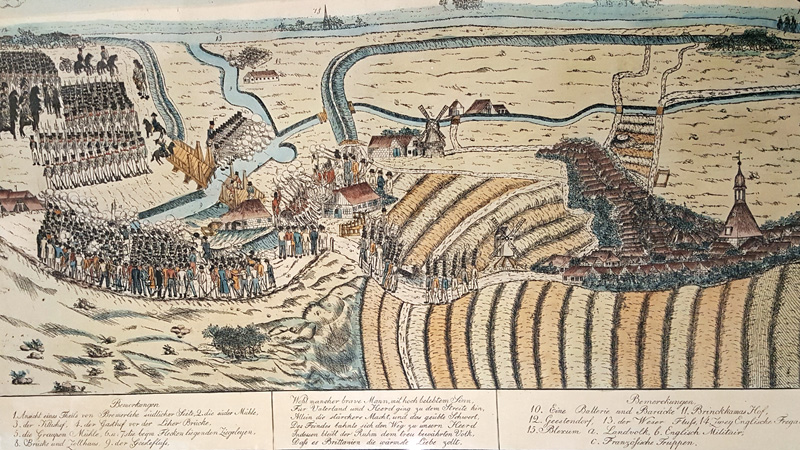 So gelang es schließlich einigen Franzosen, gedeckt durch das Feuer der am Ufer der Geeste stehenden Infanterie, schwimmend das andere Ufer zu erreichen. Die Franzosen schafften es, die Zugbrücke herunterzulassen, während weitere Soldaten auf den Brückenbalken balancierend dazustießen. Gemeinsam legten sie die Bretter des Fahrweges wieder über das Brückengestell und sofort rückte die Infanterie geführt von ihrem Kommandanten (Chack?) über die Geeste.