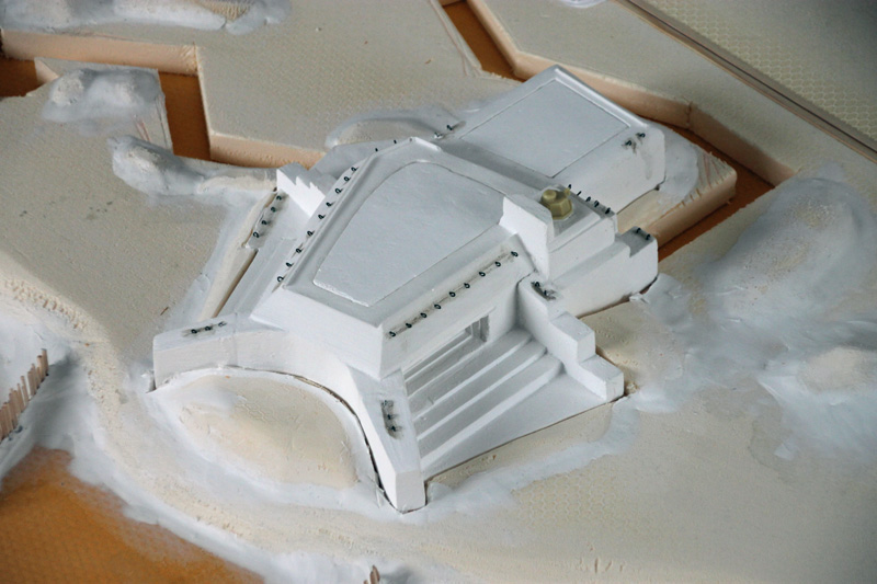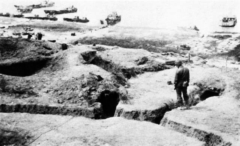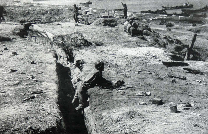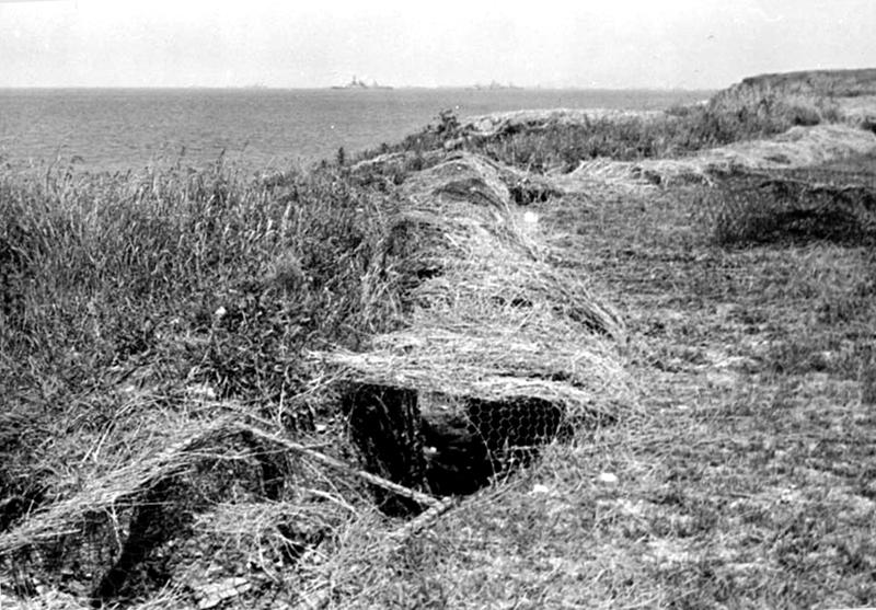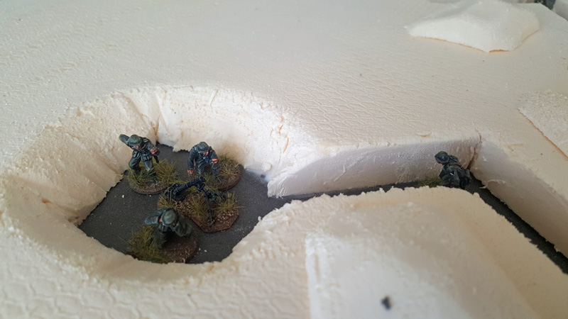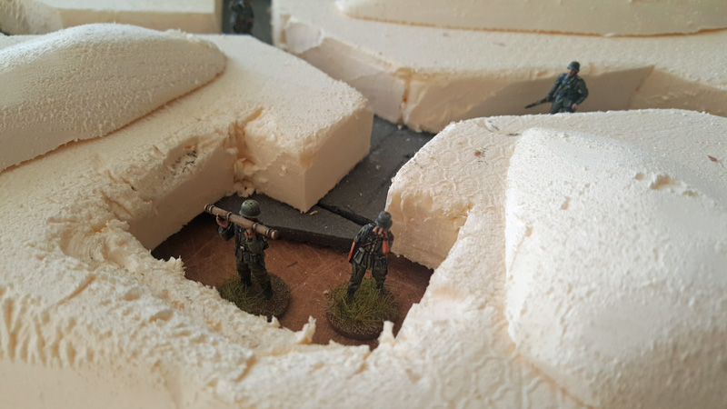 Nach der groben Geländegestaltung habe ich zunächst die Bunkeranlagen in die Oberfläche der Styrodurplatten eingearbeitet und verspachtelt. Bevor ich alle Höhenstufen miteinander verkleben konnte, musste noch den Verlauf der Schützengräben und der offenen Stellungen für MG‘s und Mörser festlegt und ausgeschnitten werden. Bei den Laufgräben habe ich jetzt keine (bzw. sehr wenige) Verschalungen aus Holz oder Faschinen vorgesehen, da alle alten Fotos nur einfache, unbefestigte Erdgräben zeigen. Da viele der Gräben erst kurz vor dem D-Day angelegt worden waren, hatte man damals vermutlich noch keine Zeit, langlebige Konstruktionen anzulegen.