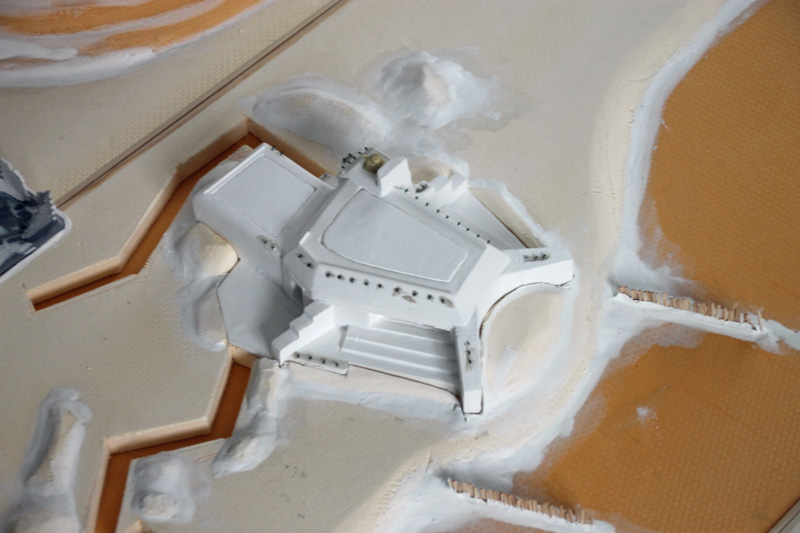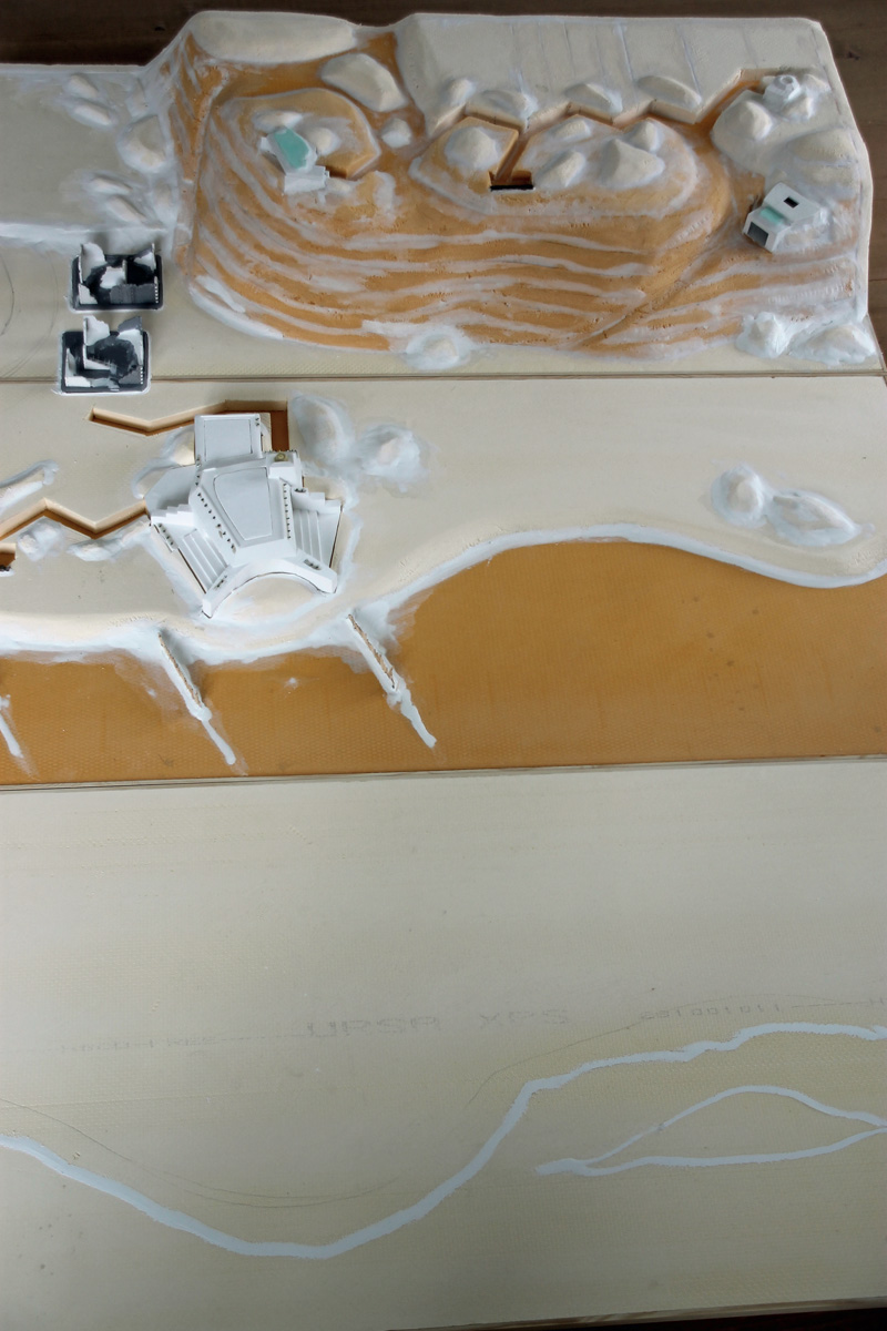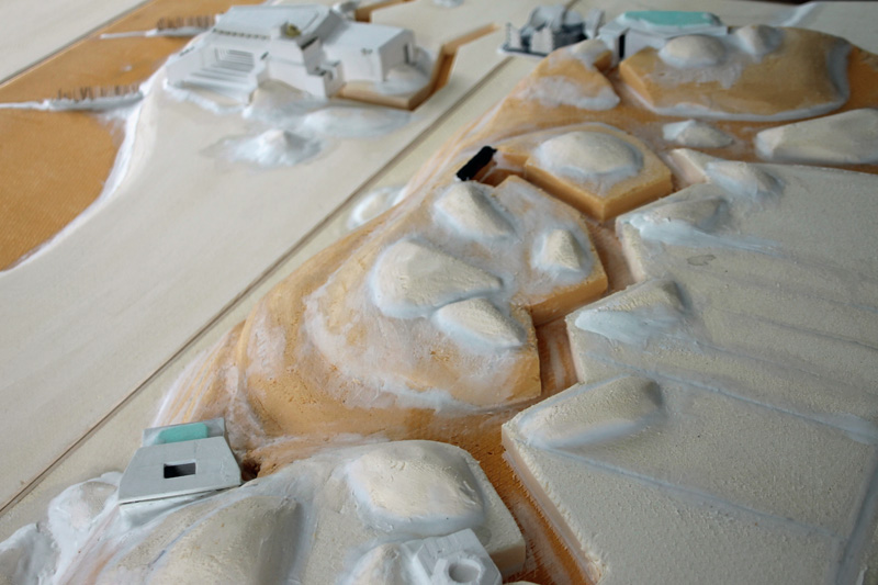 Nachdem diese Arbeiten abgeschlossen waren, wurde alles mit Maler-Acryl verspachtelt. Den Abschluss der Oberflächengestaltung bildete das Aufkleben von Sand, Kies und Steinen mit Weißleim. Für die Straße habe ich einen Belag aus Montagekleber verwendet. Einzig die Wassergestaltung sowie einige Detailarbeit steht noch aus, bevor ich mit der Bemalung beginnen kann.