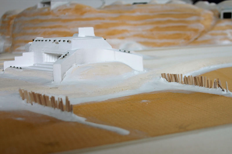 Die großen Bunker wurden ebenfalls schon ein wenig nachbearbeitet. Alle Einzelteile sind jetzt fest miteinander verklebt. Auf der Oberfläche habe ich Eisenhaken aus Draht eingeklebt, welche für das Anbringen von Tarnnetzen gedacht waren. Neben der Kasematte der PAK 43 habe ich auf der Seite der Panzer-Sperrmauer einen Auftritt für eine offene MG-Stellung angebracht. Auf der Seite hin zum Meer steht jetzt eine Tarn-Fassade einer Strandvilla aus Polystyrol-Leisten gebastelt.
