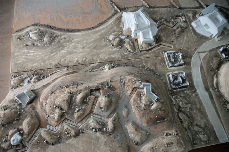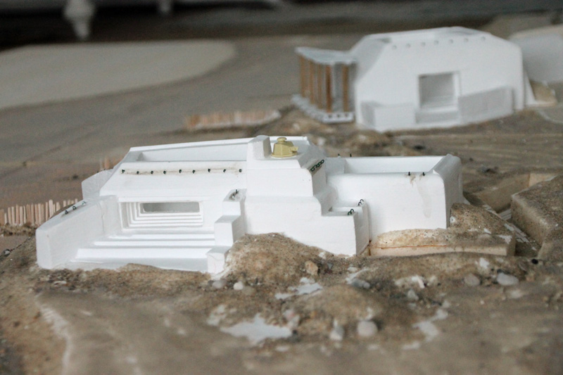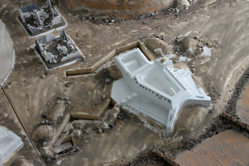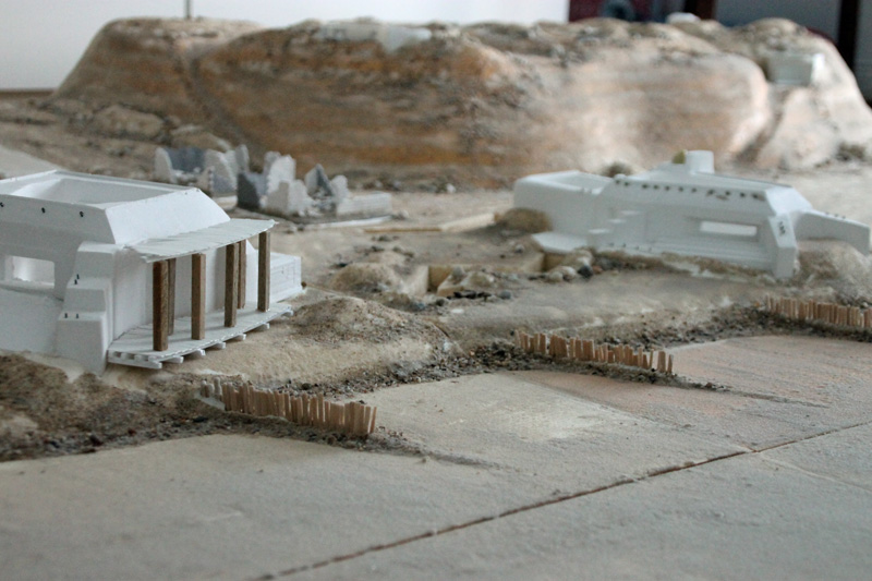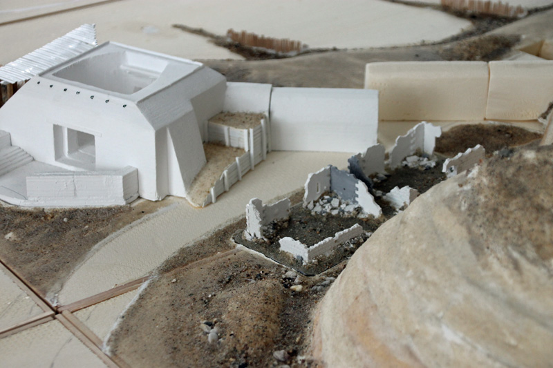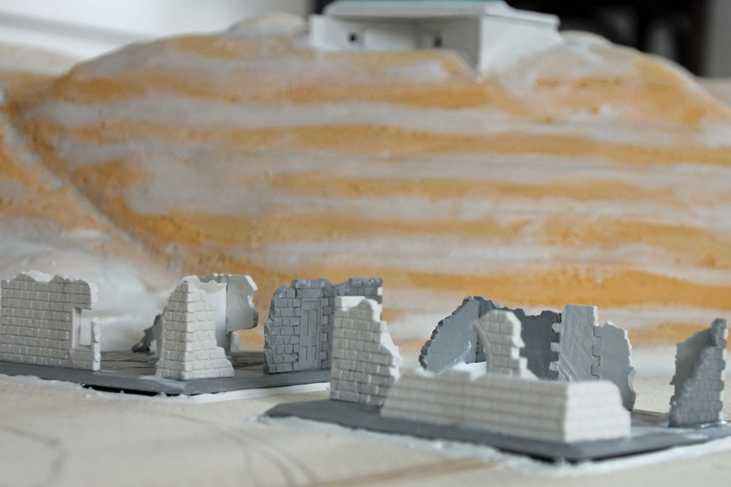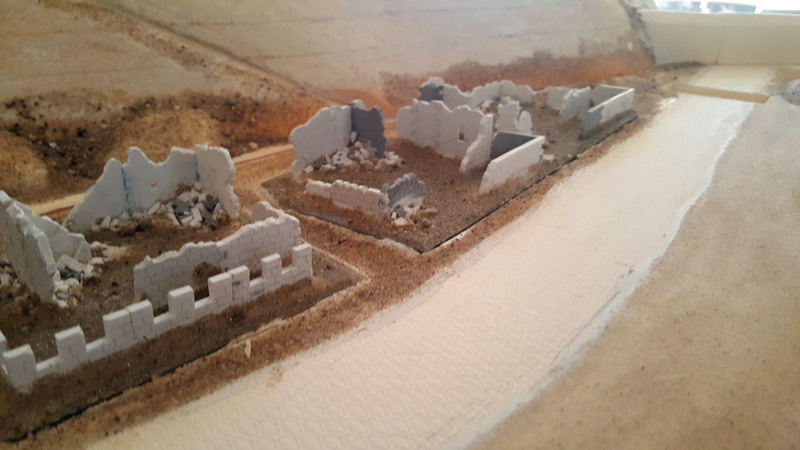 Die vielen, von den Deutschen abgerissenen Strandhäuser habe ich mit Bauteilen aus alten Linka-Giesformen gestaltet. Auch der Schutt ist eine Mischung aus Linka-Resten, Sand und Kies. Das Gießmaterial, eine Art „Keramik“ lässt sich gut nachbearbeiten und so lassen sich unregelmäßige Bruchkanten herstellen. Alle Ruinen wurden auf separate Basen geklebt, so dass diese auf die Spiel-Platte gelegt werden können. Auch die beiden großen Bunker aus Gies-Keramik sind nicht fest mit der Platte verbunden. Der Grund dafür ist, dass man so die Platte deutlich einfacher transportieren kann.