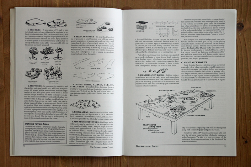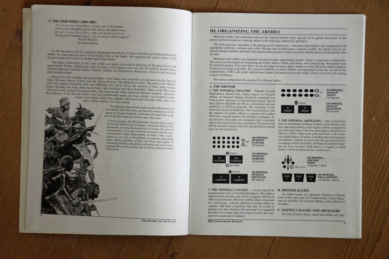 Neben den Regeln und Armeelisten enthält das Regelheft auch einige Szenarien sowie Literaturhinweise und einen kurzen Abriss der britischen Kolonialgeschichte. Interessant ist ein großer Abschnitt der sich mit dem Bau und der Gestaltung der Spielplatte sowie der Bemalung der Figuren beschäftigt. Ein Regelbuch-Bestandteil, der bei einigen älteren Publikationen, wie Warhammer Historical, noch häufig enthalten war. Am Ende des Heftes gibt es eine gute Zusammenfassung der Regeln sowie aller Tabellen, die man kopiert als QRS verwenden kann.