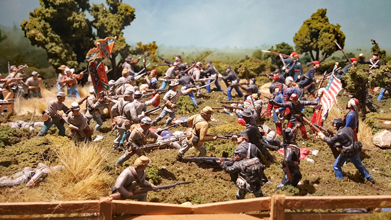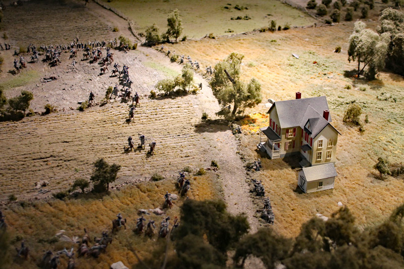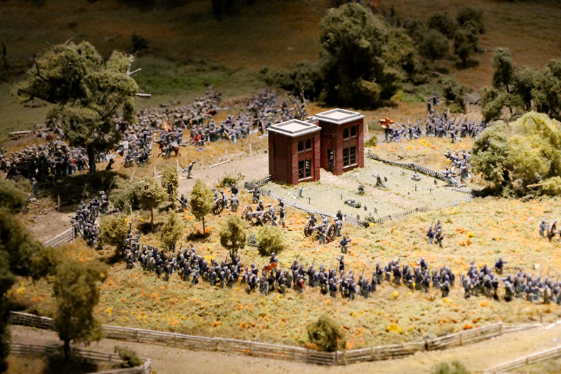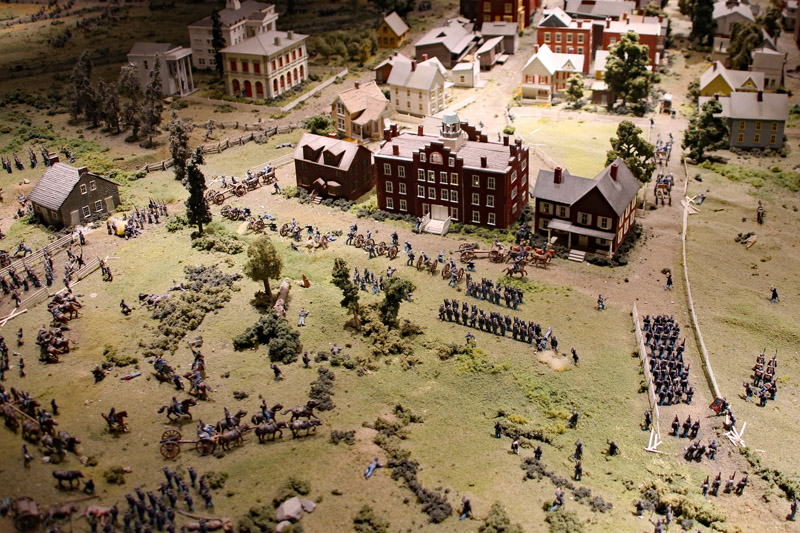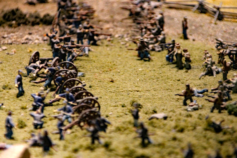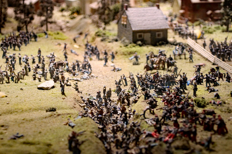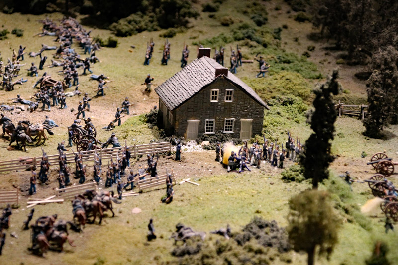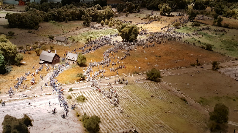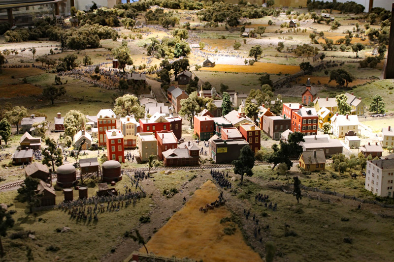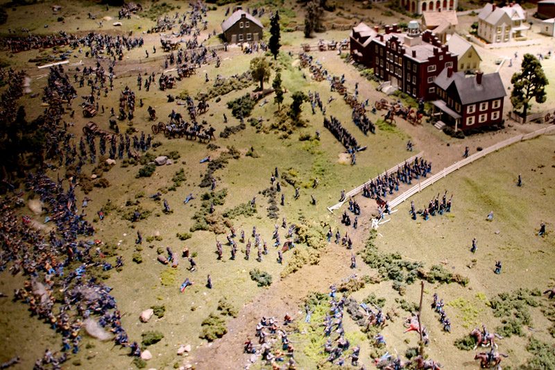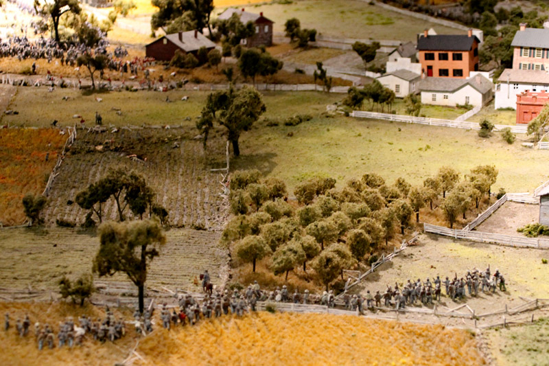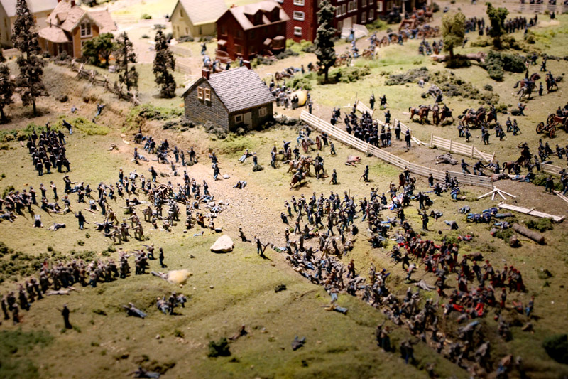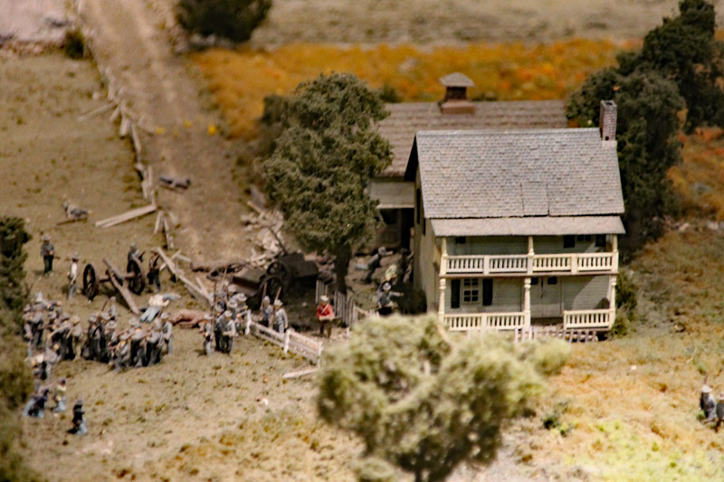 Im „Gettysburg Diorama“ kann man tatsächlich das gesamte 6.000 Hektar große Schlachtfeld auf einmal sehen, wenn auch nur in einem kleinen Maßstab. Mit über 20.000 handgemalten 1/72 Figuren, Pferden, Kanonen und Gebäuden ist das Diorama eines der größten in den USA. Bei näherer Betrachtung erkennt der Figuren-Sammler natürlich viele bekannten Airfix und IMEX-Figuren und Fahrzeuge.
