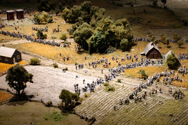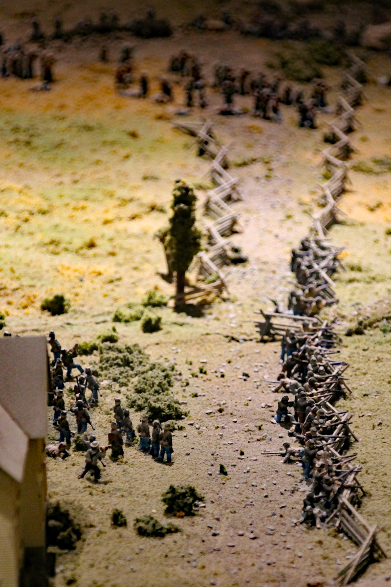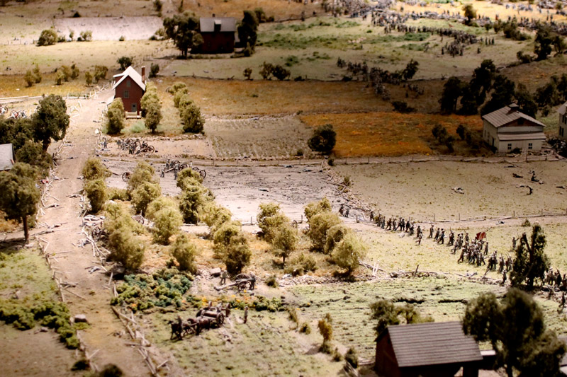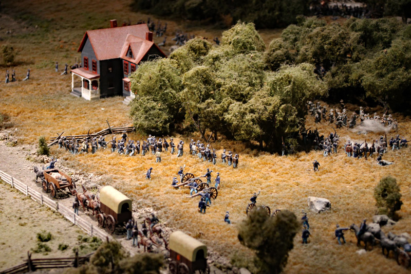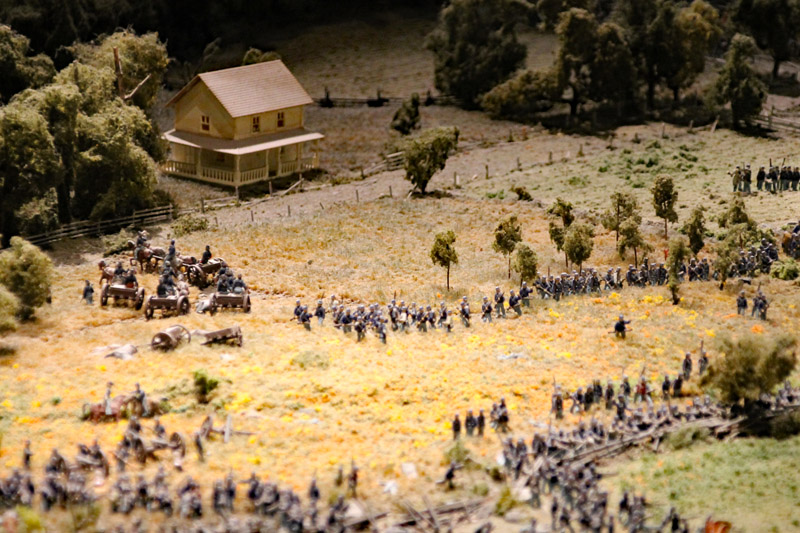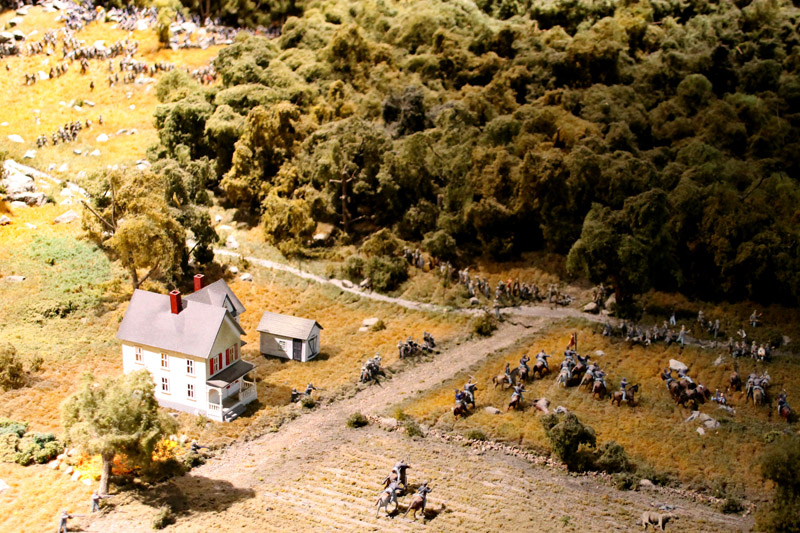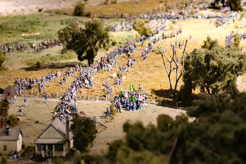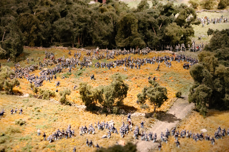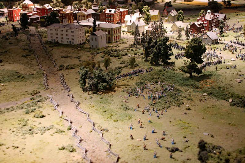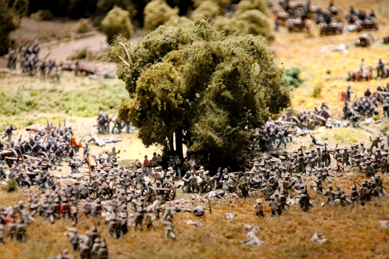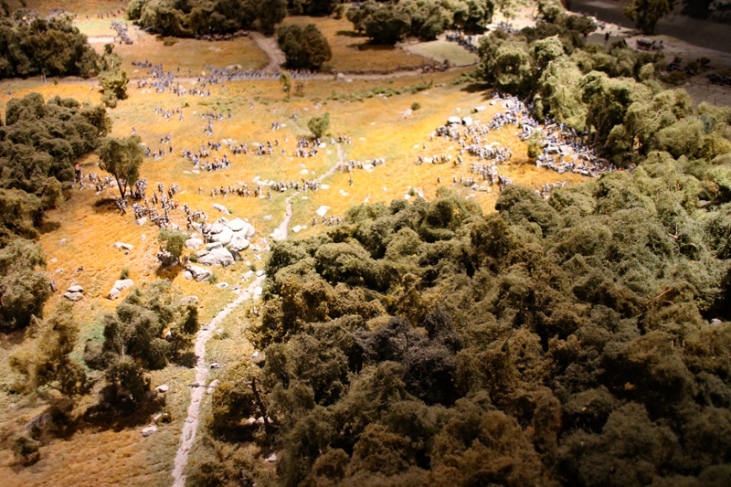 Im „Gettysburg Diorama“ kann man tatsächlich das gesamte 6.000 Hektar große Schlachtfeld auf einmal sehen, wenn auch nur in einem kleinen Maßstab. Mit über 20.000 handgemalten 1/72 Figuren, Pferden, Kanonen und Gebäuden ist das Diorama eines der größten in den USA. Bei näherer Betrachtung erkennt der Figuren-Sammler natürlich viele bekannten Airfix und IMEX-Figuren und Fahrzeuge.