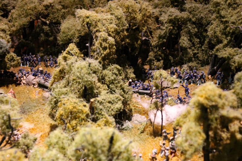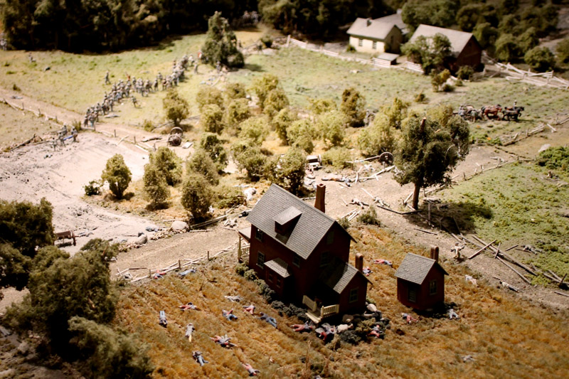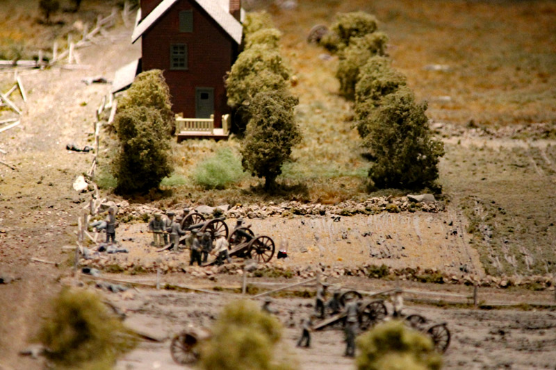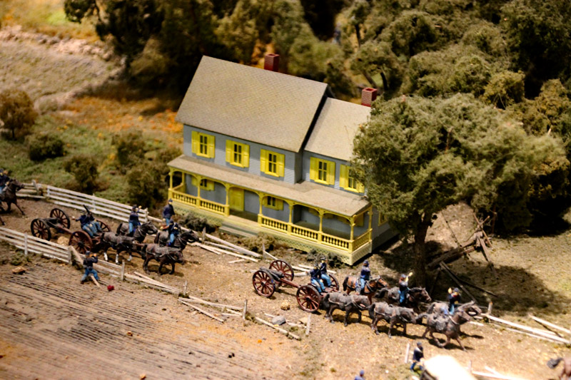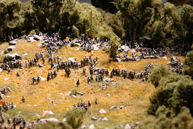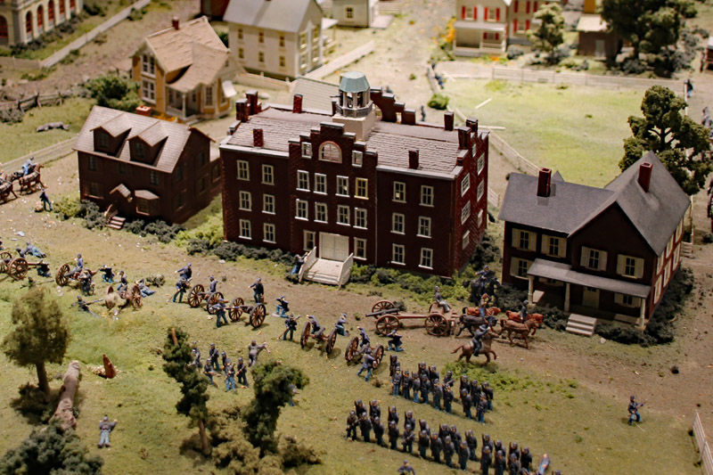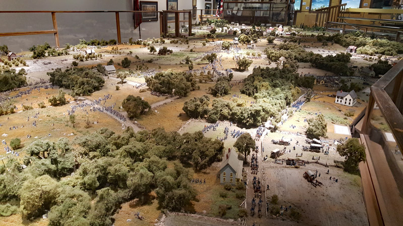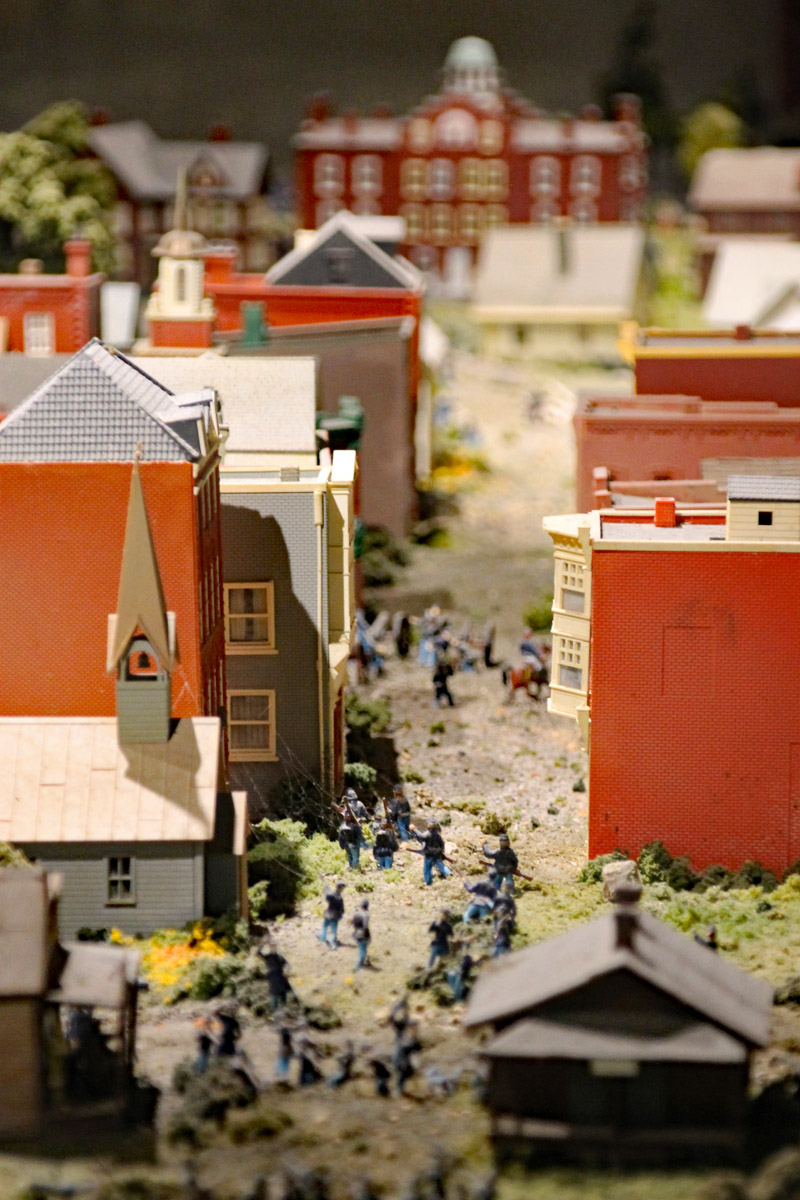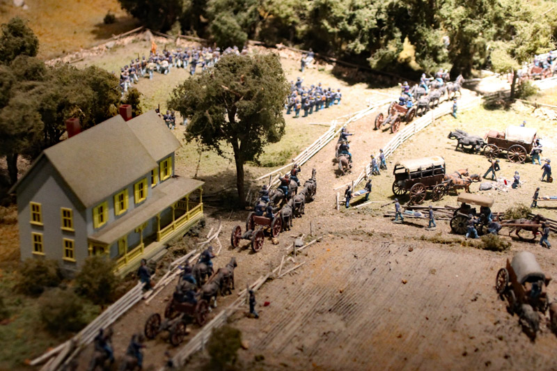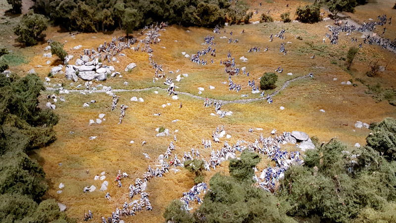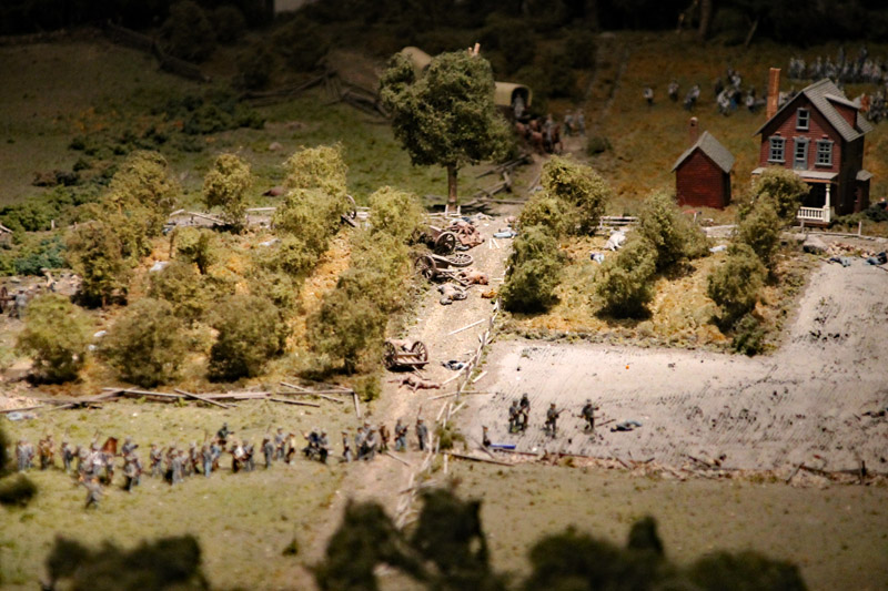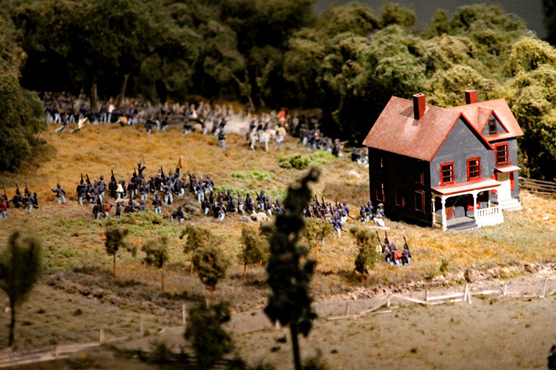 Im „Gettysburg Diorama“ kann man tatsächlich das gesamte 6.000 Hektar große Schlachtfeld auf einmal sehen, wenn auch nur in einem kleinen Maßstab. Mit über 20.000 handgemalten 1/72 Figuren, Pferden, Kanonen und Gebäuden ist das Diorama eines der größten in den USA. Bei näherer Betrachtung erkennt der Figuren-Sammler natürlich viele bekannten Airfix und IMEX-Figuren und Fahrzeuge.