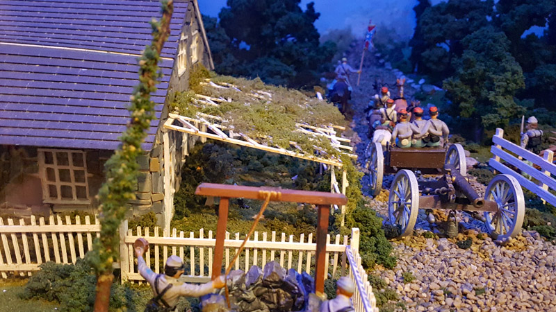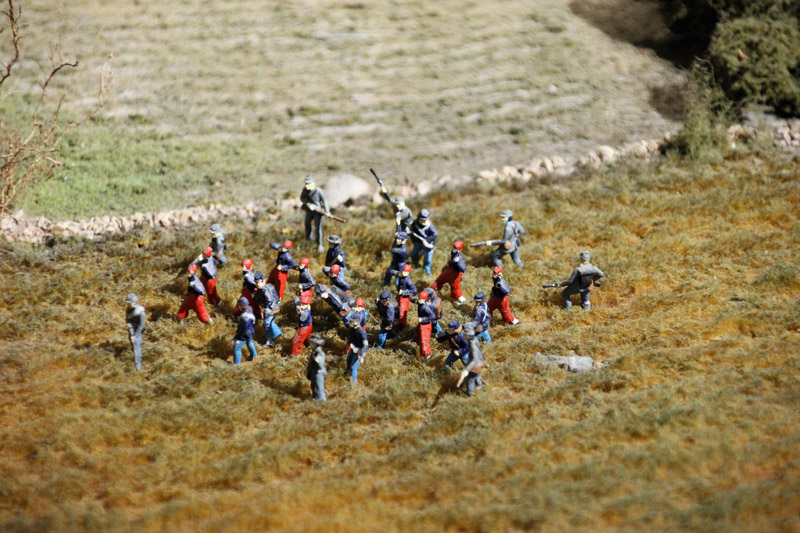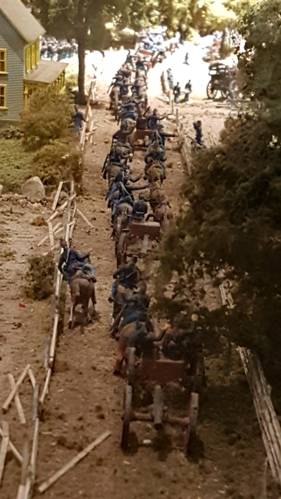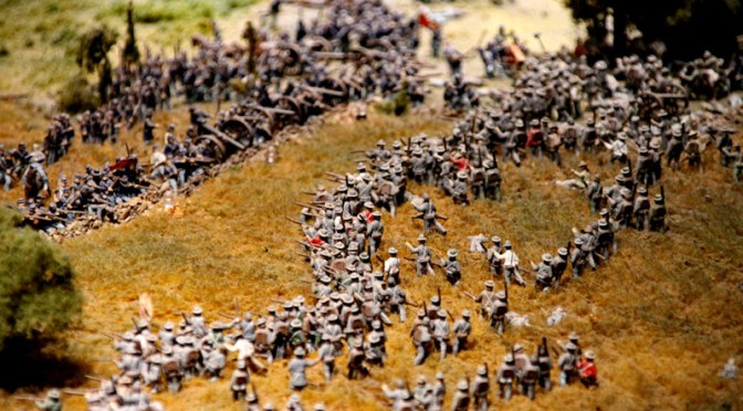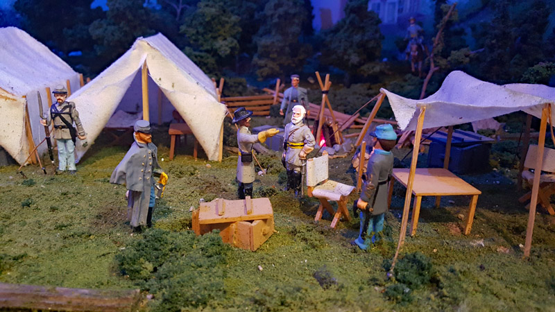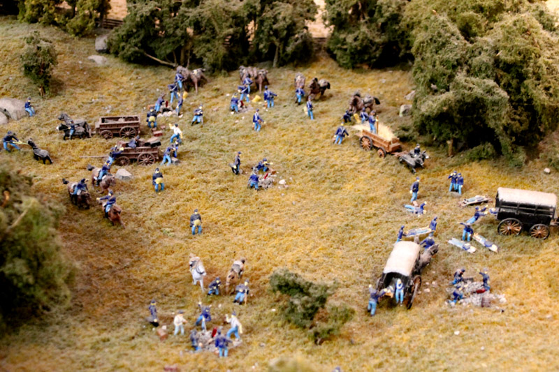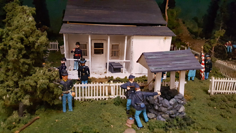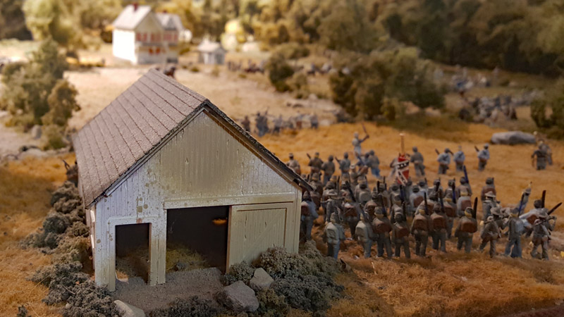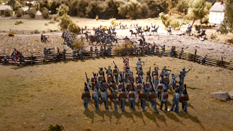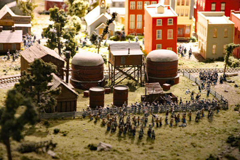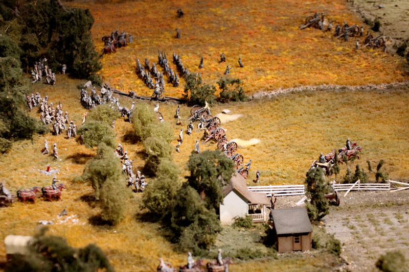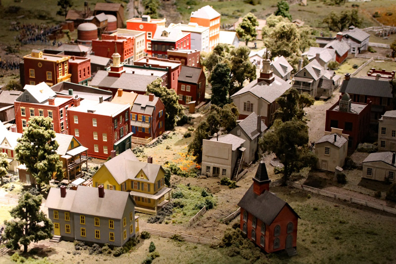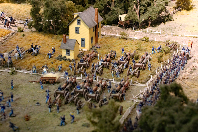 Im „Gettysburg Diorama“ kann man tatsächlich das gesamte 6.000 Hektar große Schlachtfeld auf einmal sehen, wenn auch nur in einem kleinen Maßstab. Mit über 20.000 handgemalten 1/72 Figuren, Pferden, Kanonen und Gebäuden ist das Diorama eines der größten in den USA. Bei näherer Betrachtung erkennt der Figuren-Sammler natürlich viele bekannten Airfix und IMEX-Figuren und Fahrzeuge.
