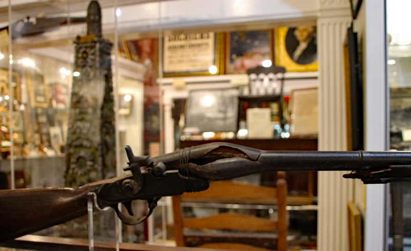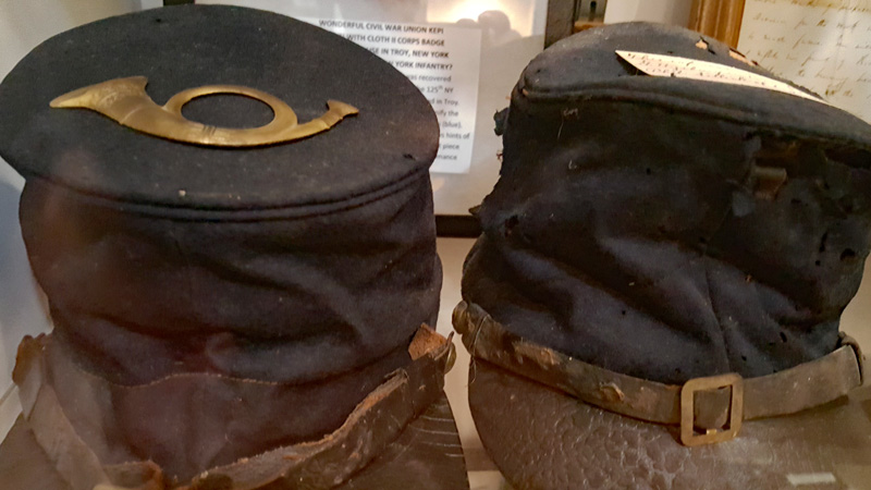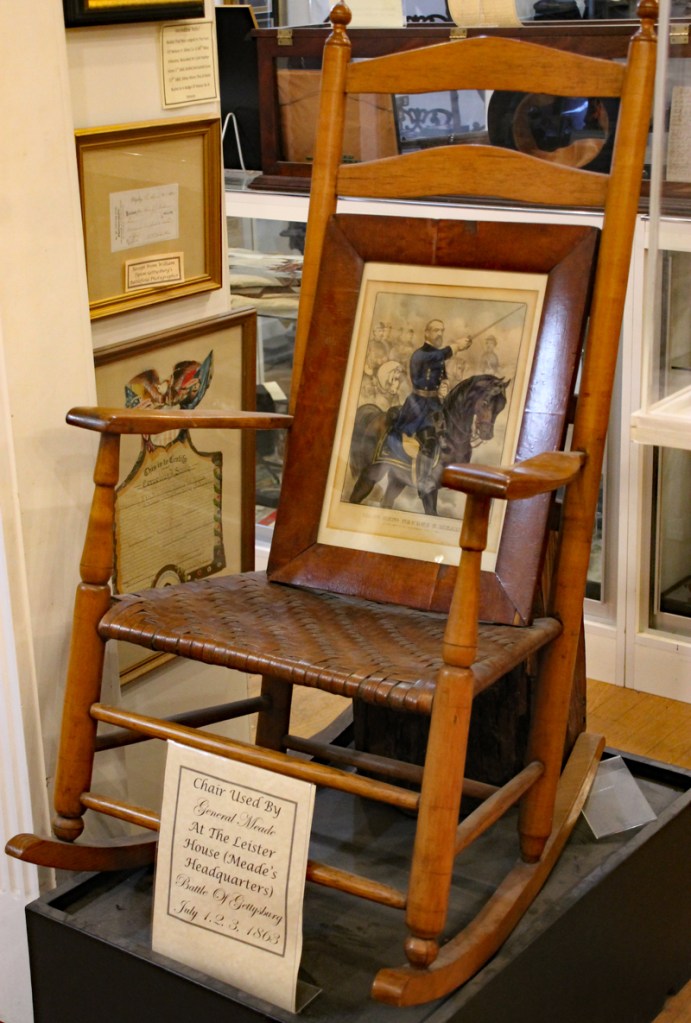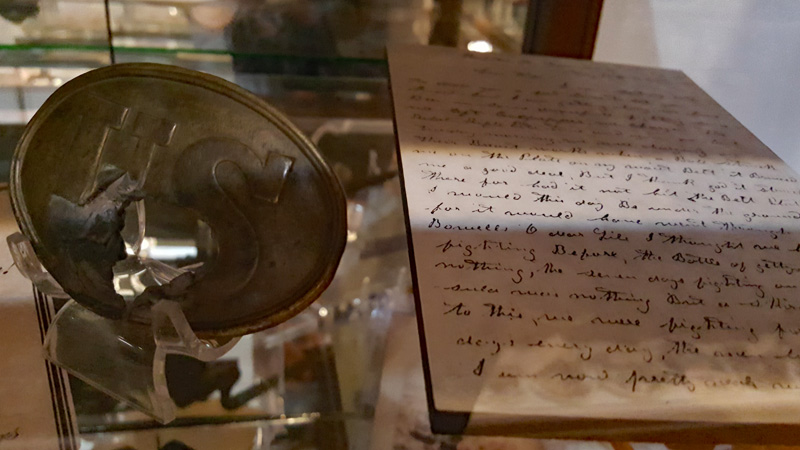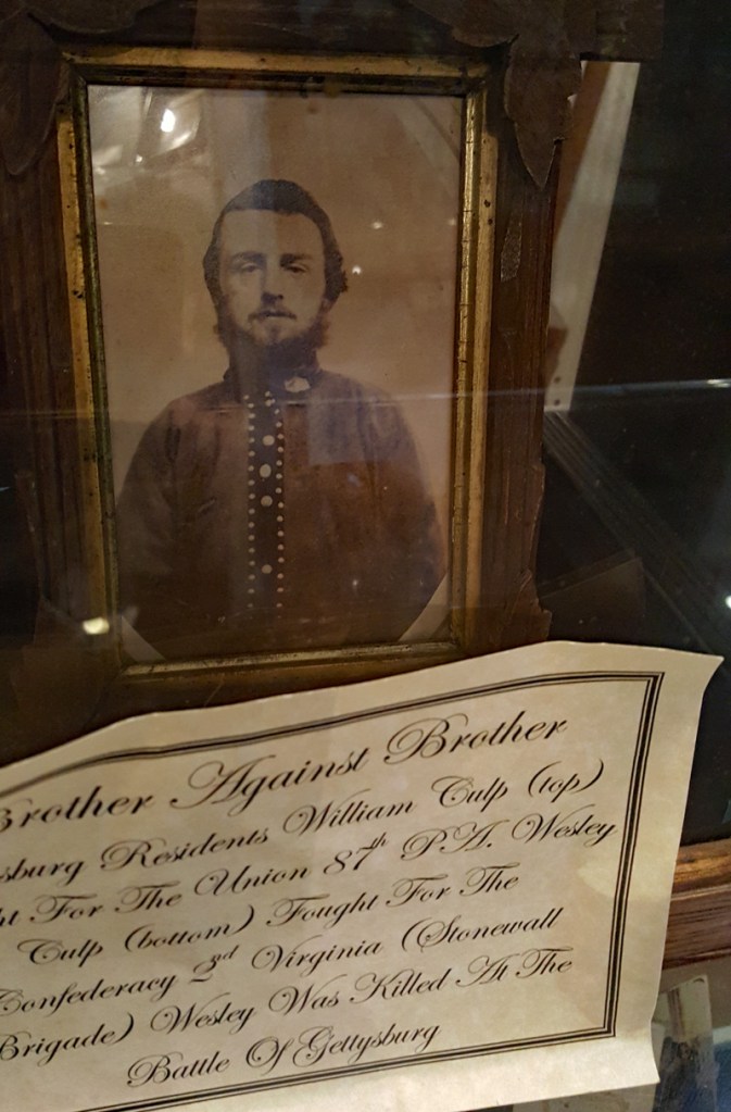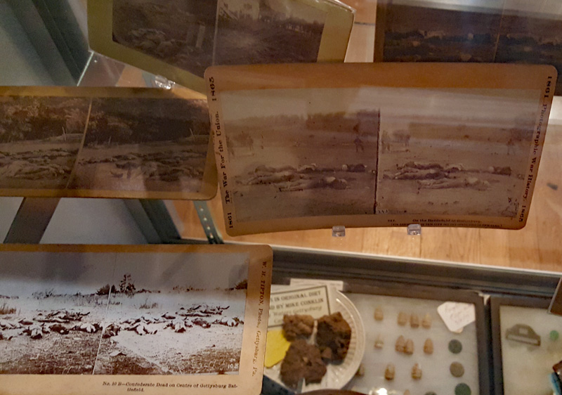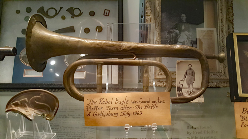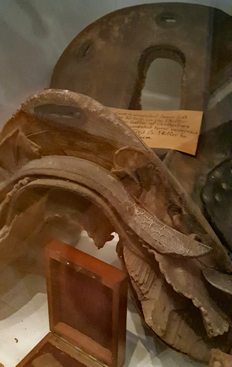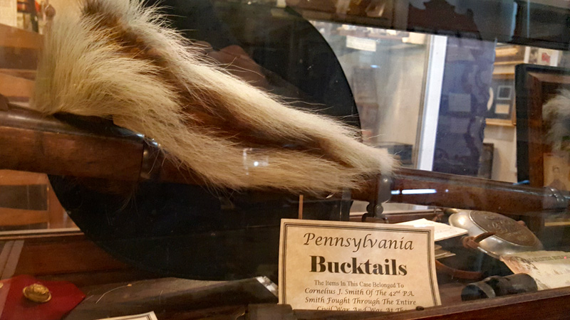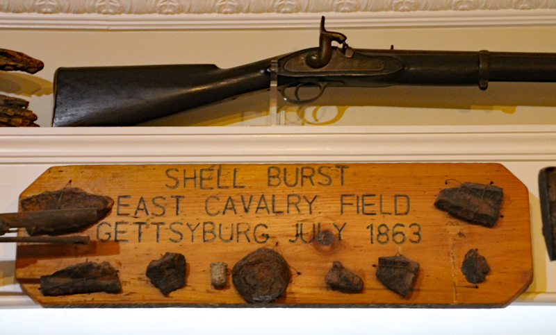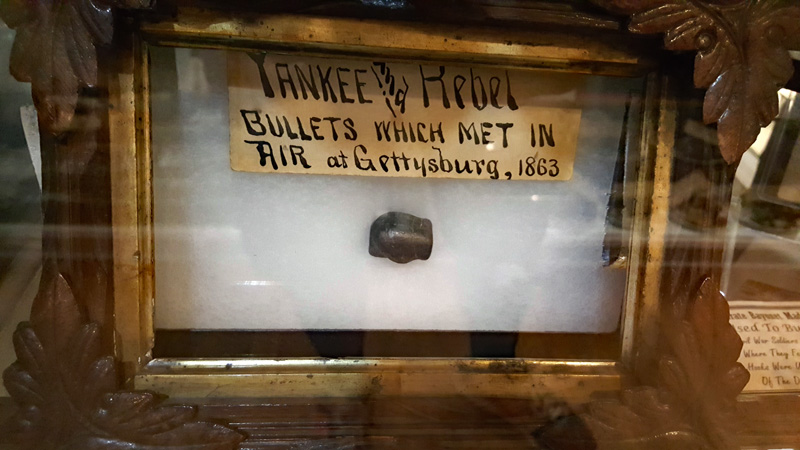 Der Mütze eines Unionssoldaten aus der Schlacht von Gettysburg. Ehemaliges Ausstellungsstück des General Lee’s Headquarters Museum Gettysburg, eines von vielen kleinen Museen, die es einst in Gettysburg gab.Links der Offiziersrock eines Lieutenants der Konföderierten. Rechts die von Captain Edgar W. Warren in Gettysburg getragene Uniform. Captain Warren (Bruder von General Warren) war während der Schlacht von Gettysburg im Stab von General Weed. Kapitän Warren wurde für seine Rolle in der Schlacht um Little Round Top zum Major ernannt. Diese Uniform wurde in den 1960er Jahren direkt von der Familie bezogen. Sie umfasst seine Uniform, Schärpe, seinen Gürtel, sein Schwert. Details der Konföderierten-Uniform.Details der Unions-Uniform.Zu sehen gibt es auch Fotos, Papiere und Korrespondenz im Zusammenhang mit der Uniform von Captain Warren.Dieser kleine Feldschreibtisch aus dem Bürgerkrieg stammt aus dem Nachlass von General Joshua Chamberlain. Auf der Innenseite befindet sich eine Tinteninschrift mit der Aufschrift „Hd Q (Headquarters) Desk 20th Maine Vol (Volunteers) Inf (Infantry). Verwendet von Ames (General Adelbert Ames), Chamberlain (General Joshua Chamberlain) und Spear (General Ellis Spear). Am Ende des Bürgerkriegs wurde diese Schreibbox Joshua Chamberlain übergeben und blieb bis Anfang des 20. Jahrhunderts im Chamberlain-Haus in Maine. Es landete später bei einem Freund der Chamberlain-Familie und blieb in Maine, bis das Gettysburg Museum of History es erhielt.Cornelius J. Smith war Soldat der berühmten Pennsylvania Bucktails, dem 42. Pennsylvania. Das Regiment war als „Pennsylvania Bucktails“ bekannt, weil die die Soldaten dieser Einheit einen Hirschschwanz auf ihren Hüten befestigten. Diese Sammlung wurde direkt von der Familie Smith bezogen. Sie umfasst sein Spencer-Gewehr, Bajonett, Kriegsfoto und Buck Tail, Briefe, einen GAR-Hut der Nachkriegszeit und eine äußerst interessante Patronentasche der Konföderierten mit Bleiknauf. Smith verwendete diese erbeutete Tasche als seine eigene und befestigte sein 5. Korps-Abzeichen darauf. Es war üblich, dass konföderierte Soldaten Ausrüstung der Union verwendeten, aber sehr ungewöhnlich, dass Unionssoldaten Ausrüstung der Konföderierten verwendeten. Laut Smiths Pensionsakte erlitt er einen Hörverlust durch eine Artilleriegranate, die während der Schlacht von Gettysburg neben ihm explodierte.Die Muskete hatte eine Fehlfunktion, die den Lauf explodieren ließ. Der Soldat hatte die Muskete zweifach geladen, wodurch der Lauf bei der Zündung auseinanderbrach. Die Exponat stammt aus dem alten Jenny Wade Museum.Diese Gürtelschnalle aus dem US-Bürgerkrieg wurde von Michael Miller von der Kompanie K der 1. Pennsylvania Reserves getragen. Diese Einheit bestand aus lokalen Gettysburg-Männern, die tatsächlich in der Schlacht von Gettysburg kämpften. Ihr Spitzname war “The boys who fought at home. Miller schrieb seiner Frau über das Ereignis: „Eine Kugel traf mich auf mitten in die Gürtelschnalle. Sie hatte mich schwer verletzt, aber ich danke Gott, dass es mich dort erwischt hat hat, denn wenn es nicht die Gürtelschnalle getroffen hätte, wäre ich heute im unter der Erde, denn es wäre geradewegs durch meine Eingeweide gegangen.“ Der Brief und die Gürtelschnalle sind zusammen im Museum ausgestellt.Ein Schulbuch mit ganz ungewöhnlichen Rechenaufgaben: „Wenn ein konföderierter Soldat 90 Yankees töten kann, wie viele Yankee können dann 10 konföderierte Soldaten töten?“Ein Stück Zaun mit einer Kugel darin, darüber ein Kavallerie-Karabiner.Ein Präsentationsschwert aus dem Bürgerkrieg, das von Captain Henry Gildersleeve Company C 150th New York getragen wurde. Gildersleeve und das 150. waren während der Schlacht von Gettysburg in die Kämpfe am Culp’s Hill involviert. Nach dem Bürgerkrieg wurde Henry Gildersleeve einer der ersten Präsidenten der National Rifle Association.Das Museum besitzt eine Sammlung von hunderten von Fotos aus dem Bürgerkrieg. Diese Stereoskopie -Fotos waren aber etwas Ungewöhnliches. Durch diese aus zwei Winkeln geschossen Fotos, die in einen Apparat gesteckt wurden, Konnte der Betrachter ein 3D-Bild sehen. Es gibt zahlreiche Bäume und Holzzäune in denen Kugeln von der Schlacht gefunden wurden. In diesem Beispiel steckten sogar gleich 4 Geschosse.Wesley Culp wurde 1839 in Gettysburg, Pennsylvania, geboren. Ein Verwandter von ihm, Henry Culp, besaß das Land um Culp’s Hill, südlich der Stadt. Als Kutschenmacherlehrling folgte Wesley Culp 1858 seinem Arbeitgeber 42 Meilen südlich nach Shepherdstown, Virginia, und schloss sich dort der örtlichen Miliz, den Hamtramck Guards, an. Nach dem Ausbruch des amerikanischen Bürgerkriegs (1861–1865) folgte er seinen Kameraden und nicht seiner Familie, indem er sich der konföderierten Armee anschloss. Culp starb am 2. Juli 1863 in der Nähe, wenn nicht sogar auf Culp’s Hill, während der Schlacht von Gettysburg.Eine 3-Ringkugel der Union und eine 2-Ringkugel der Konörderierten, die sich während der Schlacht von Gettysburg in der Luft trafen. Ursprünglich Teil des Rosensteel Museums und mit dem originalen Rosensteel Round-Top Museum-Etikett versehen. Die Kugel sind so dunkel, weil sie ein Schlachtfeld-Guide früher immer in seiner Tasche getragen hatte und seinen Besuchern während der Führung zeigte.Dieser Stuhl befand sich im Haus von Lydia Leister, als General George Meade das Haus während der Schlacht von Gettysburg als Hauptquartier nutzte. Es wurde angeblich von General Meade während des „Kriegsrats“ verwendet, der während der Schlacht stattfand, in der Meade die Entscheidung traf, in Gettysburg zu bleiben und mit General Lee zu kämpfen. Die Witwe Leister verkaufte diesen Stuhl Ende des 19. Jahrhunderts an William Pfeffer, Hausmeister des Evergreen Cemetery.
