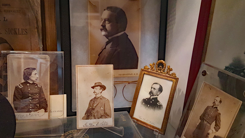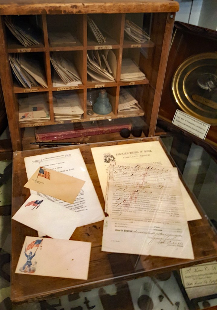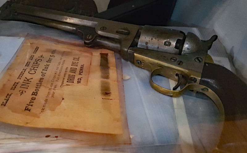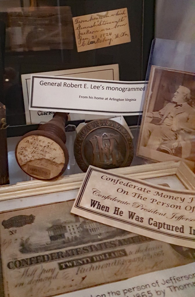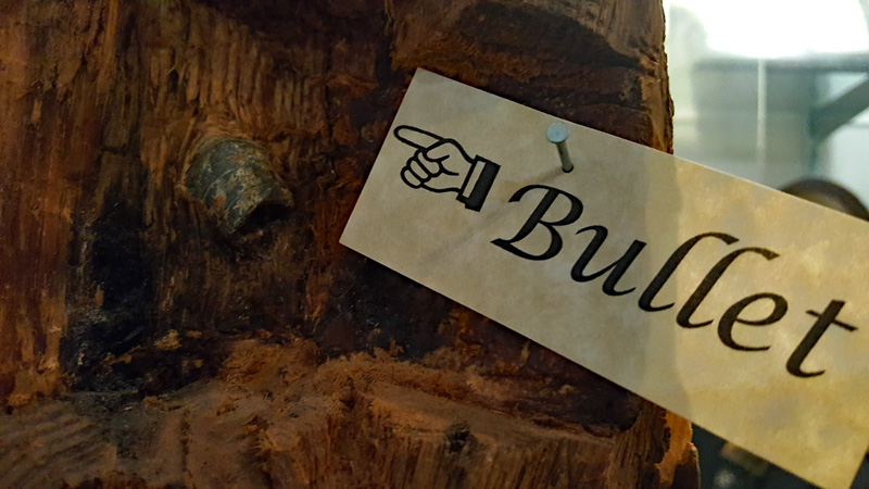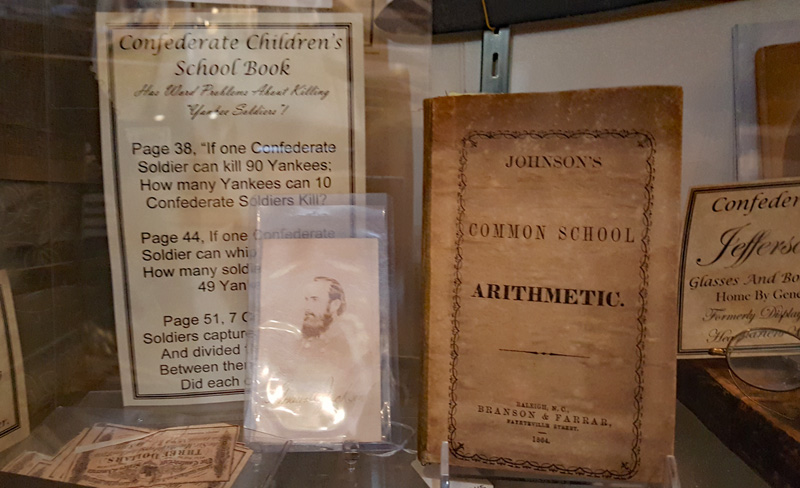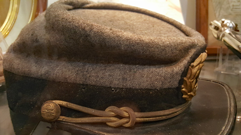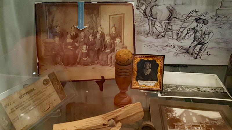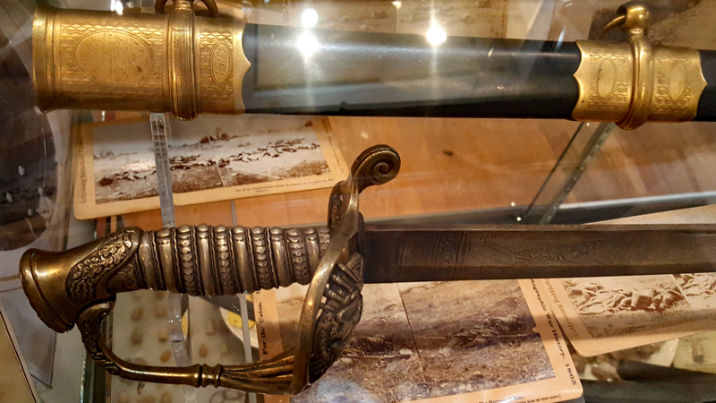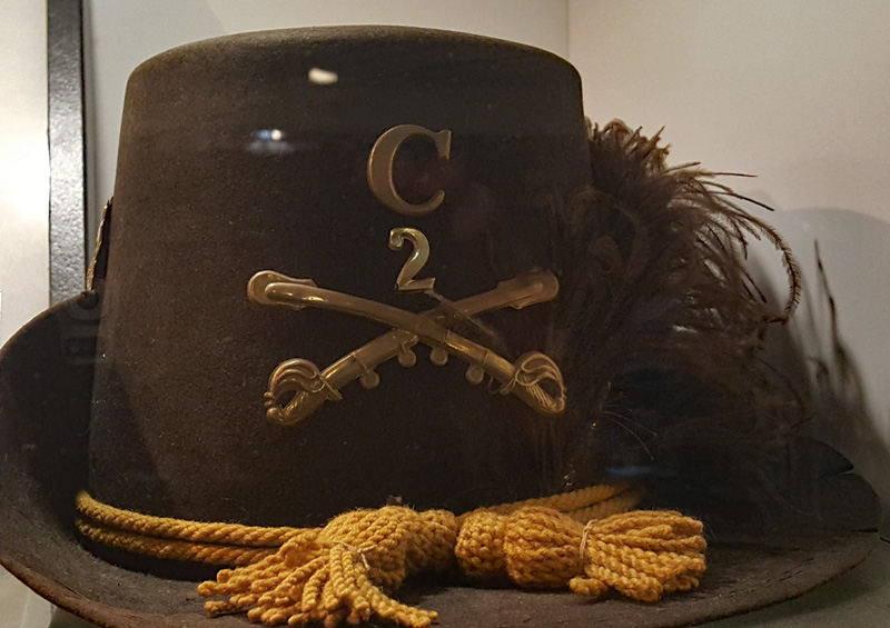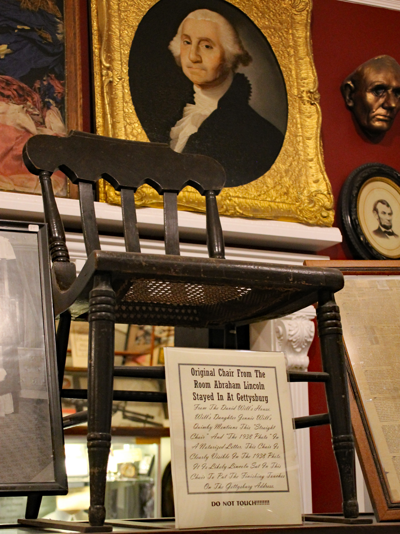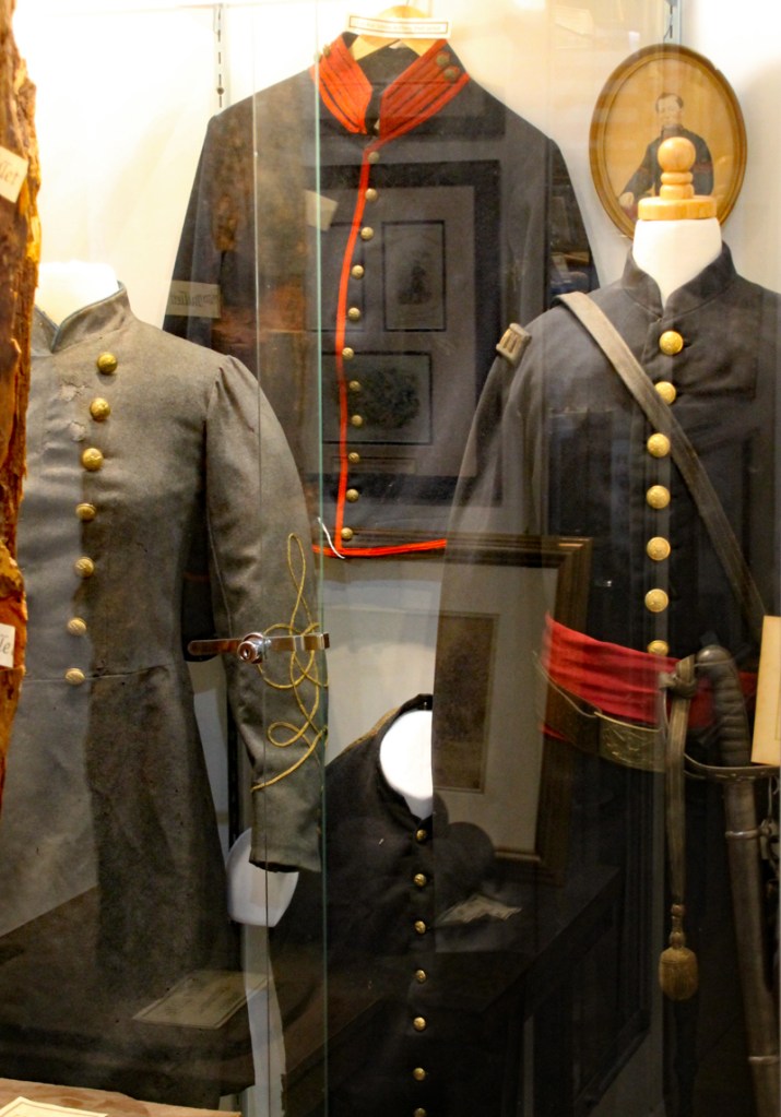 Der Mütze eines Unionssoldaten aus der Schlacht von Gettysburg. Ehemaliges Ausstellungsstück des General Lee’s Headquarters Museum Gettysburg, eines von vielen kleinen Museen, die es einst in Gettysburg gab.Links der Offiziersrock eines Lieutenants der Konföderierten. Rechts die von Captain Edgar W. Warren in Gettysburg getragene Uniform. Captain Warren (Bruder von General Warren) war während der Schlacht von Gettysburg im Stab von General Weed. Kapitän Warren wurde für seine Rolle in der Schlacht um Little Round Top zum Major ernannt. Diese Uniform wurde in den 1960er Jahren direkt von der Familie bezogen. Sie umfasst seine Uniform, Schärpe, seinen Gürtel, sein Schwert. Details der Konföderierten-Uniform.Details der Unions-Uniform.Zu sehen gibt es auch Fotos, Papiere und Korrespondenz im Zusammenhang mit der Uniform von Captain Warren.Dieser kleine Feldschreibtisch aus dem Bürgerkrieg stammt aus dem Nachlass von General Joshua Chamberlain. Auf der Innenseite befindet sich eine Tinteninschrift mit der Aufschrift „Hd Q (Headquarters) Desk 20th Maine Vol (Volunteers) Inf (Infantry). Verwendet von Ames (General Adelbert Ames), Chamberlain (General Joshua Chamberlain) und Spear (General Ellis Spear). Am Ende des Bürgerkriegs wurde diese Schreibbox Joshua Chamberlain übergeben und blieb bis Anfang des 20. Jahrhunderts im Chamberlain-Haus in Maine. Es landete später bei einem Freund der Chamberlain-Familie und blieb in Maine, bis das Gettysburg Museum of History es erhielt.Cornelius J. Smith war Soldat der berühmten Pennsylvania Bucktails, dem 42. Pennsylvania. Das Regiment war als „Pennsylvania Bucktails“ bekannt, weil die die Soldaten dieser Einheit einen Hirschschwanz auf ihren Hüten befestigten. Diese Sammlung wurde direkt von der Familie Smith bezogen. Sie umfasst sein Spencer-Gewehr, Bajonett, Kriegsfoto und Buck Tail, Briefe, einen GAR-Hut der Nachkriegszeit und eine äußerst interessante Patronentasche der Konföderierten mit Bleiknauf. Smith verwendete diese erbeutete Tasche als seine eigene und befestigte sein 5. Korps-Abzeichen darauf. Es war üblich, dass konföderierte Soldaten Ausrüstung der Union verwendeten, aber sehr ungewöhnlich, dass Unionssoldaten Ausrüstung der Konföderierten verwendeten. Laut Smiths Pensionsakte erlitt er einen Hörverlust durch eine Artilleriegranate, die während der Schlacht von Gettysburg neben ihm explodierte.Die Muskete hatte eine Fehlfunktion, die den Lauf explodieren ließ. Der Soldat hatte die Muskete zweifach geladen, wodurch der Lauf bei der Zündung auseinanderbrach. Die Exponat stammt aus dem alten Jenny Wade Museum.Diese Gürtelschnalle aus dem US-Bürgerkrieg wurde von Michael Miller von der Kompanie K der 1. Pennsylvania Reserves getragen. Diese Einheit bestand aus lokalen Gettysburg-Männern, die tatsächlich in der Schlacht von Gettysburg kämpften. Ihr Spitzname war “The boys who fought at home. Miller schrieb seiner Frau über das Ereignis: „Eine Kugel traf mich auf mitten in die Gürtelschnalle. Sie hatte mich schwer verletzt, aber ich danke Gott, dass es mich dort erwischt hat hat, denn wenn es nicht die Gürtelschnalle getroffen hätte, wäre ich heute im unter der Erde, denn es wäre geradewegs durch meine Eingeweide gegangen.“ Der Brief und die Gürtelschnalle sind zusammen im Museum ausgestellt.Ein Schulbuch mit ganz ungewöhnlichen Rechenaufgaben: „Wenn ein konföderierter Soldat 90 Yankees töten kann, wie viele Yankee können dann 10 konföderierte Soldaten töten?“Ein Stück Zaun mit einer Kugel darin, darüber ein Kavallerie-Karabiner.Ein Präsentationsschwert aus dem Bürgerkrieg, das von Captain Henry Gildersleeve Company C 150th New York getragen wurde. Gildersleeve und das 150. waren während der Schlacht von Gettysburg in die Kämpfe am Culp’s Hill involviert. Nach dem Bürgerkrieg wurde Henry Gildersleeve einer der ersten Präsidenten der National Rifle Association.Das Museum besitzt eine Sammlung von hunderten von Fotos aus dem Bürgerkrieg. Diese Stereoskopie -Fotos waren aber etwas Ungewöhnliches. Durch diese aus zwei Winkeln geschossen Fotos, die in einen Apparat gesteckt wurden, Konnte der Betrachter ein 3D-Bild sehen. Es gibt zahlreiche Bäume und Holzzäune in denen Kugeln von der Schlacht gefunden wurden. In diesem Beispiel steckten sogar gleich 4 Geschosse.Wesley Culp wurde 1839 in Gettysburg, Pennsylvania, geboren. Ein Verwandter von ihm, Henry Culp, besaß das Land um Culp’s Hill, südlich der Stadt. Als Kutschenmacherlehrling folgte Wesley Culp 1858 seinem Arbeitgeber 42 Meilen südlich nach Shepherdstown, Virginia, und schloss sich dort der örtlichen Miliz, den Hamtramck Guards, an. Nach dem Ausbruch des amerikanischen Bürgerkriegs (1861–1865) folgte er seinen Kameraden und nicht seiner Familie, indem er sich der konföderierten Armee anschloss. Culp starb am 2. Juli 1863 in der Nähe, wenn nicht sogar auf Culp’s Hill, während der Schlacht von Gettysburg.Eine 3-Ringkugel der Union und eine 2-Ringkugel der Konörderierten, die sich während der Schlacht von Gettysburg in der Luft trafen. Ursprünglich Teil des Rosensteel Museums und mit dem originalen Rosensteel Round-Top Museum-Etikett versehen. Die Kugel sind so dunkel, weil sie ein Schlachtfeld-Guide früher immer in seiner Tasche getragen hatte und seinen Besuchern während der Führung zeigte.Dieser Stuhl befand sich im Haus von Lydia Leister, als General George Meade das Haus während der Schlacht von Gettysburg als Hauptquartier nutzte. Es wurde angeblich von General Meade während des „Kriegsrats“ verwendet, der während der Schlacht stattfand, in der Meade die Entscheidung traf, in Gettysburg zu bleiben und mit General Lee zu kämpfen. Die Witwe Leister verkaufte diesen Stuhl Ende des 19. Jahrhunderts an William Pfeffer, Hausmeister des Evergreen Cemetery.