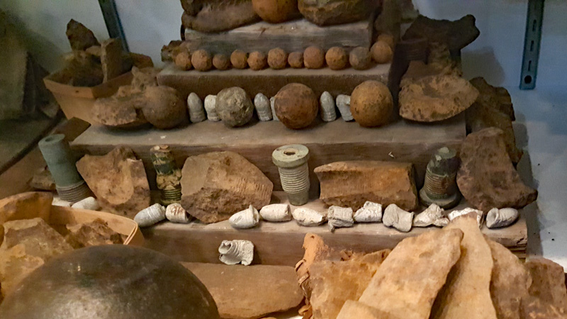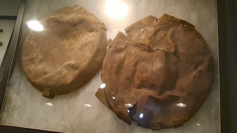 Die Teller mit den unterschiedlichen Fundstücken sind immer einer bestimmten Region des Schlachtfeldes zugeordnet. Diese Schaustücke stammen noch aus der Anfangszeit des Museums, in welcher kleinen Privatsammlungen an das Museum übergeben wurden. Vermutlich wurden die Fundstücke so präsentiert, da die kleinen Museen keine teuren Glasvitrinen besaßen…