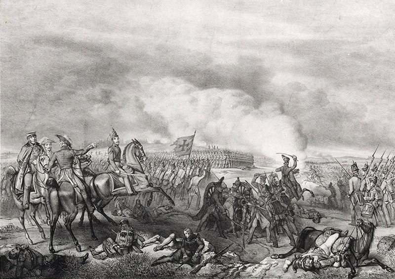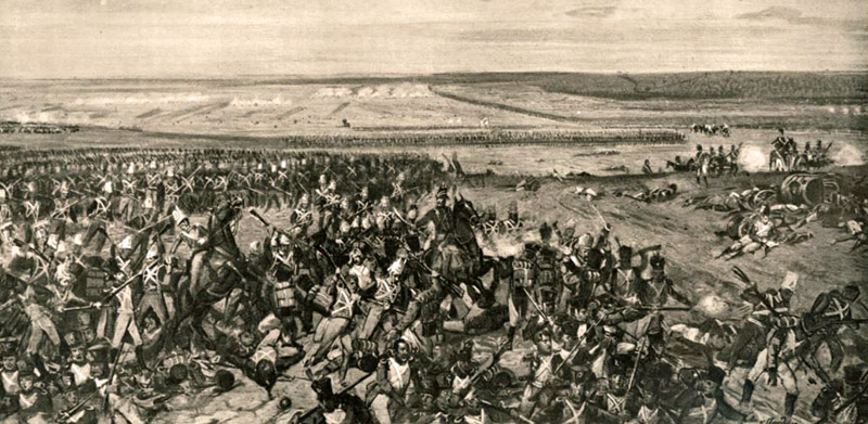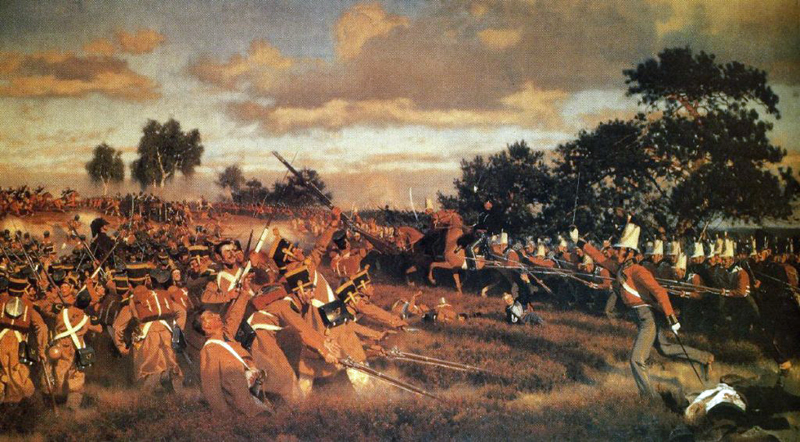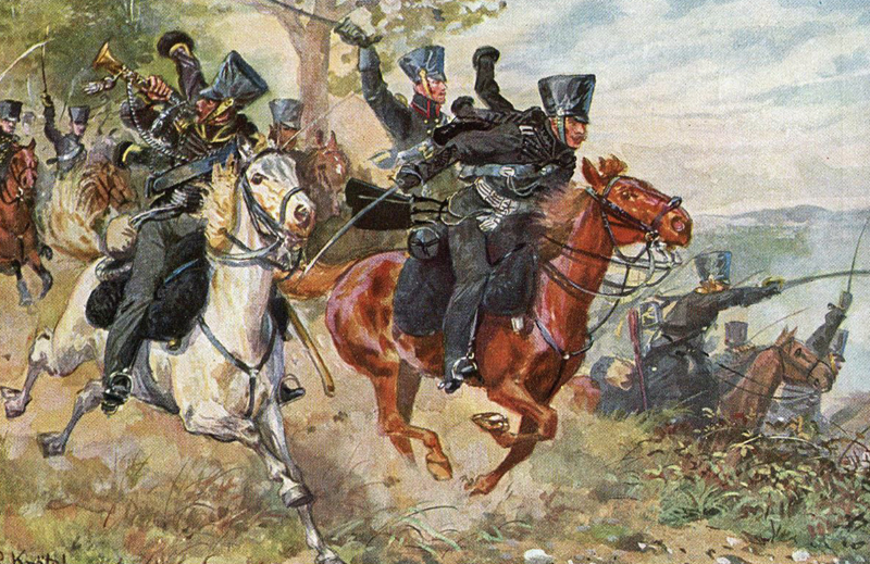 FOTO: „Angriff der Britisch-Deutschen Bataillone von Bennigsen und Langrehr unter Oberstleutnant Hugh-Halkett sowie des Lützower und des 3. Britisch-Deutschen Husaren-Regiments gegen die Karrees des französischen Generals Pécheux. Das Originalgemälde von Röchling befindet sich im Besitz des Museums in Celle.