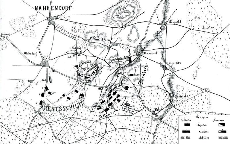 16. 15 Uhr: Die 1. Brigade der RDL entwickelt sich in Richtung der Lüneburger Straße, um so die Lücke zur Division Lyon zu schließen. Schon bald werden die Bataillone von der französischen Artillerie auf der rechten Flanke unter Feuer genommen, woraufhin die Plänkler vorgeschickt werden und die restliche Infanterie dahinter in Kolonne abwartend in Stellung geht. Dabei steht das 1. Bataillon im 1. Treffen, das 2. und 5. Bataillon im zweiten Treffen dahinter. Die 2. Infanterie-Brigade der RDL rückt in Richtung Oldendorf vor, um wie geplant den Rückzugsweg der Franzosen zu bedrohen.