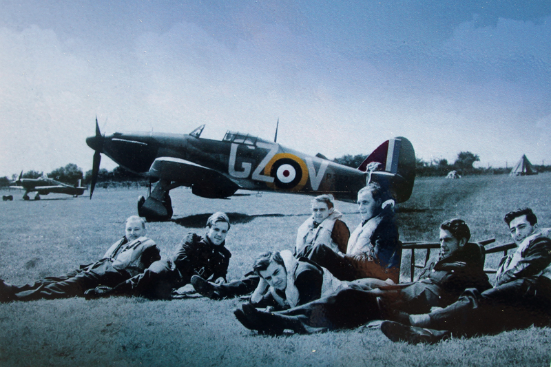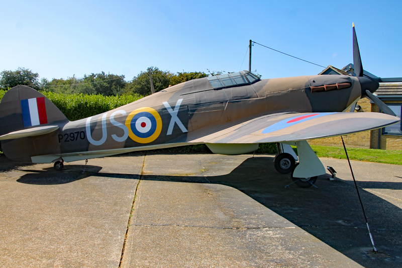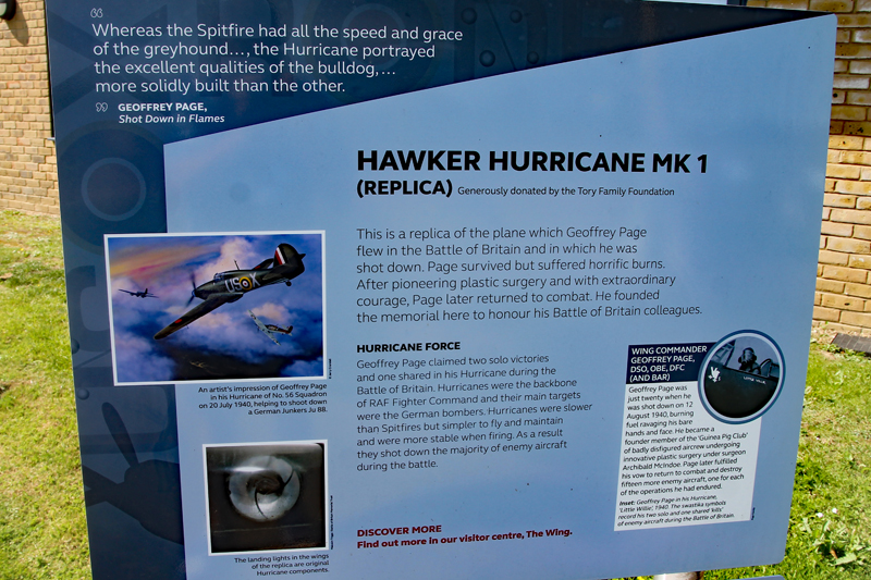 Die Nachbildung des Hawker Hurricane Mk.l US-X wurde von der Tory Family Foundation an den Battle of Britain Memorial Trust gespendet. Es stellt das Flugzeug der Staffel Nr. 56 dar, in dem der 20-jährige Pilotoffizier Geoffrey Page am 12. August 1940 abgeschossen wurde und schreckliche Verbrennungen erlitt. Geoffrey Page entwickelte schon als Kind eine Faszination für Flugzeuge und das Fliegen, doch sein Wunsch, das RAF College in Cranwell zu besuchen, wurde durch den Widerstand seines Vaters vereitelt. Stattdessen besuchte Geoffrey das Imperial College der Universität London und lernte das Fliegen in Northolt bei der University Air Squadron. Geoffrey wurde im September 1939 einberufen und diente 1940 kurz bei der Staffel Nr. 66, bevor er zur Staffel Nr. 56 wechselte. Das Geschwader operierte am 12. August von North Weald aus, als es nach einem Gefecht am späten Nachmittag zu einem Angriff auf eine deutsche Formation mit der Meldung „70 plus“ kam. Geoffreys Hurricane wurde von gegnerischem Feuer getroffen. In seinem Buch „Shot Down in Flames“ beschrieb Geoffrey eindrücklich den Kampf, das brennende Cockpit zu verlassen und dann trotz der Qual seiner Verbrennungen den Fallschirm zu öffnen.