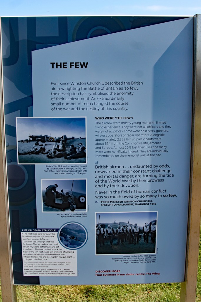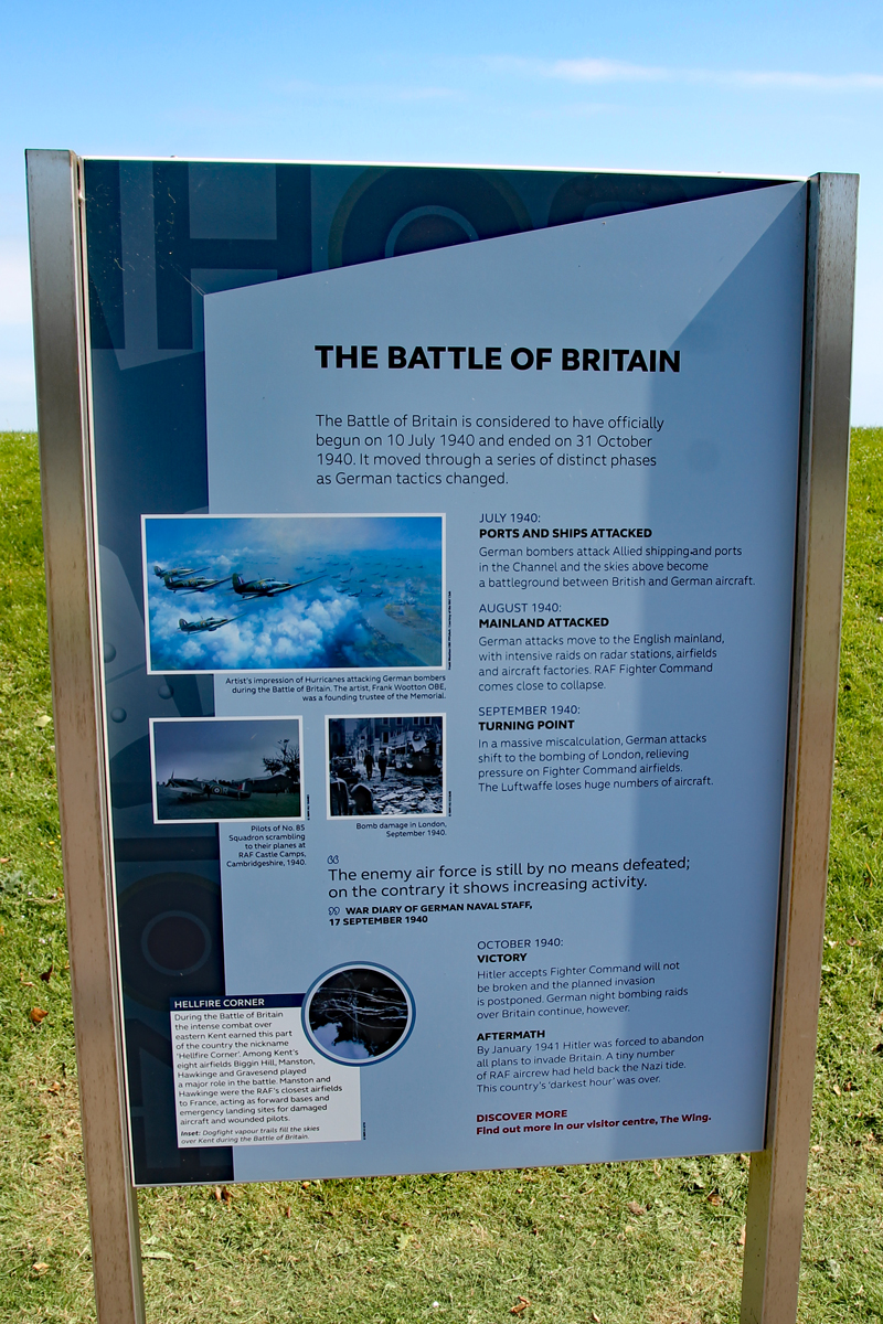Nach dem Besuch des „Battle of Britain Museums“ habe ich noch einen Abstecher zum nicht weit entfernten „Battle of Britain Memorial“ gemacht. Das Denkmal, welches den britischen Flugzeugbesatzungen, die an der Luftschlacht um England teilnahmen, gewidmet ist, befindet sich auf den Kreidefelsen von Dover bei Capel-le-Ferne. Neben der Gedenkstätte gibt es auch eine kleine Ausstellung und ein Besucherzentrum.