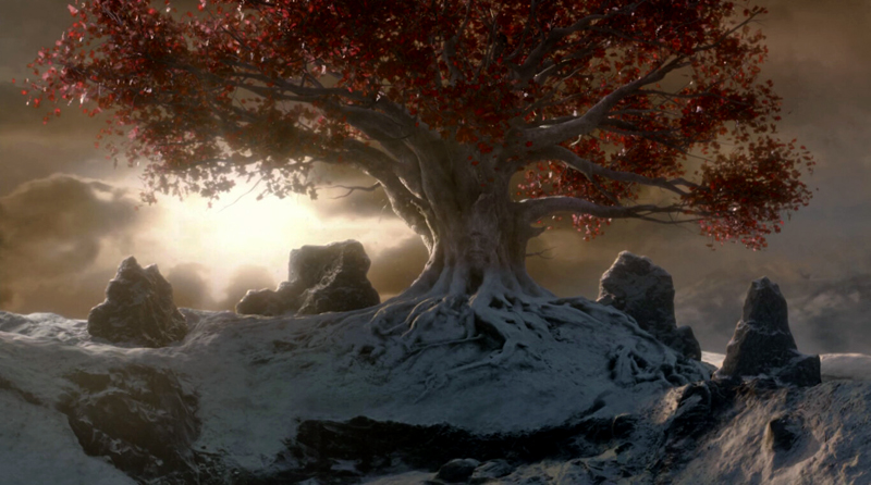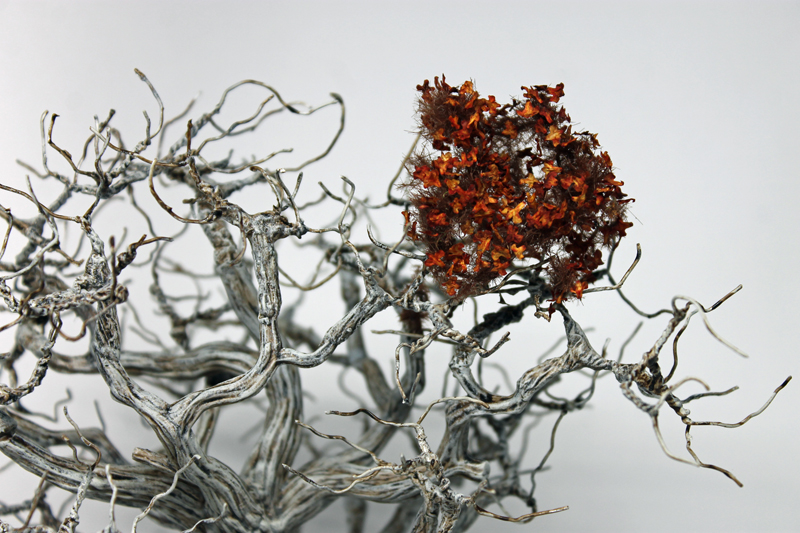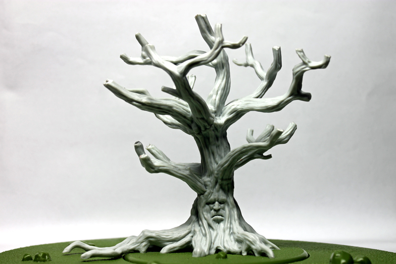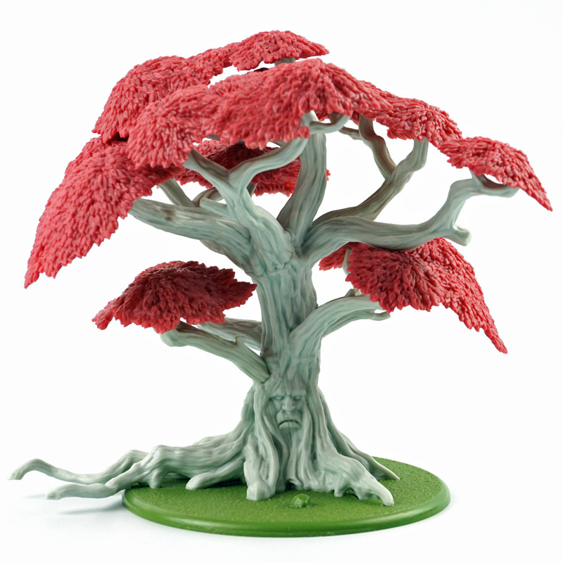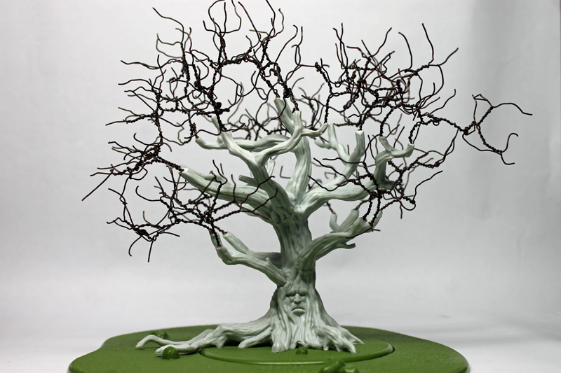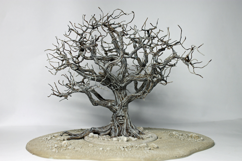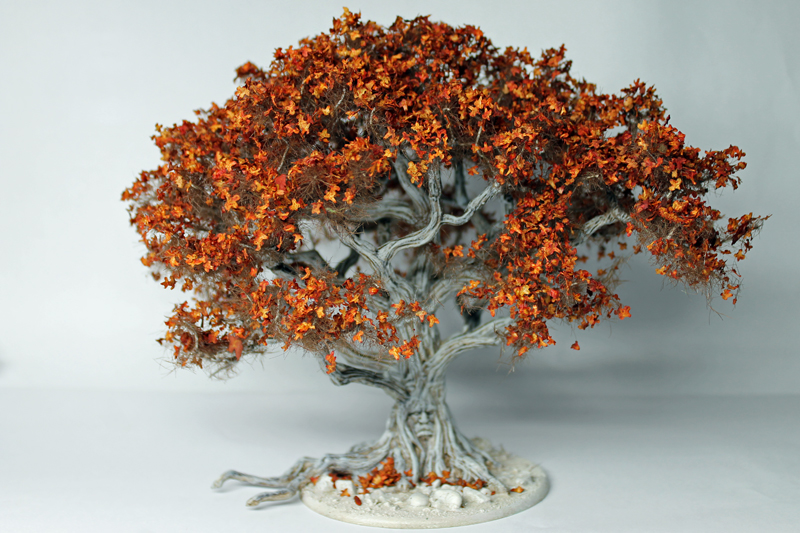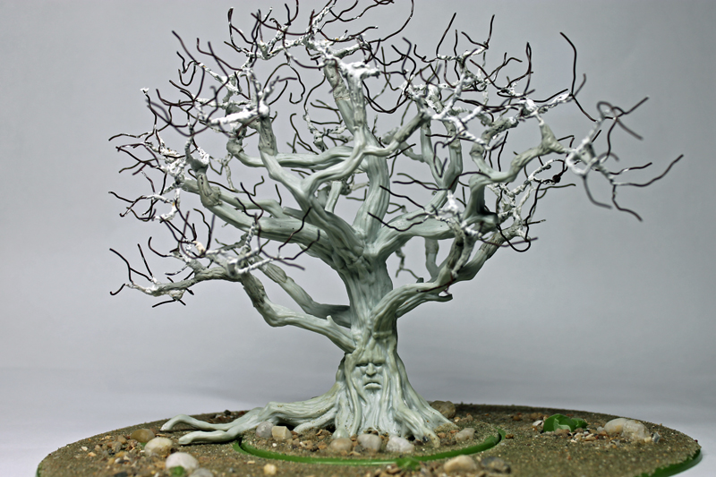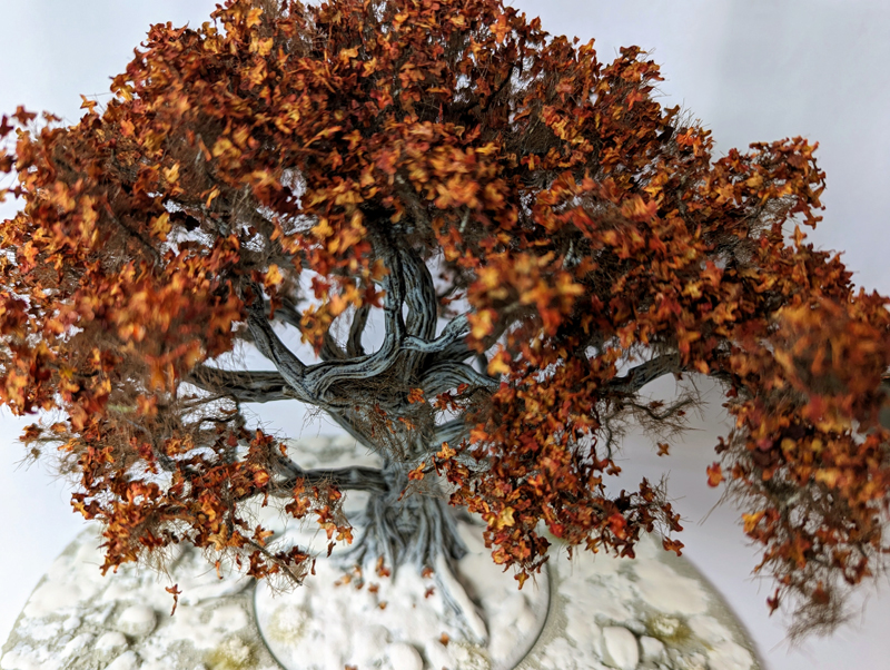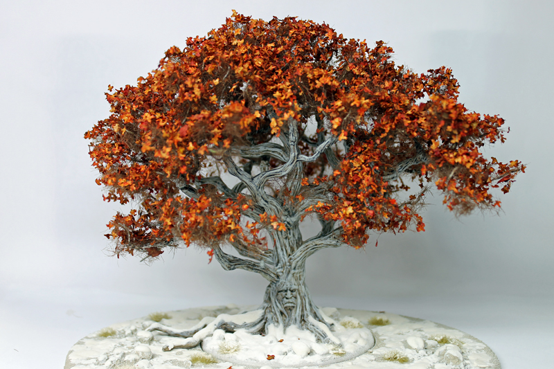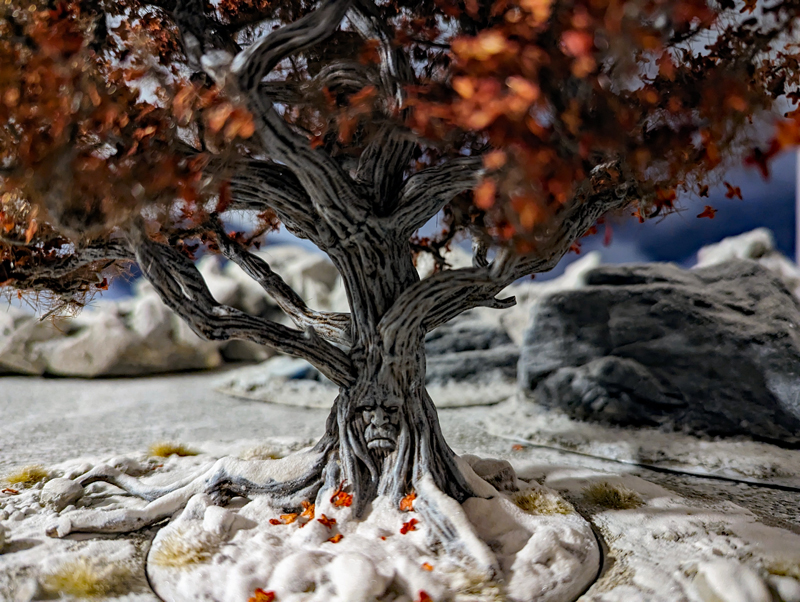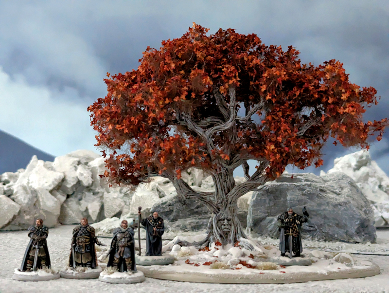 Als erstes habe ich mich an das Basteln und Bemalen eines Wehrholzbaumes gemacht. Grundlage für den Baum war das 3D Model aus dem A Song of Ice and Fire TableTop – Kickstarter, denn ich seinerzeit zusätzlich erworben hatte. Die „roten“ Blätter diese 3D Modells sind allerdings ziemlich armselig gestaltet und wurden deshalb auch von mir kurzerhand mit dem Seitenschneider entfernt. Ich habe stattdessen an die Astende selbstgebaute „Drahtäste“ gesteckt und verklebt sowie diese dann aufwendig mit Modelliermasse und Acryl ummantelt. Anschließend wurde die Grundplatte mit Sand und Kies gestaltet und alles grundiert. Während der Baumstamm und die Äste in Silbergrau bemalt wurden, haben die feinen Astende eine leicht dunkle Bemalung bekommen. So sollen Ästen und das rotbraune Blattwerk besser miteinander harmonieren. Mit dem Greenkeeper (Begrasungs-Gerät) habe ich dann mit Sprühkleber feinstes „Astwerk“ aus dunkelbraunen Grass-Streu an den Drahtenden aufgebraucht. Das war eine Methode, die ich schon häufiger bei „Drahtbaum-Profis“ gesehen hatten und immer schon einmal selbst ausprobieren wollte. Schließlich ging es an die Belaubung, bei der ich mich für große Blätter (rot-braun gefärbte Birkensamen) entschieden habe. Abschließend habe ich die Base bemalt und schließlich mit Grasbüscheln und „Modell-Schnee“ versehen.