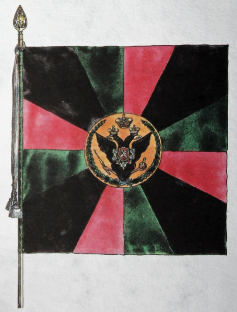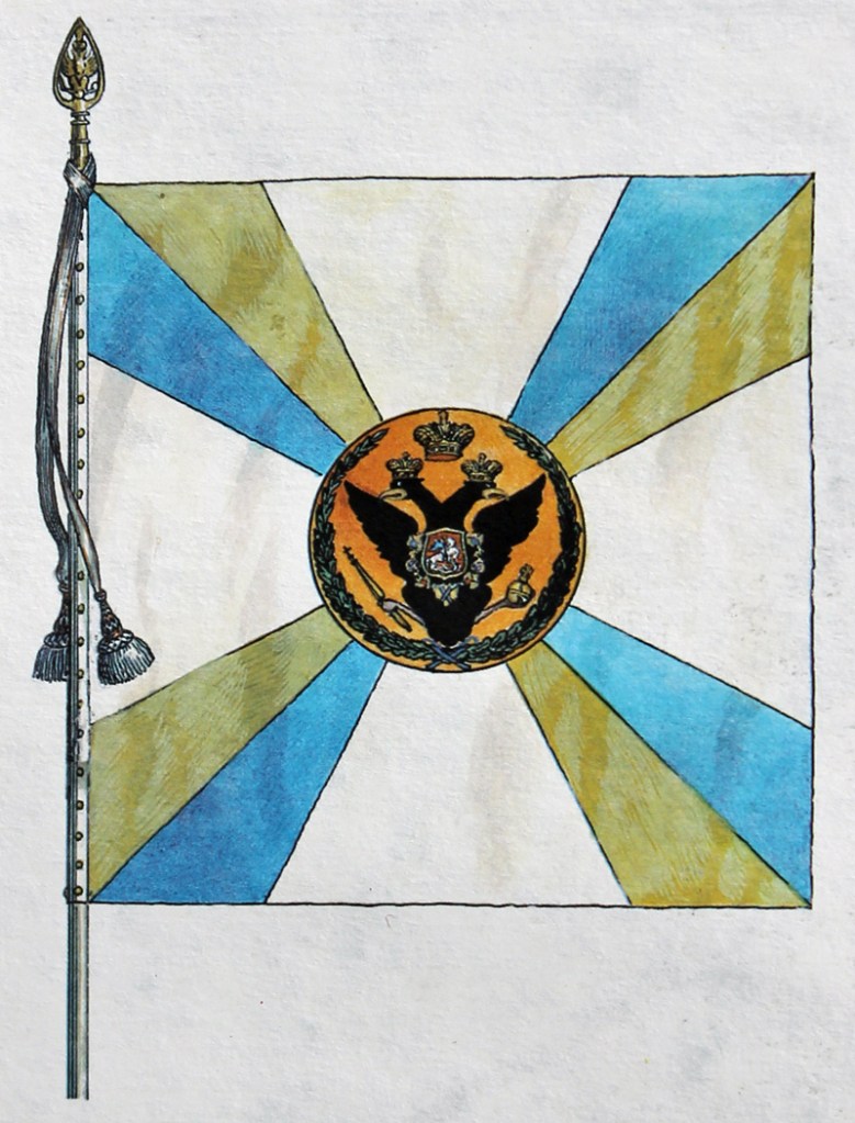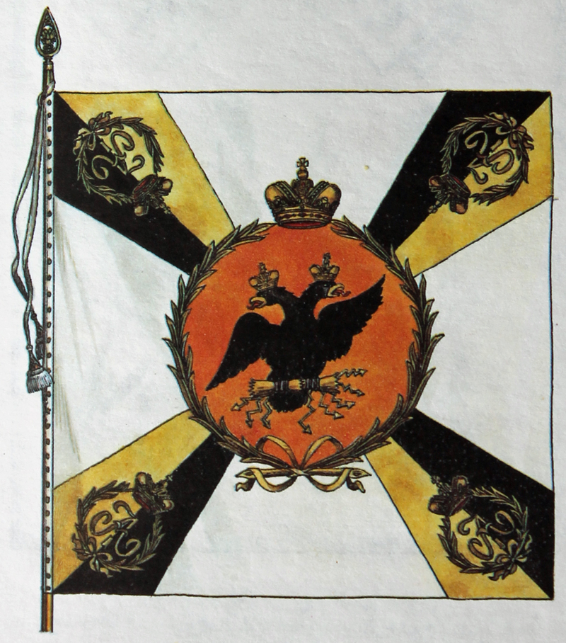 Im Jahr 1797 genehmigte Zar Paul I. neue Muster für die Fahnen der russischen Armee und in den nächsten zwei Jahren erhielt jedes Regiment eine „weiße“ Fahne, die der „Königsfarbe“ anderer europäischer Armeen entsprach, und eine „farbige“ Fahne pro Kompanie, welche mit den Bataillons- oder Regimentsfahnen anderer Armeen korrespondierte. Für die Linieninfanterie bedeutete dies, dass es pro Regiment eine weiße und neun farbige Fahnen gab. Die Fahnen waren 142 cm im Quadrat groß und wurden auf 3,15 Meter langen Fahnenstangen mit 14 cm langen Messingzwingen und 14 cm langen, speerspitzenförmigen, vergoldeten Endstücken getragen. Die Fahnenstangen waren entweder schwarz, weiß, braun oder gelb gestrichen, aber es schien zu dieser Zeit keine Vorschriften darüber gegeben zu haben, welche Einheit welche Farbe verwendete.