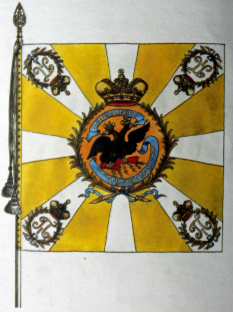 Ausführung 1797: Orangene Mittelscheibe, darin schwarzer kaiserlicher Adler mit Reichsapfel, Zepter und einem Schild auf der Brust, darin der Heilige Georg und der Drache. Über dem von einem Kranz umgebenen Adler eine Krone. Diese in Gold-, der Kranz in Grünstickerei und alles innerhalb der Mittelscheibe. Einfarbige Grundfläche mit vier „Strahlen“ in kontrastierender Farbe von der Mitte zu jeder Ecke. Die weißen Fahnen von 1797 hatten eine weiße Grundfläche mit farbigen „Strahlen“