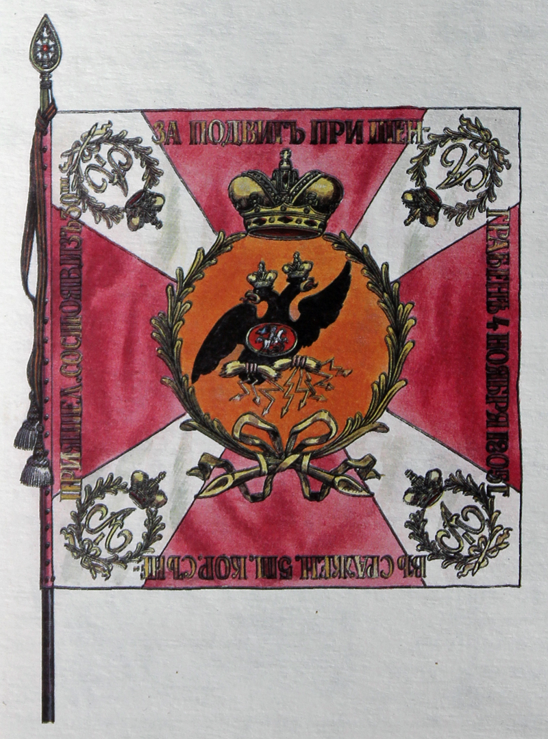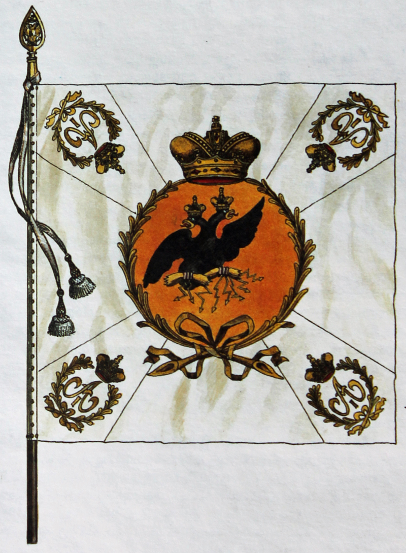 Im Jahr 1797 genehmigte Zar Paul I. neue Muster für die Fahnen der russischen Armee und in den nächsten zwei Jahren erhielt jedes Regiment eine „weiße“ Fahne, die der „Königsfarbe“ anderer europäischer Armeen entsprach, und eine „farbige“ Fahne pro Kompanie, welche mit den Bataillons- oder Regimentsfahnen anderer Armeen korrespondierte. Für die Linieninfanterie bedeutete dies, dass es pro Regiment eine weiße und neun farbige Fahnen gab. Die Fahnen waren 142 cm im Quadrat groß und wurden auf 3,15 Meter langen Fahnenstangen mit 14 cm langen Messingzwingen und 14 cm langen, speerspitzenförmigen, vergoldeten Endstücken getragen. Die Fahnenstangen waren entweder schwarz, weiß, braun oder gelb gestrichen, aber es schien zu dieser Zeit keine Vorschriften darüber gegeben zu haben, welche Einheit welche Farbe verwendete.