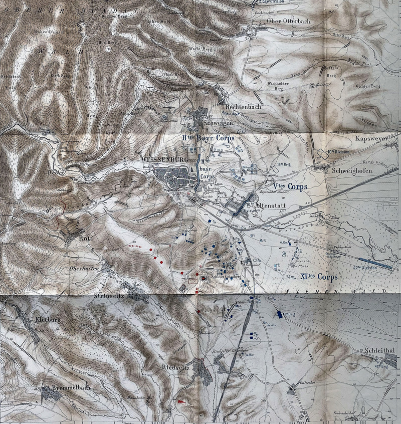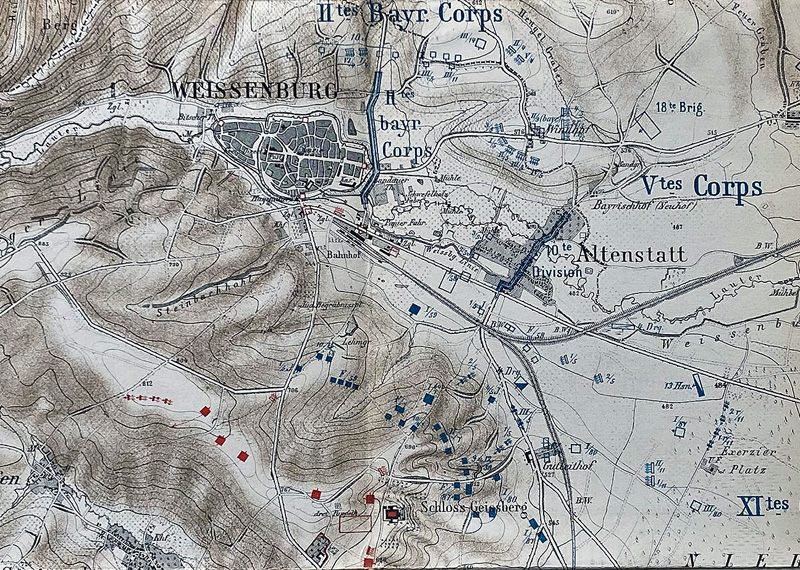 Kronprinz Friedrich Wilhelm schickte die 4. Bayerische Infanterie-Division (Teil des II. bayerischen Korps) auf die Anhöhen südlich des Ortes Schweigen, von wo aus die Bayern die Stadt von Norden her angreifen sollten. Um 8 Uhr erreichten die Truppen ihre Ausgangsstellung. Hier protzte die Artillerie ab und eröffnete das Feuer auf die Stadtbefestigungen. Beispielhaft für die Organisation der damaligen Truppenverbände ist hier Angriff-Disposition des II. bayerischen Korps aufgeführt: