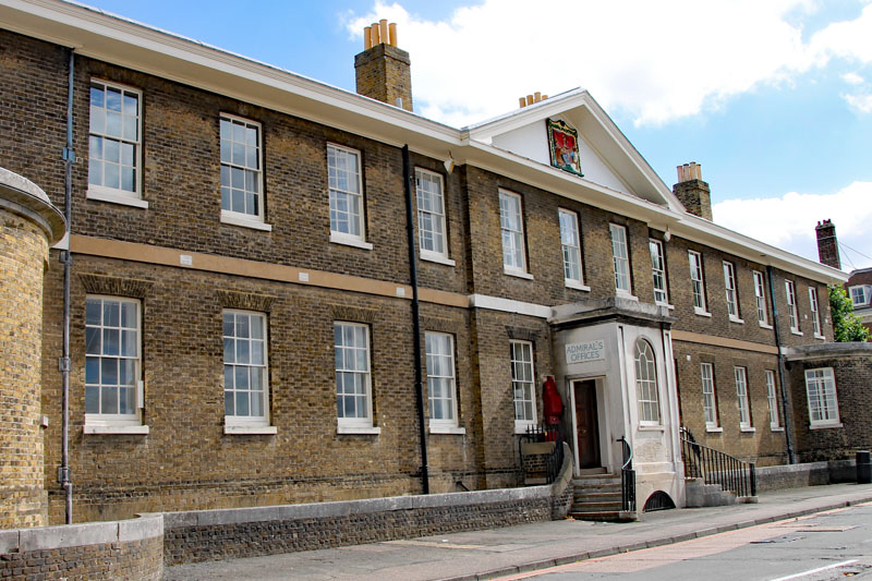 Erbaut als Bürogebäude für den Schiffsbaumeister und andere leitende Offiziere der Werft, wurde dieses Gebäude vom Architekten des Navy Board, Edward Holl, entworfen. Die Dachlinie wurde bewusst niedrig gehalten, um die Aussicht von der dahinter liegenden Offiziersterrasse nicht zu beeinträchtigen. Im Laufe des 20. Jahrhunderts wurde das Gebäude sowohl auf der Uhrturmseite als auch auf der Rückseite erweitert. Später wurde es zum Büro des Hafenadmirals. Heute haben verschiedene Unternehmen ihre Büros in dem Gebäude.
