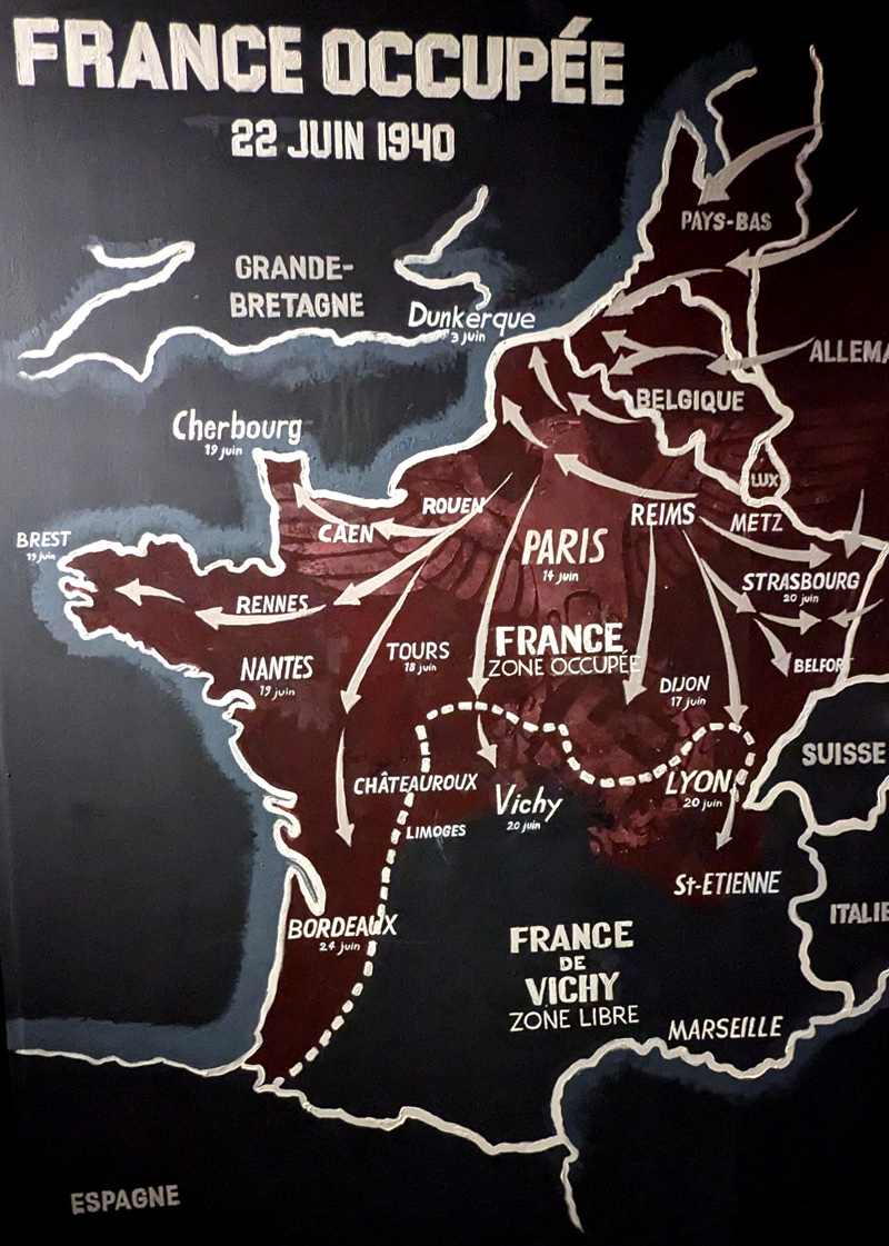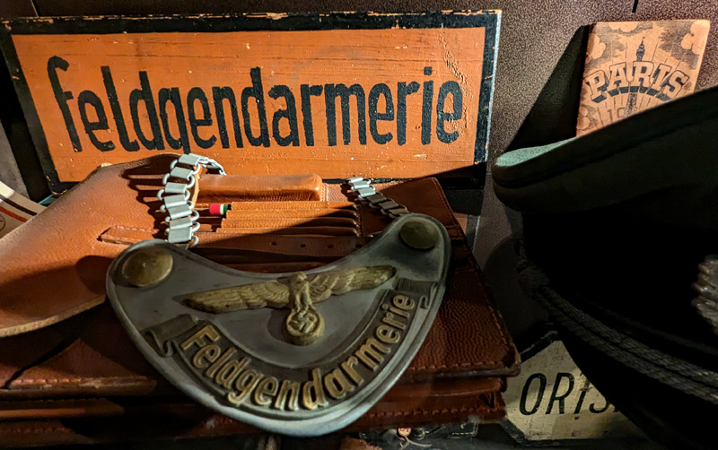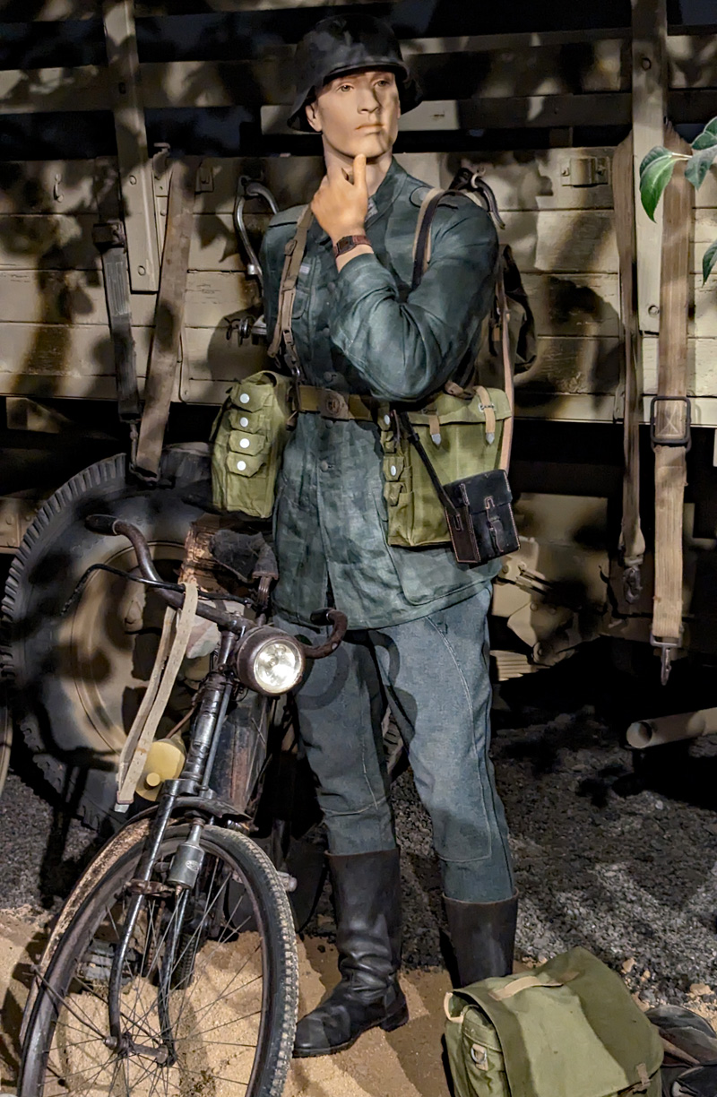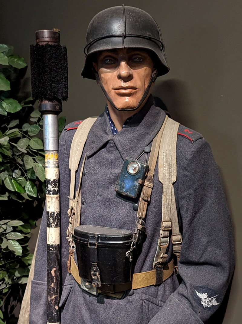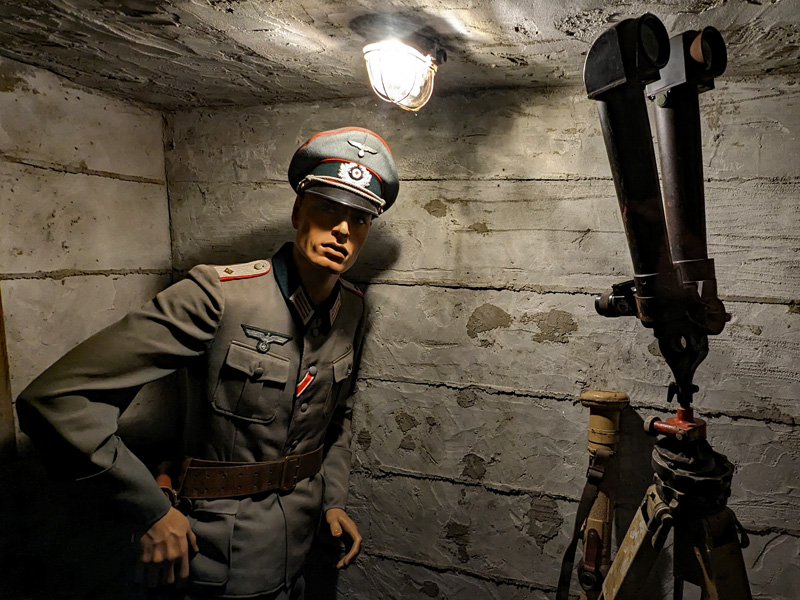 Während der Besatzungszeit wird die Küste nach und nach zum sogenannten Atlantikwall ausgebaut, also Verteidugungsanlagen, wie dieser Bunker. Der hier gezeigte deutsche Offizier gehört zur Artillerie.