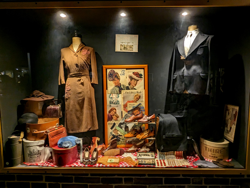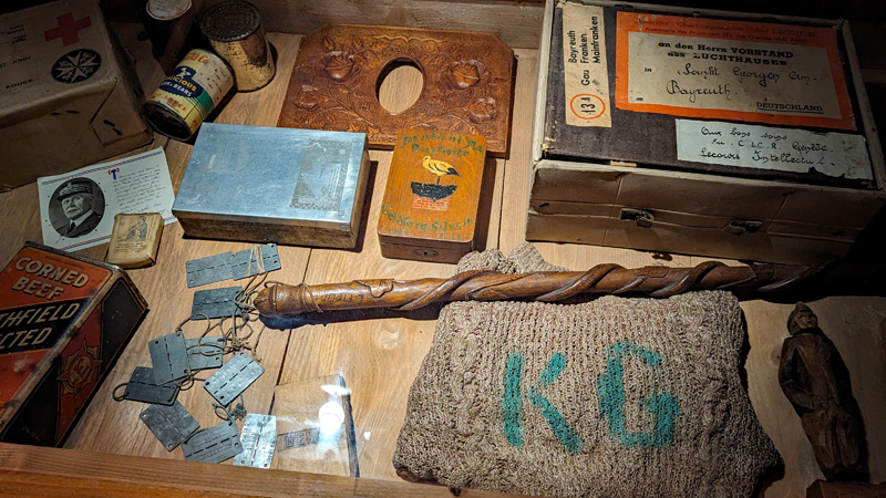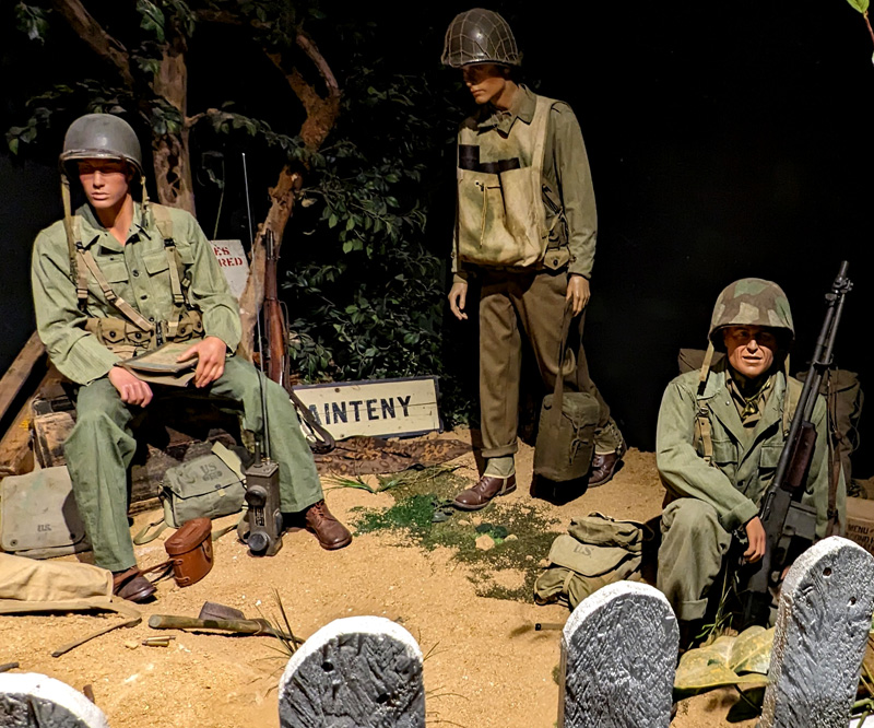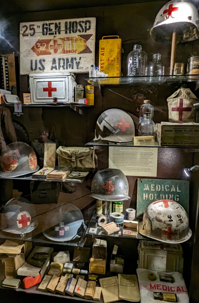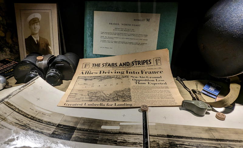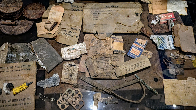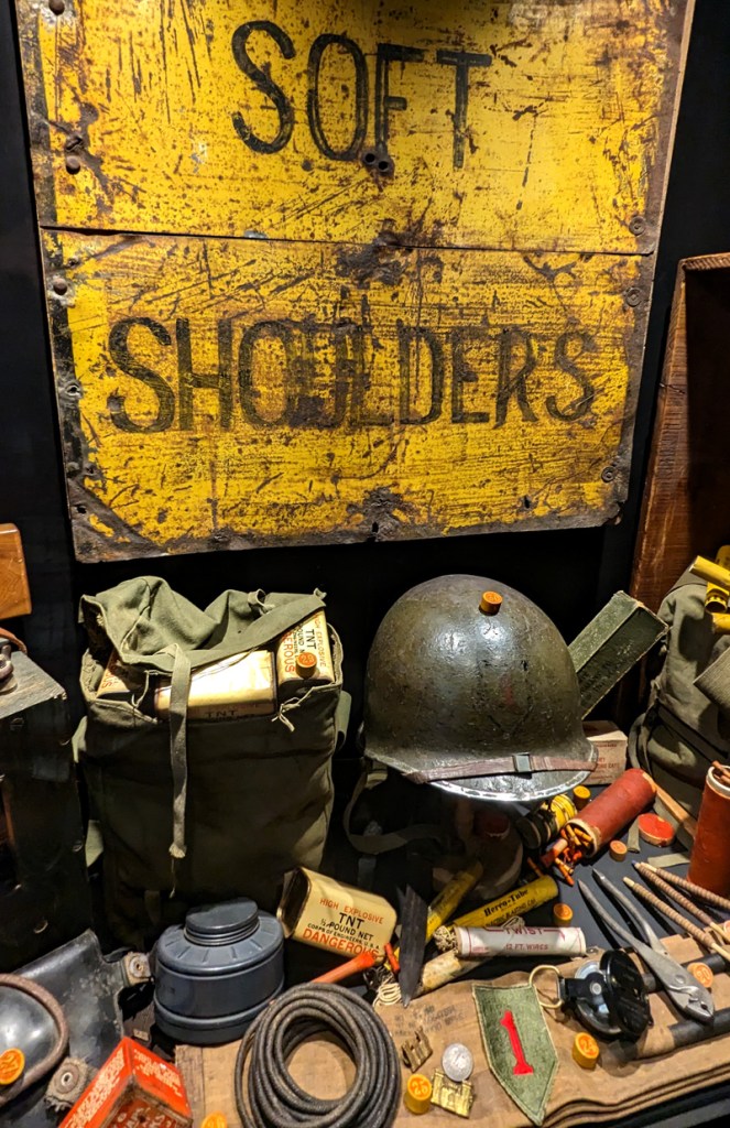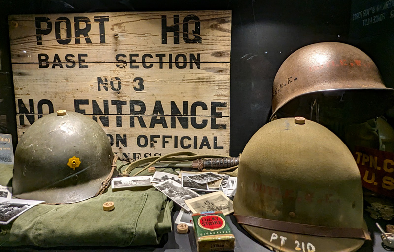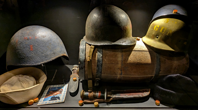 Ganz links sieht man einen MK2 Stahlhelm der US Navy, der unter dem Namen „Talker“ bekannt war und von Männern mit Kommunikationsaufgaben getragen wurde. Diese Helme waren mit einer größeren Glocke, spezieller Polsterung und integrierter Kommunikationsausrüstung ausgestattet. Auf der rechten Seite sieht man ein Fass für Trinkwasser, das zur Ausrüstung der Higgins-Landungsboote gehörte.