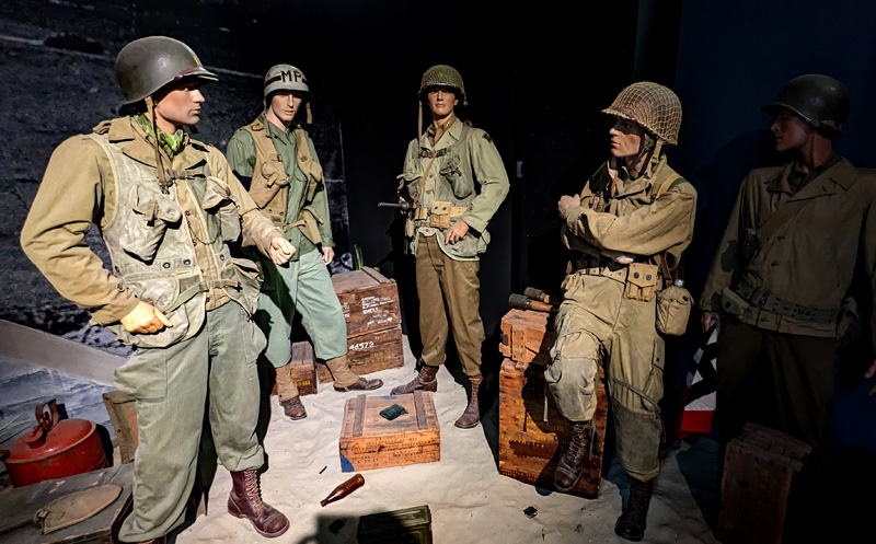 Ein Großteil der Exponate ist, wie es heutzutage in vielen modernen Museen üblich ist, in lebensgroße Dioramen integriert. Die 27 Dioramen behandeln die verschiedenen Phasen der Kämpfe in der Normandie, angefangen bei der ersten Besatzung durch die deutsche Wehrmacht bis hin zu den letzten Gefechten im Rahmen der Operation Cobra. Die Ausstellung wird durch Filme sowie Licht- und Toneffekte unterstützt, um den Besuchern ein eindringliches Erlebnis zu bieten.