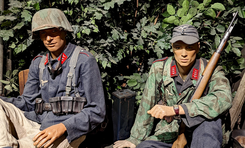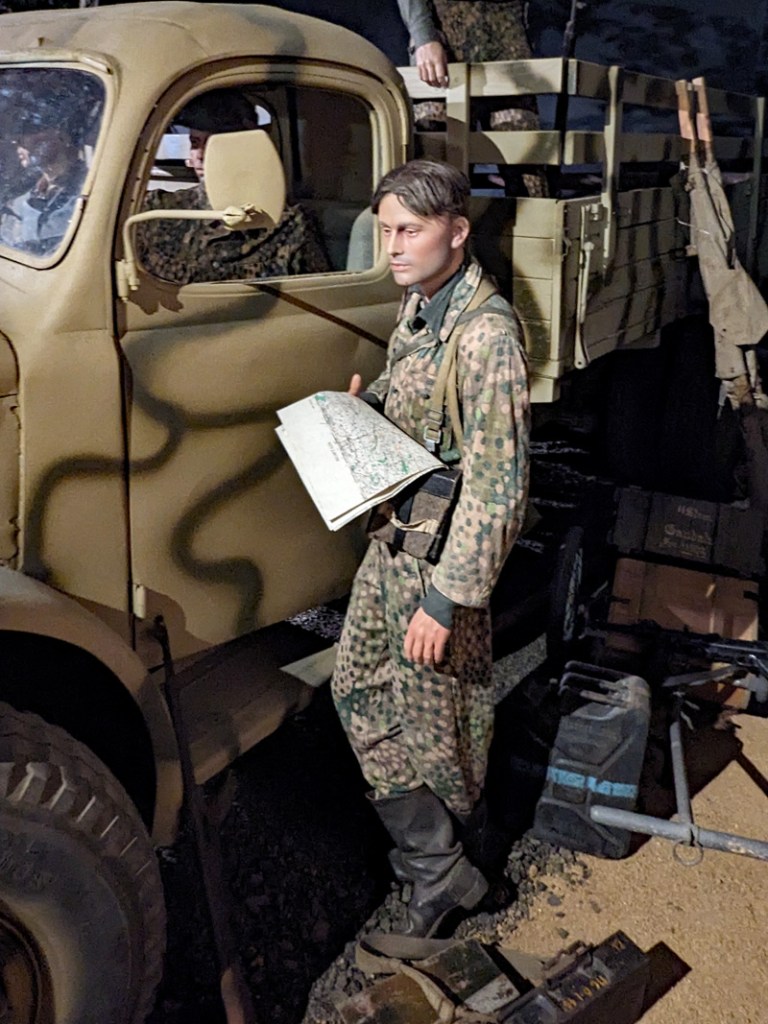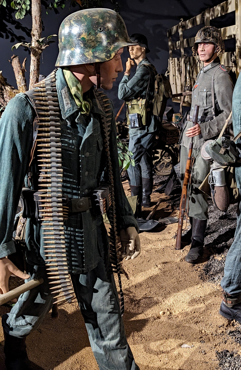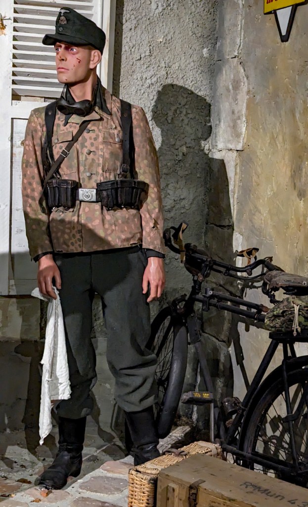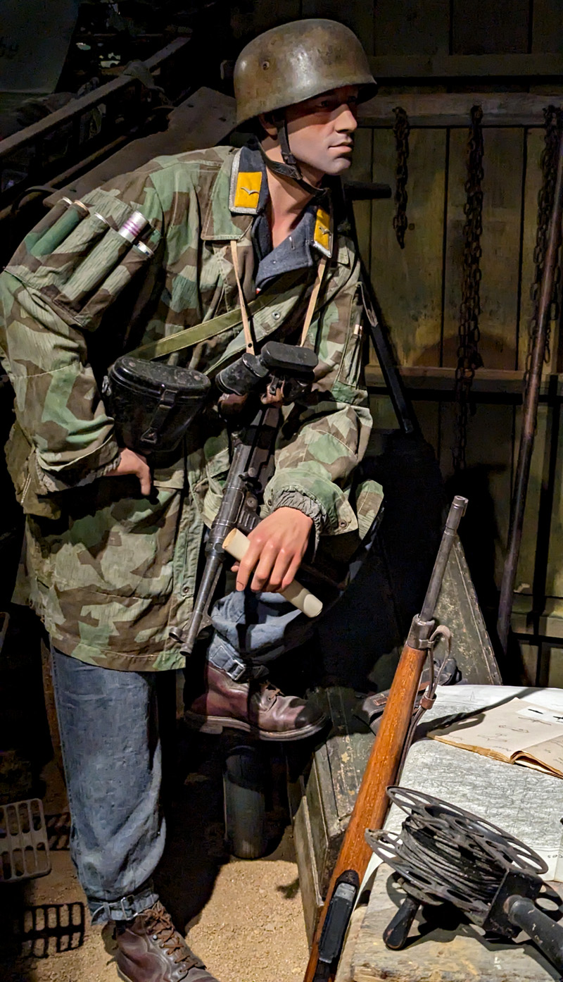 Auch die US-Truppen verwendeten in der Normandie Uniformen mit Tarnmuster (Figur links), aber weil die Träger oft mit feindlichen SS-Truppen (Figur rechts) verwechselt und aus diesem Grund Opfer von „friendly fire“ wurden, verbannte man die Tarn-Ausrüstung aus dem europäischen Kampfgebiet.