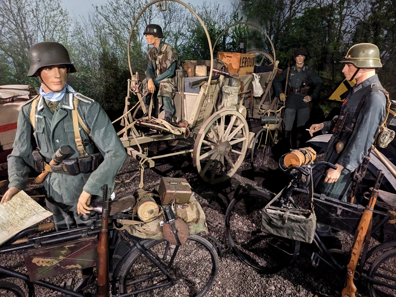 Den deutschen Truppen mangelte es häufig an motorisierten Fahrzeugen und Treibstoff. Deshalb wurden häufig Pferdegespanne und Fahrräder eingesetzt.