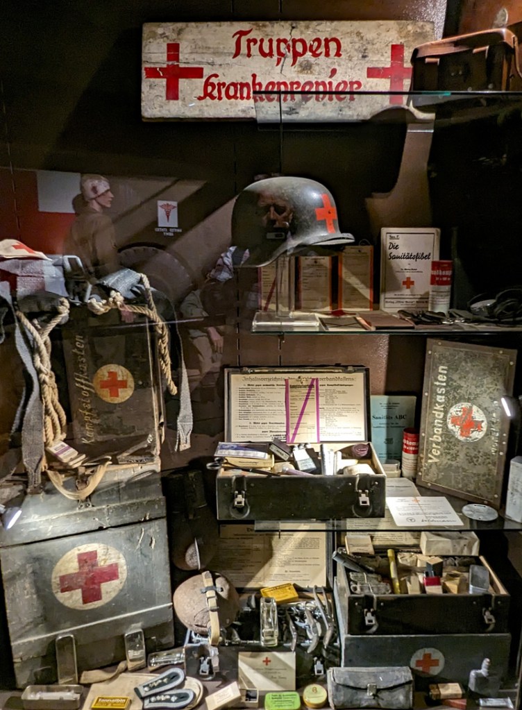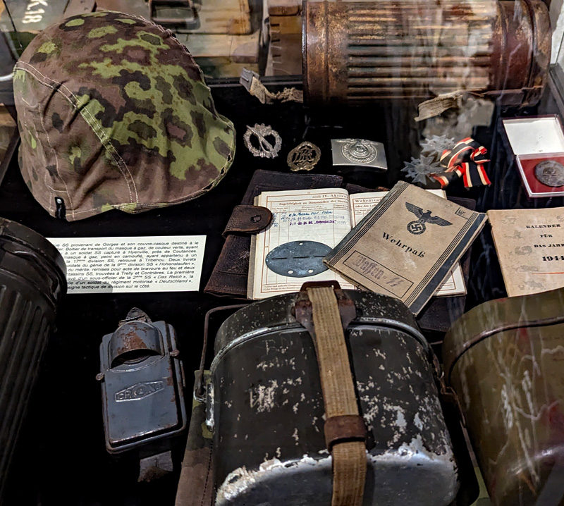 In der Mitte des Bildes befindet sich der Helm eines Naval Beach Battalions der US-Streitkräfte. Diese Einheiten hatten die wichtige Aufgabe, die Organisation und Kontrolle der Strände zu gewährleisten, an denen die Truppen landeten. Sie waren verantwortlich für die Koordination des Verkehrs der Landungsboote und dafür zu sorgen, dass Truppen, Fahrzeuge und Ausrüstung sicher an Land kamen.