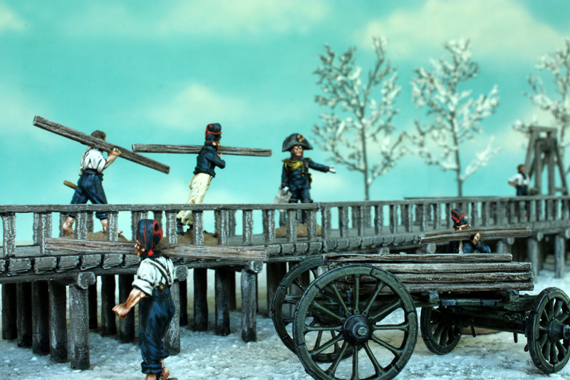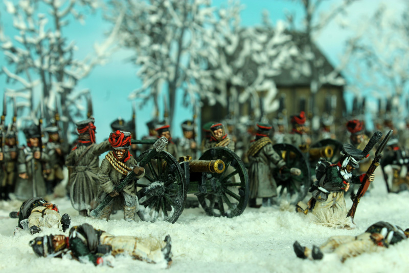 Nun habe ich auch die zweite von den geplanten drei russischen Kolonnen für das Projekt „Die Eisfestung“ begonnen. Neu bemalt sind bisher 1 komplette und eine halbe Grenadier-Einheit, eine kleine Einheit Husaren, eine kleinen Einheit Kosaken, eine Kommandeurs-Base, eine Artillerie-Base sowie einige Tote und Verwundete. Zusätzlich ist die Kommando-Base des Oberbefehlshabers Bennigsen fertiggestellt. Und auch bei den Geländeteile geht es langsam voran. Ein Teil des Wilhelmsburger-Brückenweges und das Wilhelmsburger Amtshaus sind fertiggestellt. Es gibt außerdem eine kleine Einheit von französischen Pionieren, welche die Brücke instandsetzen (durch Eisgang und Tidenhub kam es immer wieder zu Beschädigungen an der Brücke). Bei den Figuren handelt es sich um Perry Miniatures und Figuren von Wargames Foundry. Die Toten und Verwundeten sind aber von dem Hersteller Front Rank. Wie schon erwähnt, verwende ich Wargames Foundry und Front Rank, da ich zu Beginn des Projektes eine großzügige Figuren-Spende erhalten hatte (noch einmal tausend Dank an Stefan Kruse!).