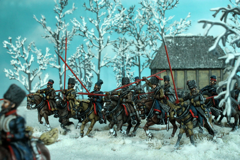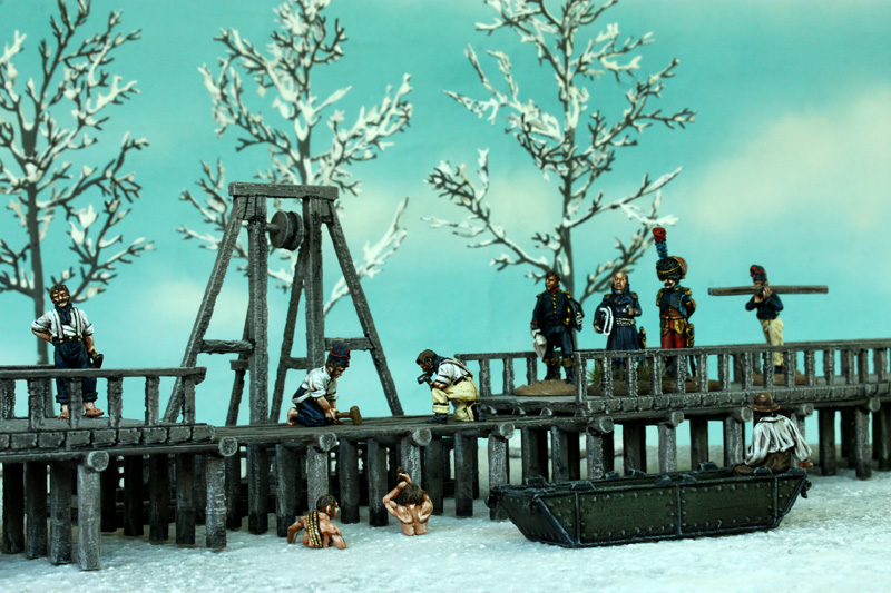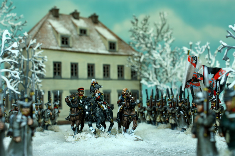 Nun habe ich auch die zweite von den geplanten drei russischen Kolonnen für das Projekt „Die Eisfestung“ begonnen. Neu bemalt sind bisher 1 komplette und eine halbe Grenadier-Einheit, eine kleine Einheit Husaren, eine kleinen Einheit Kosaken, eine Kommandeurs-Base, eine Artillerie-Base sowie einige Tote und Verwundete. Zusätzlich ist die Kommando-Base des Oberbefehlshabers Bennigsen fertiggestellt. Und auch bei den Geländeteile geht es langsam voran. Ein Teil des Wilhelmsburger-Brückenweges und das Wilhelmsburger Amtshaus sind fertiggestellt. Es gibt außerdem eine kleine Einheit von französischen Pionieren, welche die Brücke instandsetzen (durch Eisgang und Tidenhub kam es immer wieder zu Beschädigungen an der Brücke). Bei den Figuren handelt es sich um Perry Miniatures und Figuren von Wargames Foundry. Die Toten und Verwundeten sind aber von dem Hersteller Front Rank. Wie schon erwähnt, verwende ich Wargames Foundry und Front Rank, da ich zu Beginn des Projektes eine großzügige Figuren-Spende erhalten hatte (noch einmal tausend Dank an Stefan Kruse!).