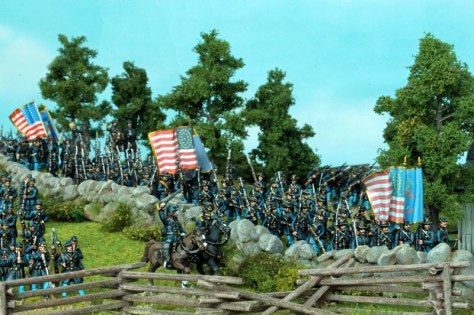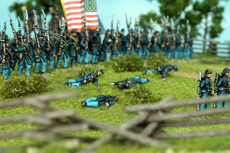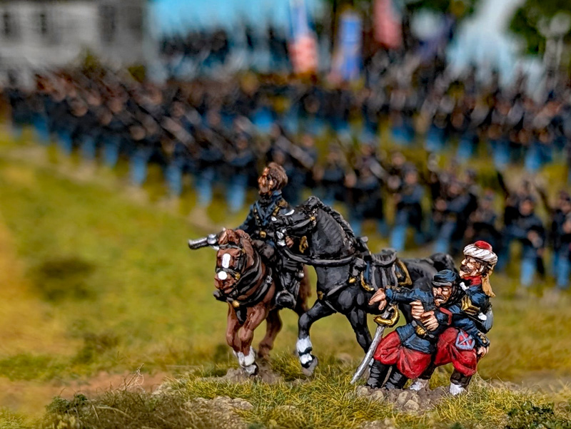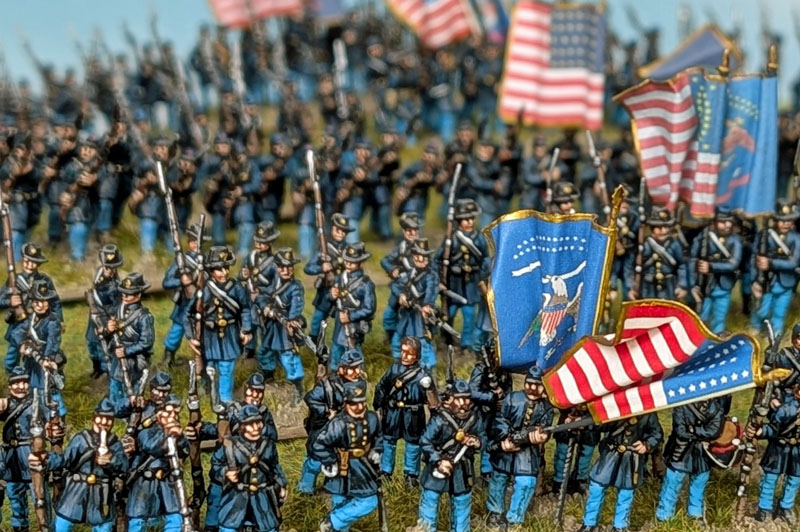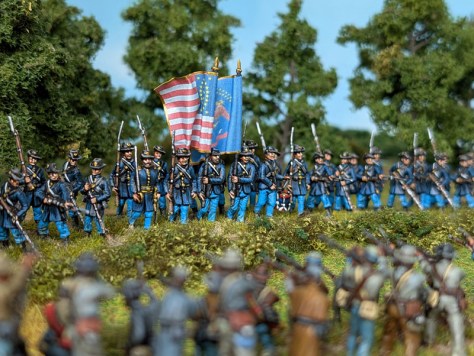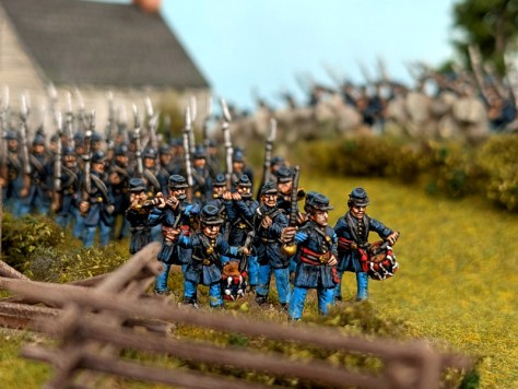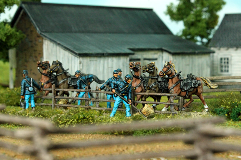 Passend zur Leister Farm bzw. Meades Headquarter aus meinem letzten Bericht, habe ich eine kleine Generalstab-Szene aus den Figuren des Strelets-Sets Set 046 „Union General Staff (1)“ zusammengestellt. Eine andere Szene soll ein paar frisch angepflockte Pferde der US-Kavallerie zeigen, die gerade mit Wasser und Heu versorgt werden. Die Figuren dazu stammen aus ganz unterschiedlichen Sets, wie dem IMEX-Set 503 „Union Cavalry“. Die Zäune sind aus dem IMEX-Set 519 „Battlefield Accessories“ entnommen. Da ich schon eine Musik-Kapelle der Konföderierten bemalt hatte, benötigte ich natürlich auch eine solche für die Union. Die Figuren dafür stammen hauptsächlich aus dem Strelets-Sets Set 046 „Union General Staff (1)“. Vier Marker für „Tote und Verwundete“ sind aus Figuren der verschiedenen Strelets-Infantry-Sets entstanden. Meine neue Kommandobase zeigt einen vom Pferd gestürzten Kommandeur eines Zuaven-Regiments. Zu guter Letzt, gibt es eine neue Einheit Unions-Infanterie, Es ist die Iron Brigade, mit ihren charakteristischen schwarzen Hüten. Die Einheit ist aus Figuren des A Call To Arms-Set 60 „Union Regiments“ (leider haben diese Figuren den Aufschlag bei den „Hardee hats“ auf der falschen Seite) sowie den HaT-Sets 8319 und 8332 American Civil War Marching (1 + 2) entstanden. Für die Union fehlen jetzt für mein erstes Szenario nur noch 1 Einheit Kavallerie (sowohl auf- als auch abgesessen), 2 Einheiten Infanterie, 1 Kommando-Base, 1 Artillerie-Base und einige weitere Tote und Verwundete. Auf Seiten der Konföderierten benötige ich noch mindestens 2 (besser 4) weitere Infanterie-Einheiten, 1 Kommando-Base und 1 Artillerie-Base.