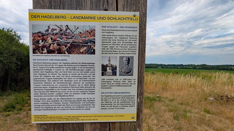Der Fläming ist ein Höhenzug im südwestlichen Brandenburg und östlichen Sachsen-Anhalt. Die höchste Erhebung dieser hügeligen und waldreichen Region ist der 200 m hohe Hagelberg. Hier fand am 27. August 1813 die gleichnamige Schlacht statt. Ich hatte im Rahmen einer TableTop-Präsentation schon einmal über diese Kampfhandlung berichtet, doch nun war ich tatsächlich vor Ort und möchte deshalb etwas näher auf diese Schlacht eingehen.