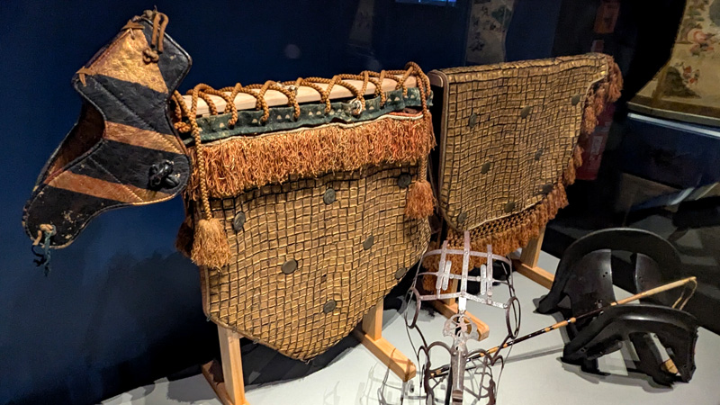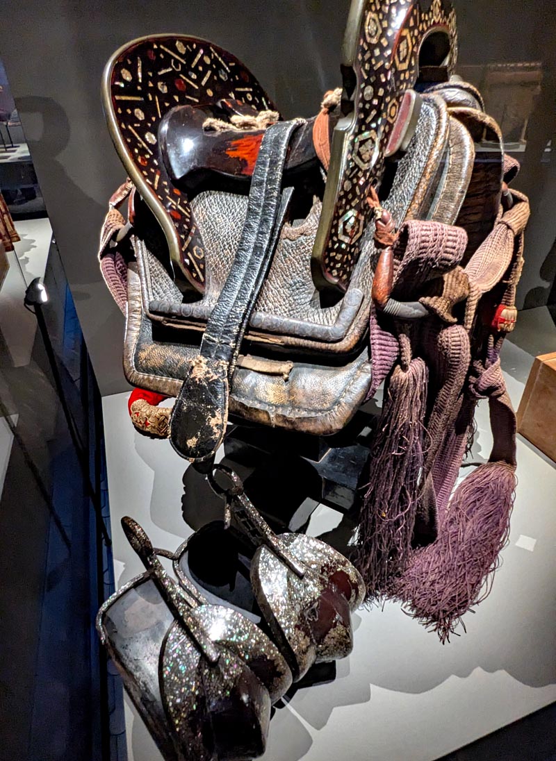 Das Goldlacksattel mit Steigbügeln (Edo-Zeit, 1615-1868): Dieses prunkvolle Objekt zeugt vom Reichtum und der Ästhetik der Samurai auch außerhalb des direkten Kampfgeschehens. Die Technik des Goldlackierens („Nashiji“) macht es zu einem besonderen Blickfang.