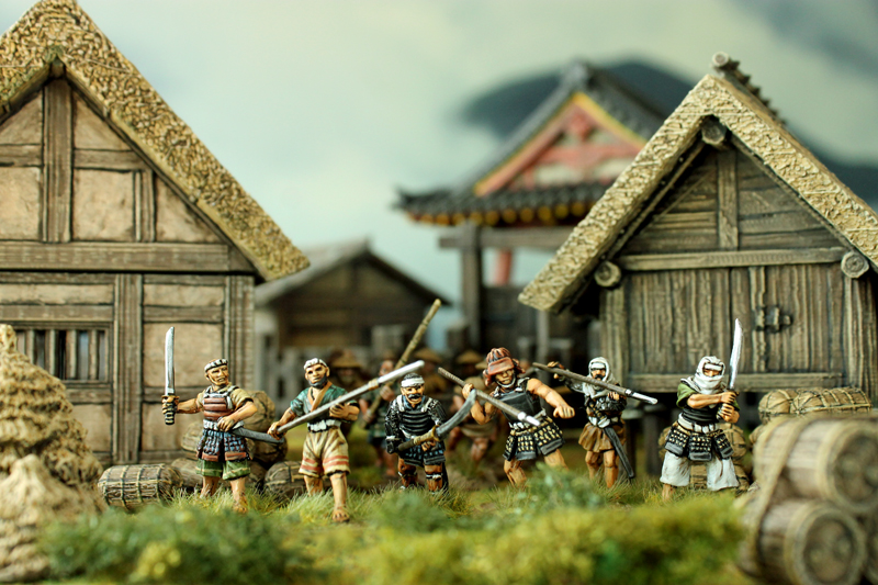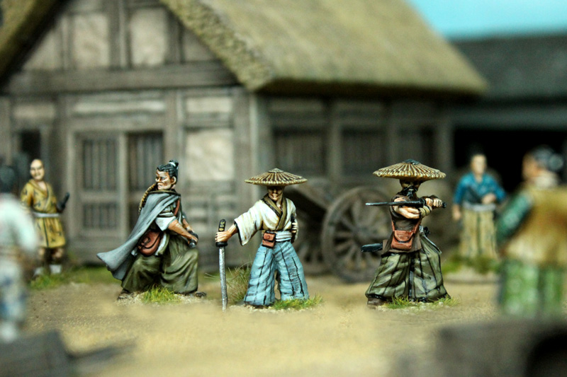 Gunnar hat sich vorgenommen seine Sieben Samurai, Ronin und Banditen ins Feld zu führen. In einem kleinen, malerischen Dorf sollen Szenarien aus den Kurosawa-Klassikern ausgetragen werden. Hier geht es also um wahre Helden und finstere Schurken, die mordend und plündernd über die Spielplatte ziehen. Zum Glück hat Gunnar schon jede Menge Figuren und Geländeteile bemalt und auch ich kann meine bereits bemalten Dorfgebäude beisteuern. Wir müssen also hauptsächlich an einer Geländeplatten und den Szenarien arbeiten. Auch bei dieser Präsentation soll das Regelwerk „Test of Honour“ verwendet werden.
