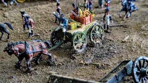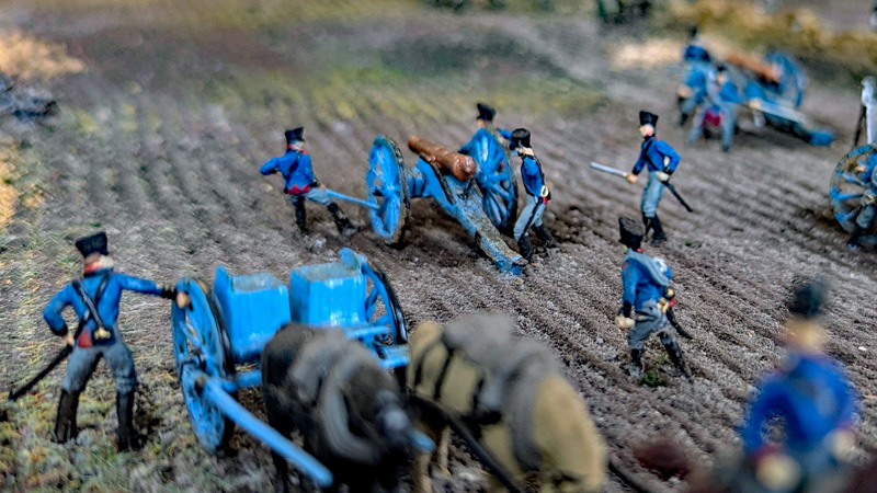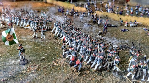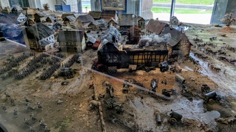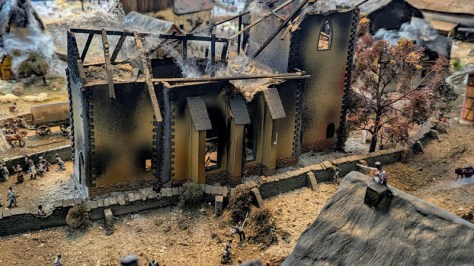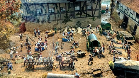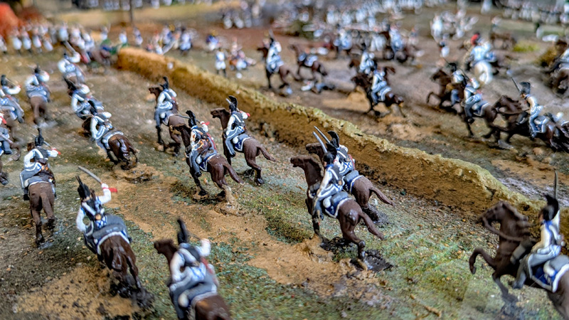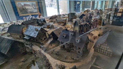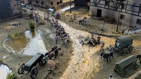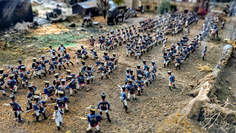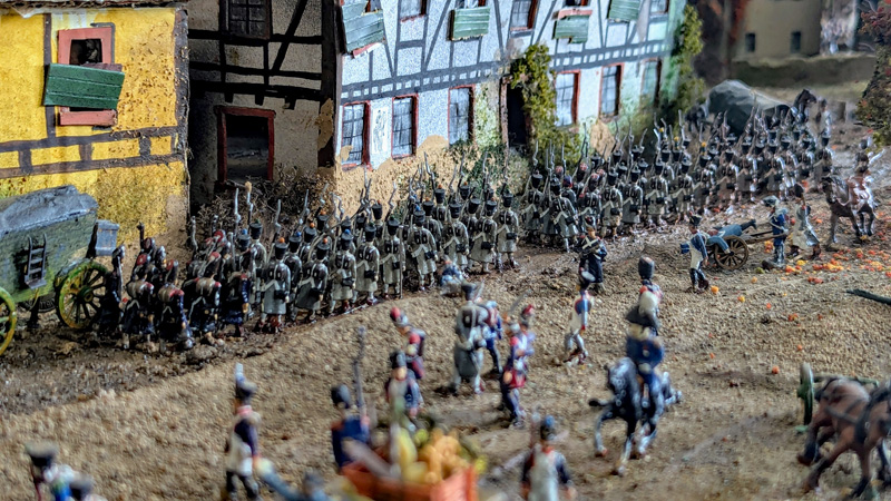 Normalerweise bin ich bei Dioramen dieser Art nicht besonders kritisch – erst recht nicht, wenn sie in meinem Lieblingsmaßstab 1:72 umgesetzt sind. Bei einem so renommierten und sicherlich auch finanzstarken Museum müssen jedoch einige kritische Anmerkungen erlaubt sein. Zwar handelt es sich bei den dargestellten Kampfhandlungen um eine der Schlüsselszenen der Völkerschlacht, und mir ist bewusst, dass sich die historischen Ereignisse genau an dem Ort zutrugen, an dem heute Museum und Völkerschlachtdenkmal stehen. Dennoch existiert mit dem Diorama im Zinnfiguren-Museum Torhaus Dölitz bereits eine deutlich größere und aus meiner Sicht überzeugendere Darstellung eines vergleichbaren Sujets.