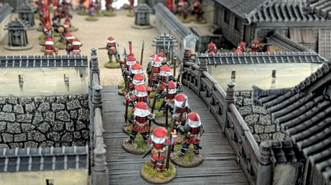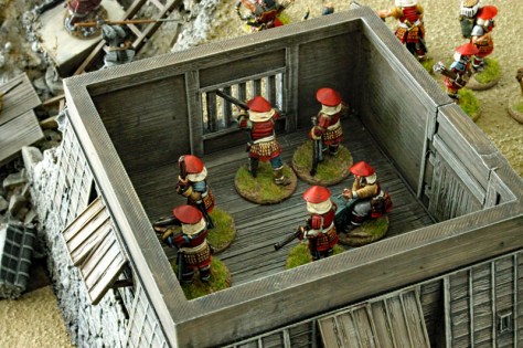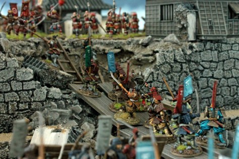 Die gesamte Burganlage ist ein 3D-Druck des Herstellers 3DAlien Worlds, der im Bereich feudales Japan die mit Abstand beste Auswahl bietet. Die Figuren stammen zum größten Teil von Perry Miniatures (meine Figuren) und von Old Glory (Vasas Figuren). Ich habe für dieses Projekt meine bisher bemalte Truppe deutlich erweitern können. Mittlerweile kann ich zumindest teilweise drei Clans ins Feld führen. Ziel ist es, diese drei Clans auch in Feldschlachten als eine große Armee einsetzen zu können.
