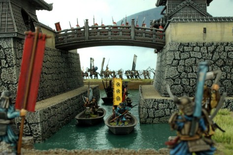 Mittlerweile ist die Spielplatte fertiggestellt. Beim Bau habe ich mich an ein wenig an das Layout der feudalen Burganlage von Hiroshima gehalten. Auch diese Burg besaß eine vorgelagerte große Toranlage im Südwesten, die von einem Wassergraben umgeben war. Neben dem großen Tor, das über eine Brücke erreichbar ist, gibt es auf unsere Spielplatte auch noch einen kleinen Hintereingang mit Bootsanleger und eine große Bresche, die im Laufe der Belagerung geschlagen wurde. Somit kann der Angreifer versuchen, den Burghof auf drei verschiedenen Wegen zu erreichen.