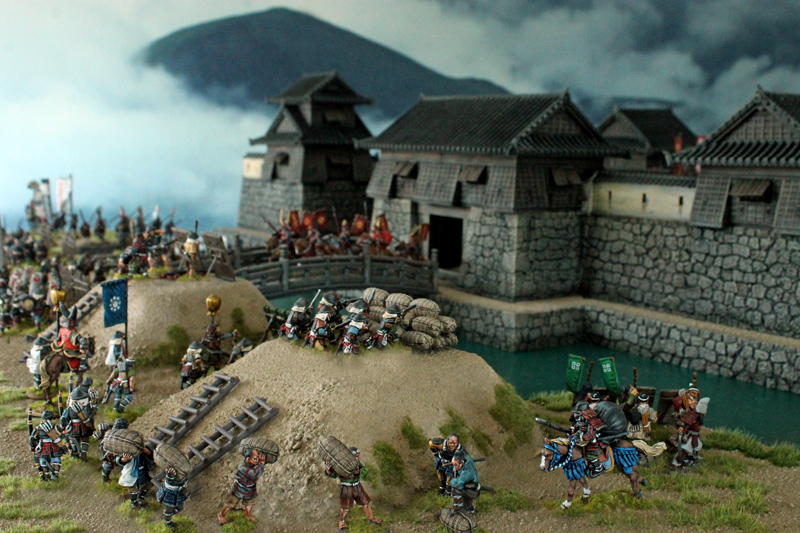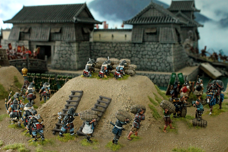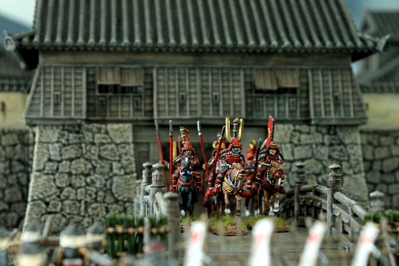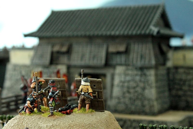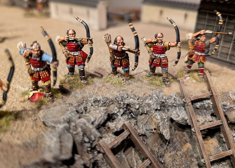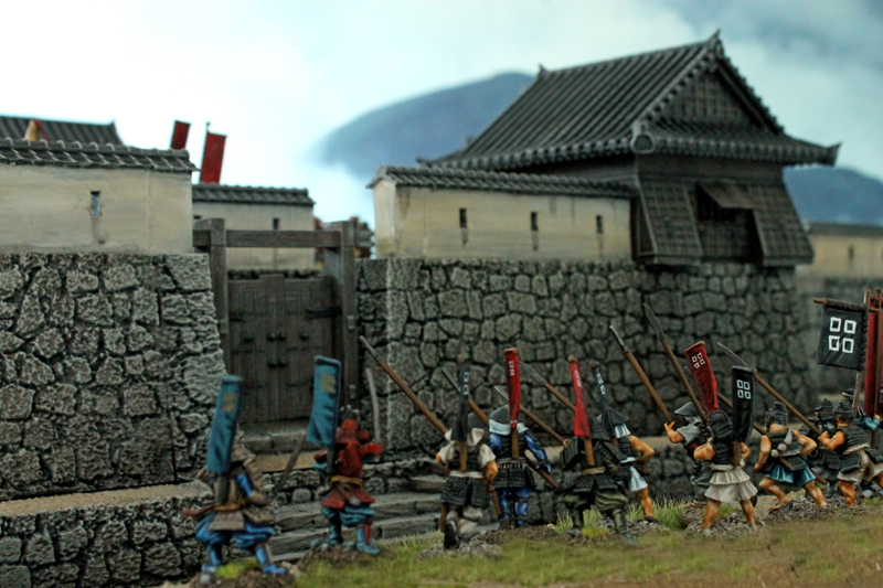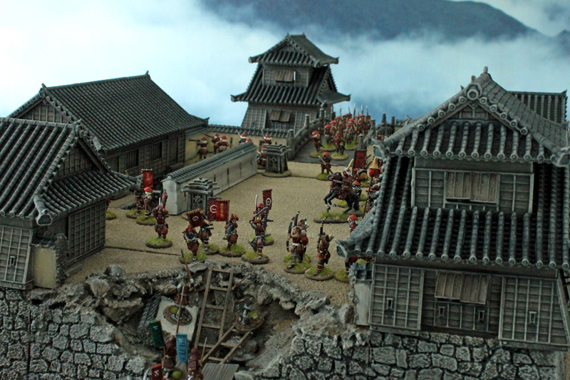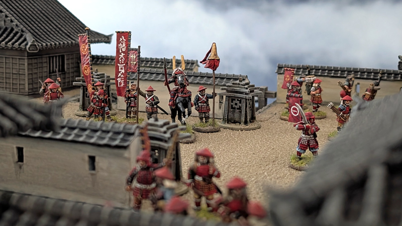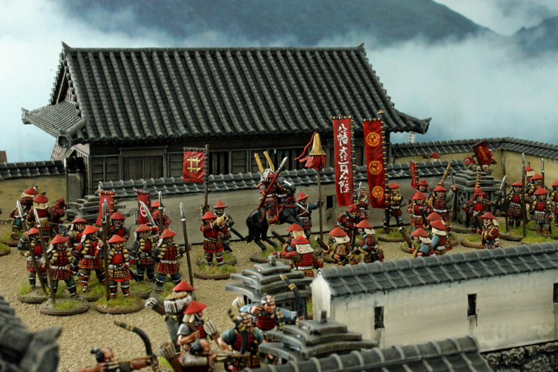 Die gesamte Burganlage ist ein 3D-Druck des Herstellers 3DAlien Worlds, der im Bereich feudales Japan die mit Abstand beste Auswahl bietet. Die Figuren stammen zum größten Teil von Perry Miniatures (meine Figuren) und von Old Glory (Vasas Figuren). Ich habe für dieses Projekt meine bisher bemalte Truppe deutlich erweitern können. Mittlerweile kann ich zumindest teilweise drei Clans ins Feld führen. Ziel ist es, diese drei Clans auch in Feldschlachten als eine große Armee einsetzen zu können.