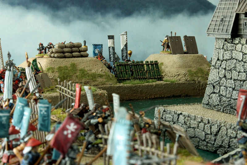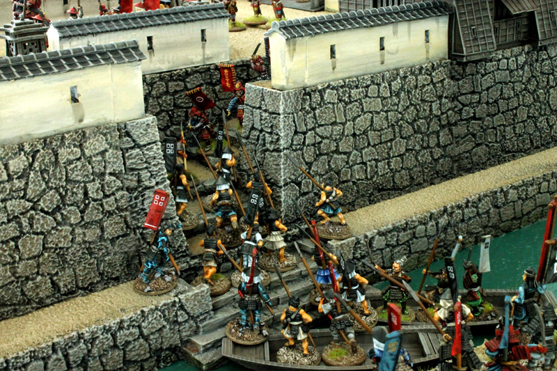Mittlerweile ist die Spielplatte fertiggestellt. Beim Bau habe ich mich an ein wenig an das Layout der feudalen Burganlage von Hiroshima gehalten. Auch diese Burg besaß eine vorgelagerte große Toranlage im Südwesten, die von einem Wassergraben umgeben war. Neben dem großen Tor, das über eine Brücke erreichbar ist, gibt es auf unsere Spielplatte auch noch einen kleinen Hintereingang mit Bootsanleger und eine große Bresche, die im Laufe der Belagerung geschlagen wurde. Somit kann der Angreifer versuchen, den Burghof auf drei verschiedenen Wegen zu erreichen.