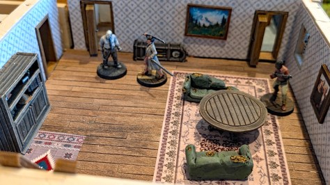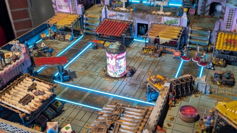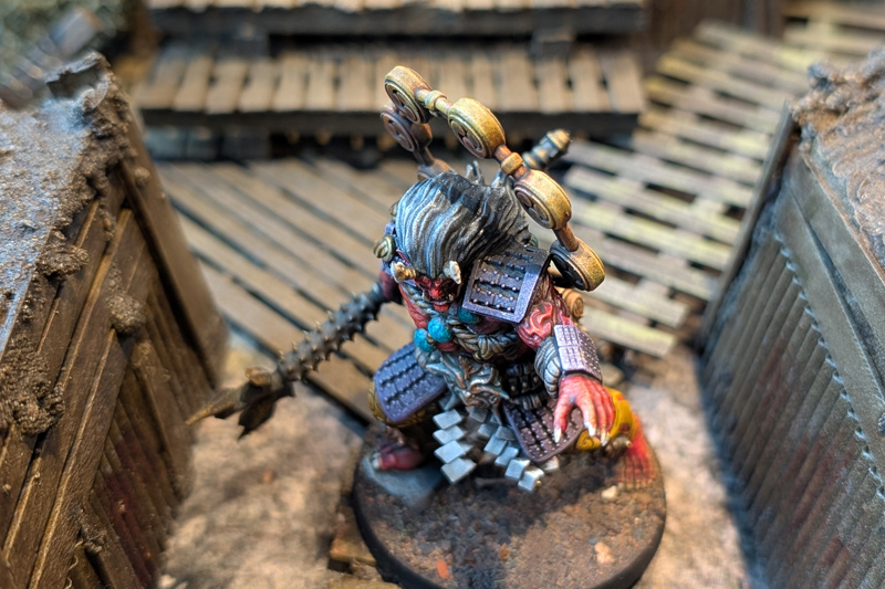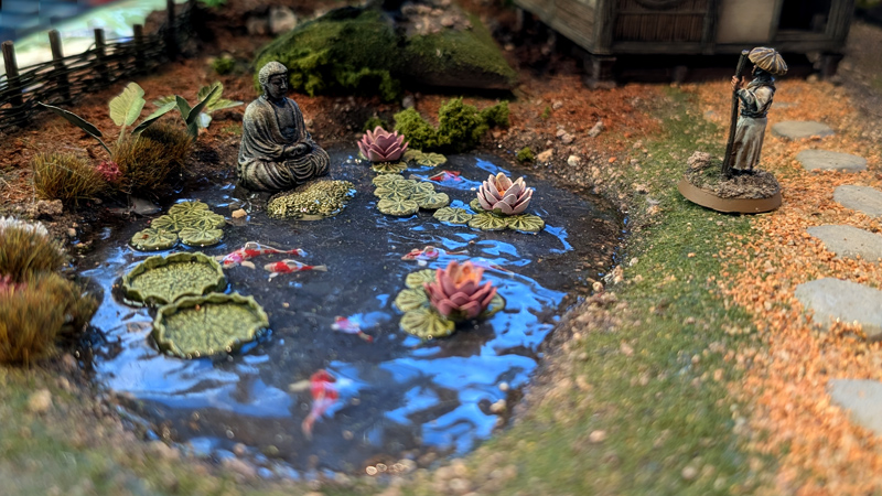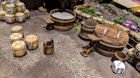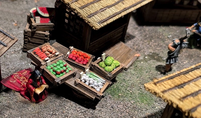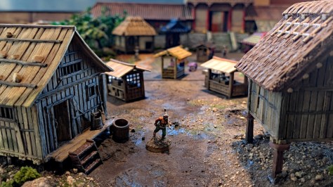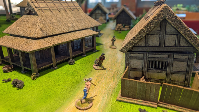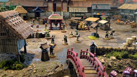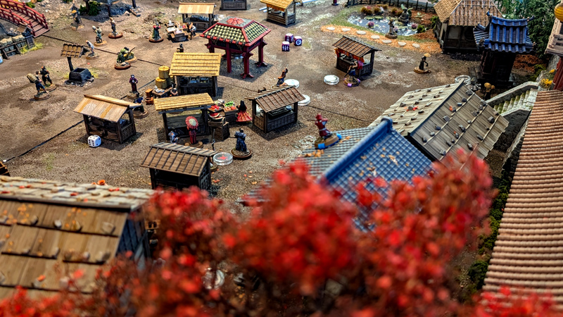 Philipp Kolhoff und Lukas Höppner schnappten sich das neue Regelwerk Guards of Traitor’s Toll von Graham Davey und verwandelten es kurzerhand in eine Samurai-Variante. Die Spielplatte stellte einen lebhaften Marktplatz in einer Stadt des feudalen Japans dar und das mit unzähligen kleinen Szenen, wie einer Sake-Brauerei, einen Sonnenschirmladen, einen klassischer Koi-Teich und natürlich jede Menge geschäftiges Treiben. Das Szenario spielte in der Hafenstadt Ajiro. Der örtliche Daimyō hatte beschlossen, auf alle Waren saftige Zölle zu erheben, eine Entscheidung, die bei Händlern ungefähr so beliebt ist wie eine Steuerprüfung. Entsprechend brodelte es auf dem Marktplatz. Händler schimpften, Kunden stritten, Taschendiebe nutzten die Gelegenheit, und der Sake-Konsum trug auch nicht unbedingt zur Deeskalation bei. Die Spieler übernahmen die Rolle der Samurai-Stadtwache, deren Aufgabe es war, Ordnung ins Chaos zu bringen. Oder zumindest so zu tun, als hätten sie die Situation im Griff.