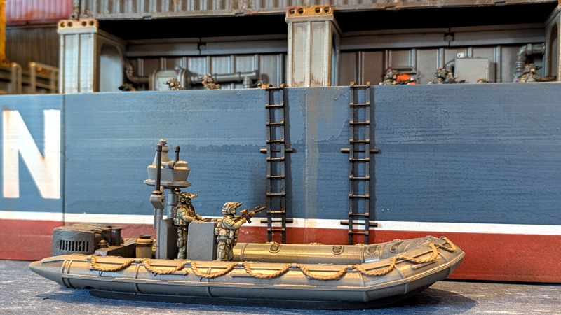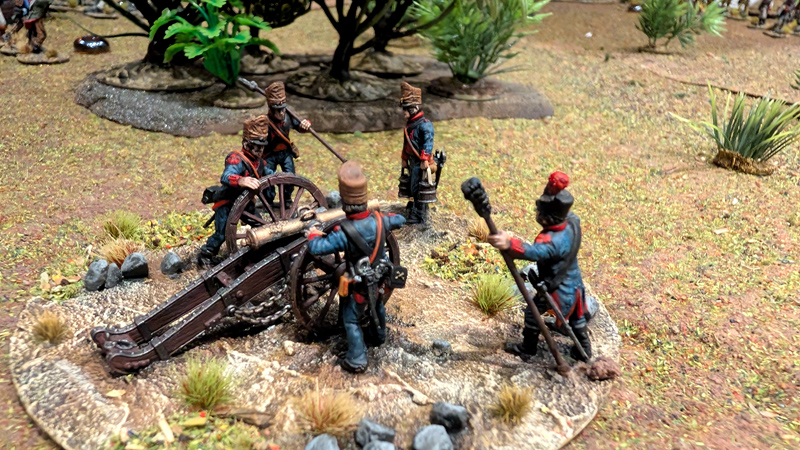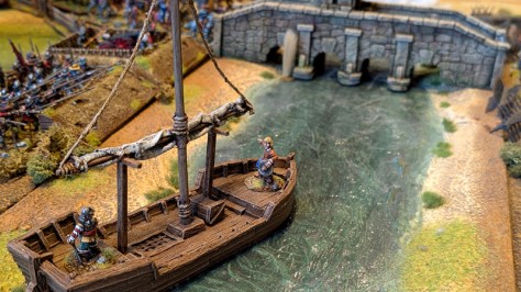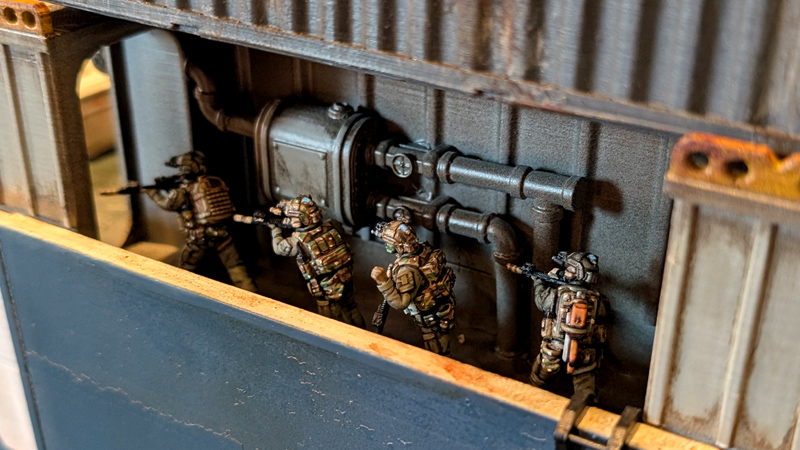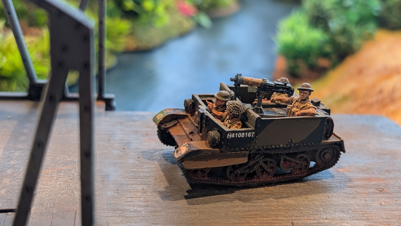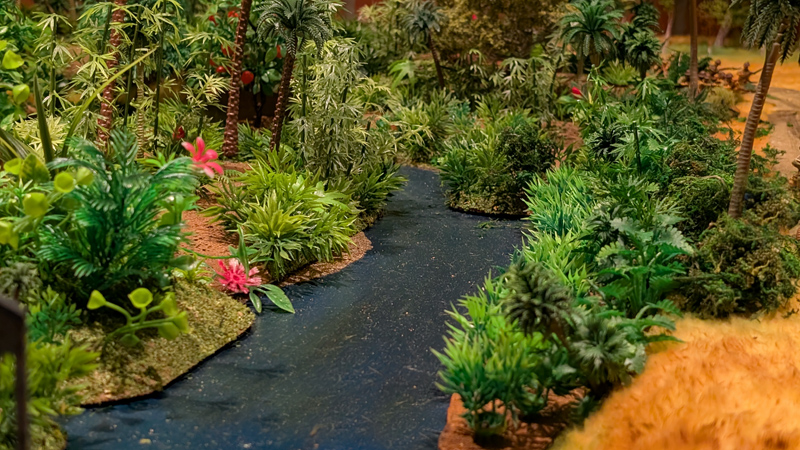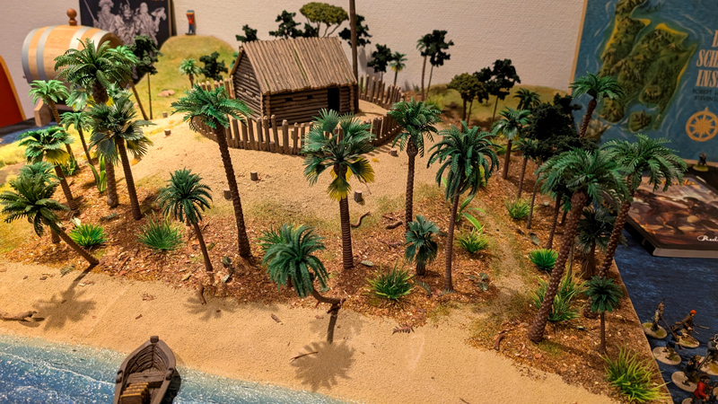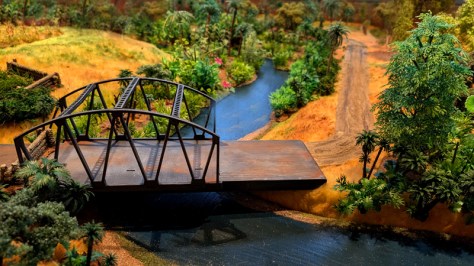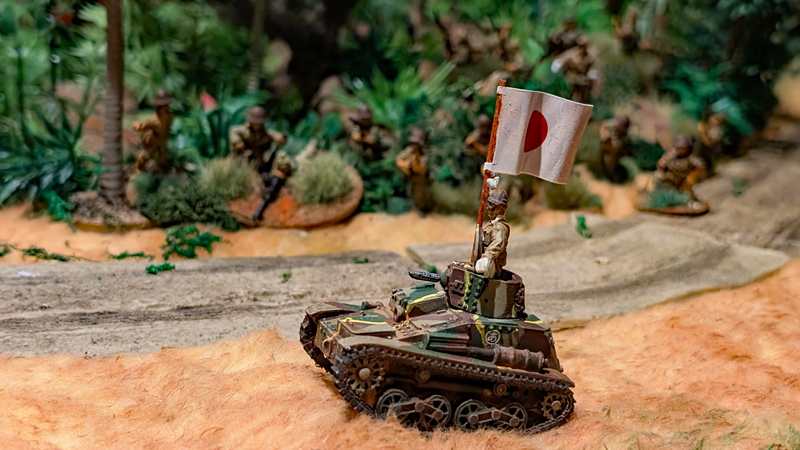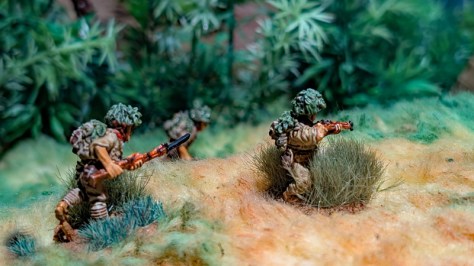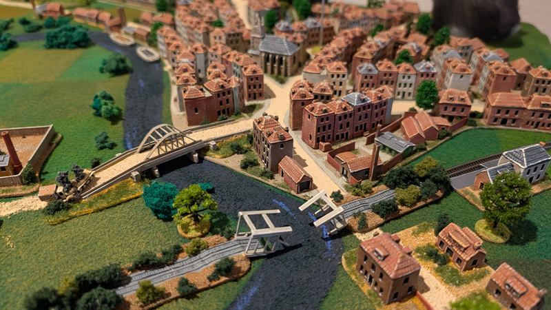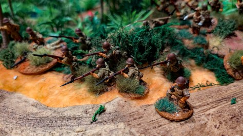 Der dritte TACTICA-Neuling war Eltjo Verweij vom Amsterdam6shooters Wargame Club, der sich mit dem ungewöhnlichen Thema „Timor 1942“ beschäftigte. Nachdem die Japaner 1942 innerhalb weniger Tage Westtimor und Osttimor erobert hatten, begannen überlebende alliierte Einheiten gemeinsam mit der lokalen Bevölkerung einen erbitterten Guerillakrieg. Die Spielplatte zeigte ein dichtes Dschungelgelände, durchzogen von einem Fluss mit einer zentralen Brücke, dem strategischen Dreh- und Angelpunkt der Partie. Gespielt wurde mit der zweiten Edition der Chain-of-Command-Regeln. Atmosphäre? Jede Menge. Man konnte beim Zuschauen fast die Luftfeuchtigkeit spüren.