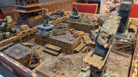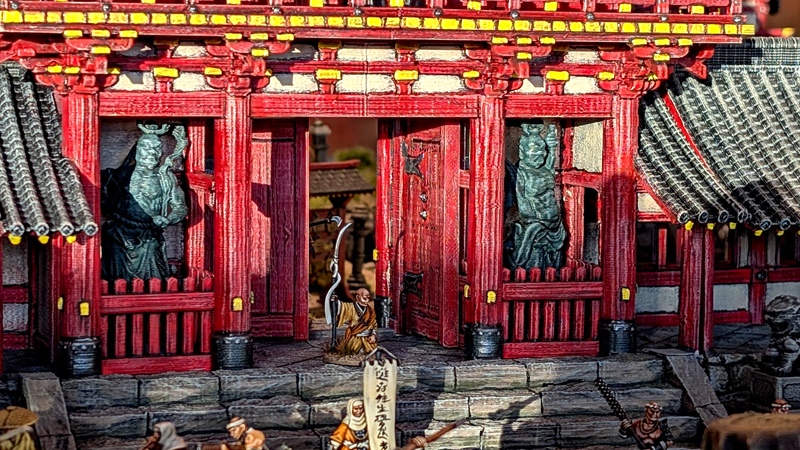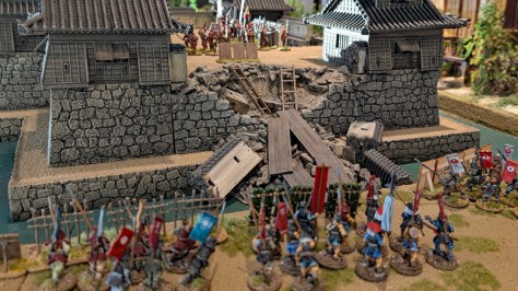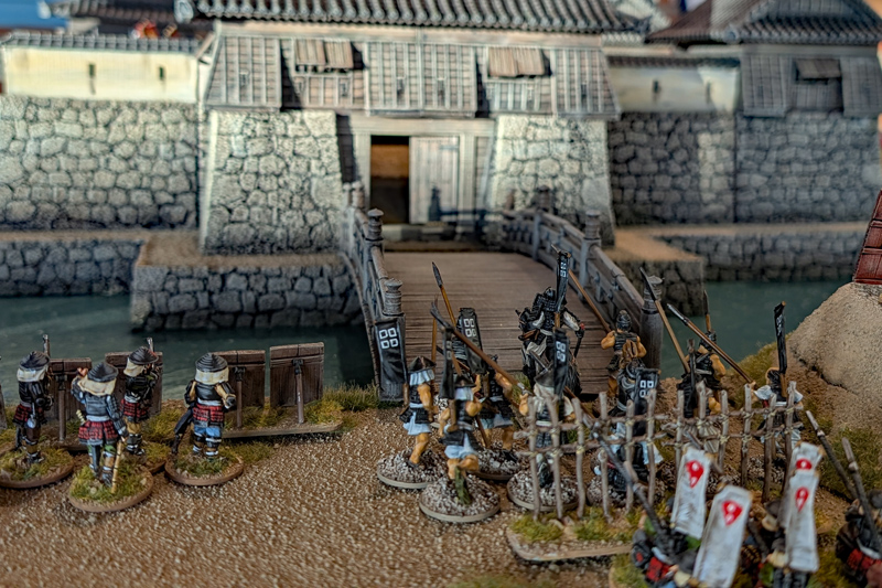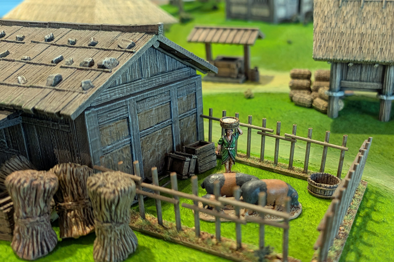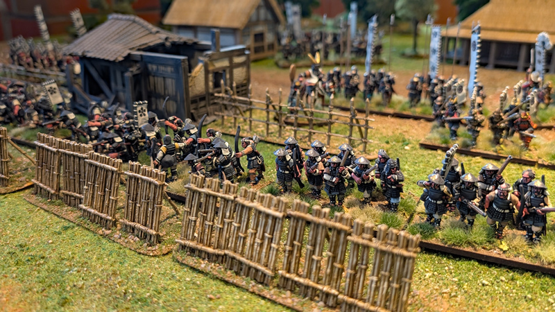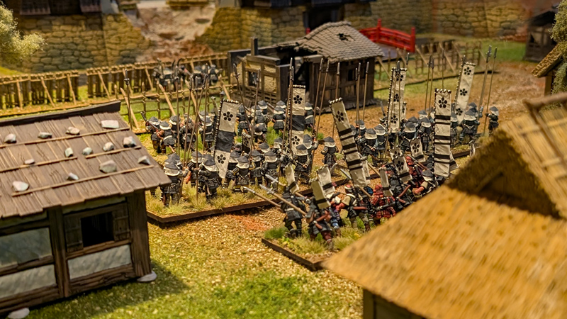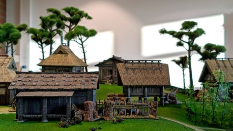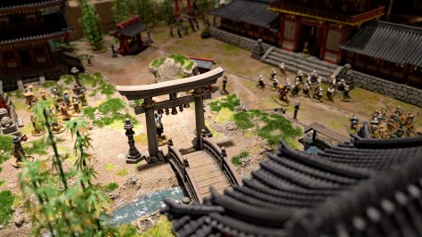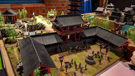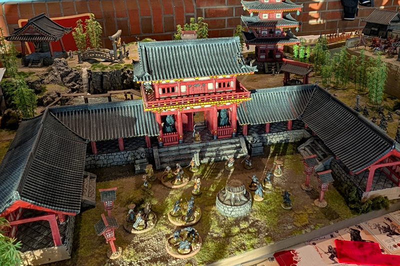 Zusammen mit meinen langjährigen Hobby-Freunden Vasa, Gunnar und Björn hatte ich in diesem Jahr gleich drei Skirmish-Spielplatten vorbereitet. Gunnar präsentierte eine großartige Platte zum Thema „Die Sieben Samurai“ und betreute sie unermüdlich als Spielleiter, vermutlich mit mehr Geduld, als ein echter Samurai im Einsatz gehabt hätte. Ich selbst brachte einen Tempel und ein Burggelände mit, die von Björn und Vasa betreut wurden. Vasa – der bereits mehr als ein halbes Dutzend Samurai-Platten präsentiert hat – hatte außerdem seine beeindruckende Figurensammlung dabei. Mein Dank und ein dickes Kompliment an die drei, die mit Sicherheit zu den besten Tabletop-Allroundern Deutschlands zählen.