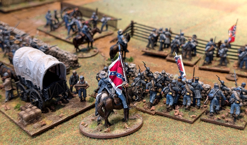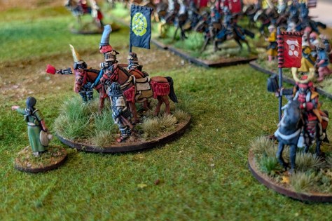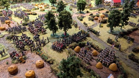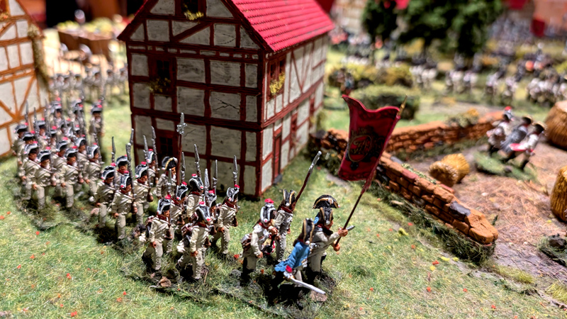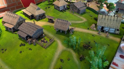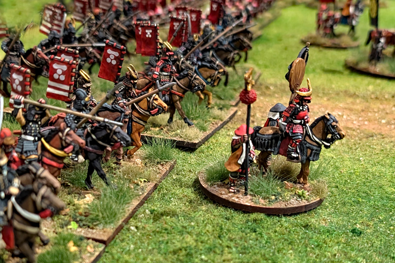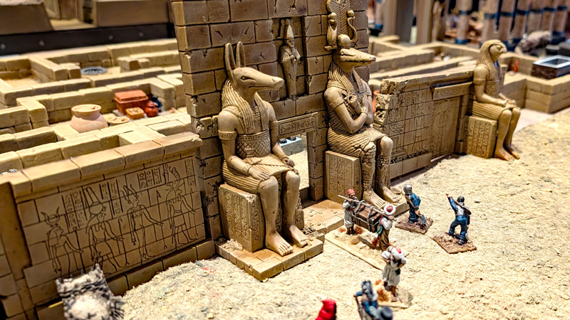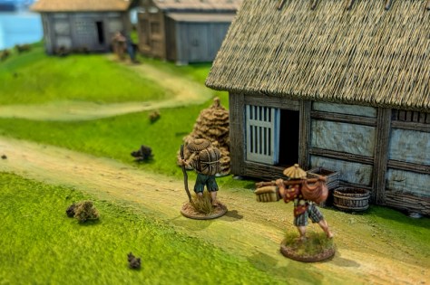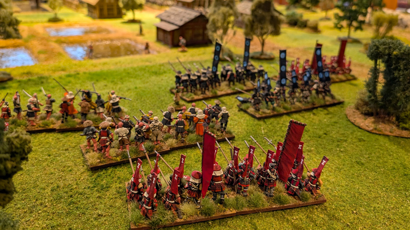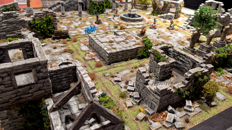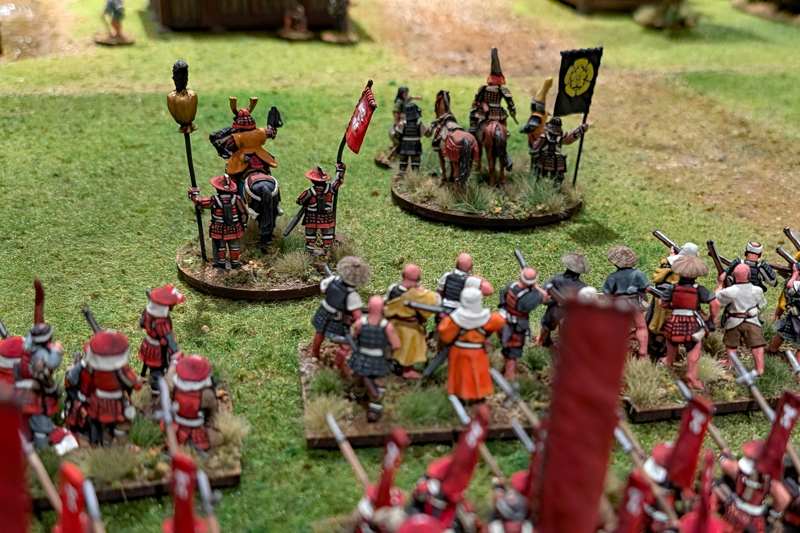 Zusammen mit meinen langjährigen Hobby-Freunden Vasa, Gunnar und Björn hatte ich in diesem Jahr gleich drei Skirmish-Spielplatten vorbereitet. Gunnar präsentierte eine großartige Platte zum Thema „Die Sieben Samurai“ und betreute sie unermüdlich als Spielleiter, vermutlich mit mehr Geduld, als ein echter Samurai im Einsatz gehabt hätte. Ich selbst brachte einen Tempel und ein Burggelände mit, die von Björn und Vasa betreut wurden. Vasa – der bereits mehr als ein halbes Dutzend Samurai-Platten präsentiert hat – hatte außerdem seine beeindruckende Figurensammlung dabei. Mein Dank und ein dickes Kompliment an die drei, die mit Sicherheit zu den besten Tabletop-Allroundern Deutschlands zählen.