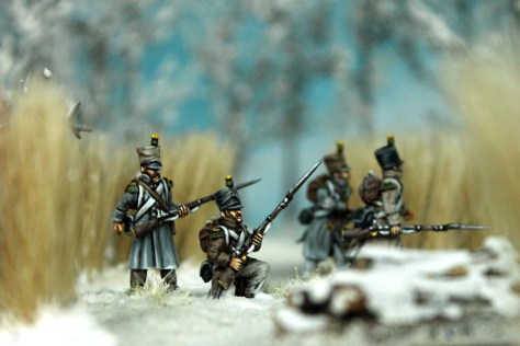 Bei den Plänklern sind die Optionen allerdings etwas eingeschränkter. Aufgrund der dargestellten Ladevorgänge ergeben sich hier naturgemäß weniger Möglichkeiten. Ich hätte die Plänkler allerdings alle stehend gestaltet (es gibt eine kniende Figur), wodurch auch eine Feuerlinie möglich gewesen wäre, denn nicht in allen Spielsystemen werden separate Plänkler benötigt.