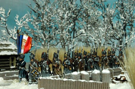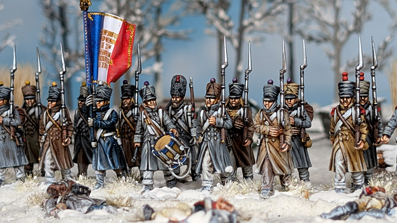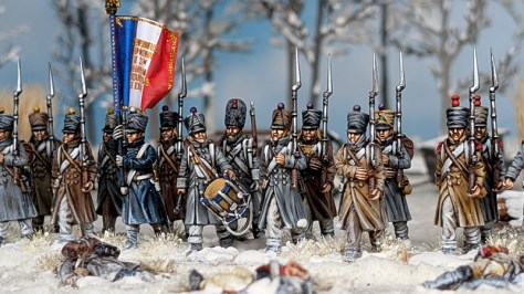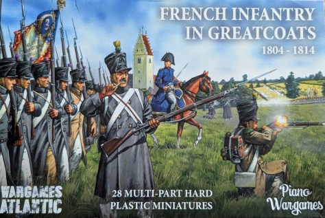Dieses erste Set, das in Zusammenarbeit mit Wargames Atlantic entstanden ist, heißt „French Infantry in Greatcoats 1804–1814“. Es gibt zwar bereits ein Set französischer Plastikfiguren im Mantel von Warlord Games, diese sind allerdings vom Design her etwas „old school“ und nicht unbedingt „my cup of tea“, wie der Engländer sagt. Zudem enthält dieses Set nur einfache Soldaten, also keine Kommando-Gruppe. Franzosen im Mantel sind auch im älteren Perry-Gussrahmen der „French Infantry“ enthalten, allerdings nur in geringer Zahl und ebenfalls ohne Kommando-Gruppe im Mantel.