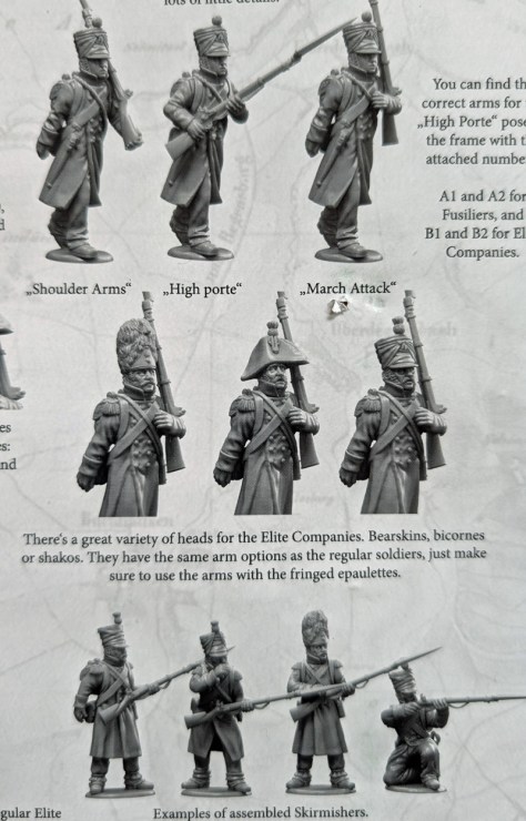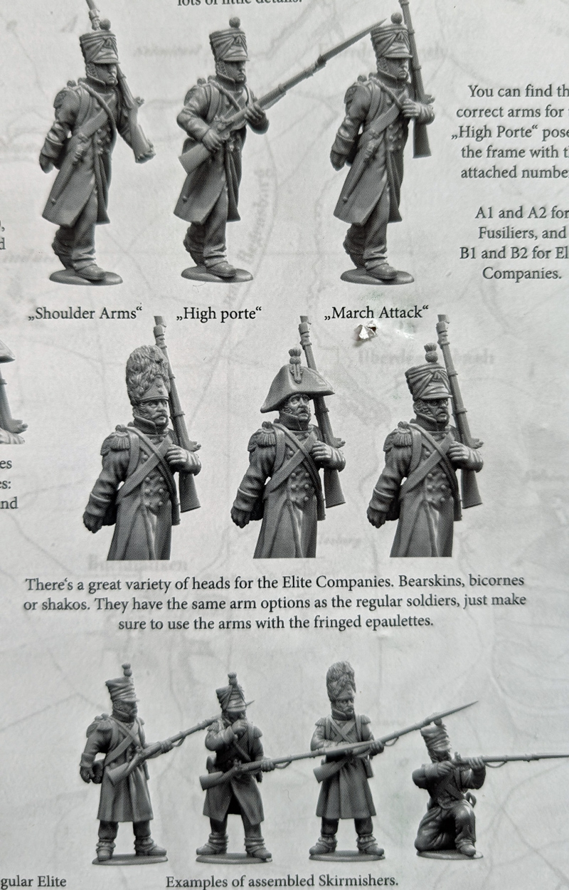 Neben dem Gussrahmen für die Mannschaften gibt es den bereits erwähnten Kommando-Gussrahmen sowie einen weiteren mit Plänklern. Auch hier werden einige Optionen geboten. So lässt sich der Trommler durch zwei Paar separate Arme in verschiedenen Varianten darstellen. Die Fahnenstange kann mit zwei unterschiedlichen Endstücken, entweder mit Adler oder mit Speerspitze versehen werden, wodurch sowohl Regiments- als auch Bataillonsfahnen dargestellt werden können. Es gibt zusätzliche Arme für Unteroffiziere sowie gleich drei verschiedene Arme mit Degen für den Offizier.